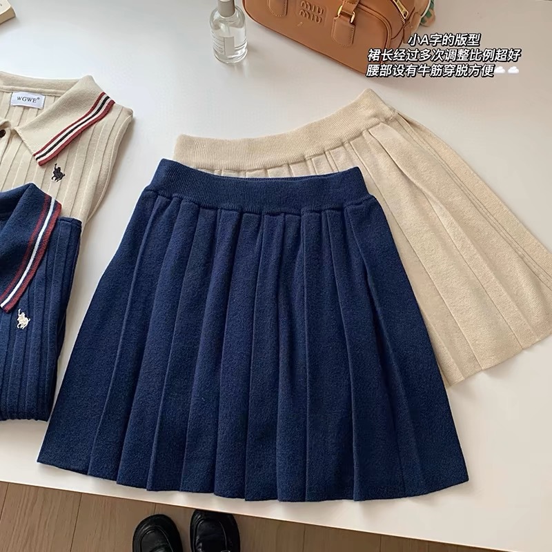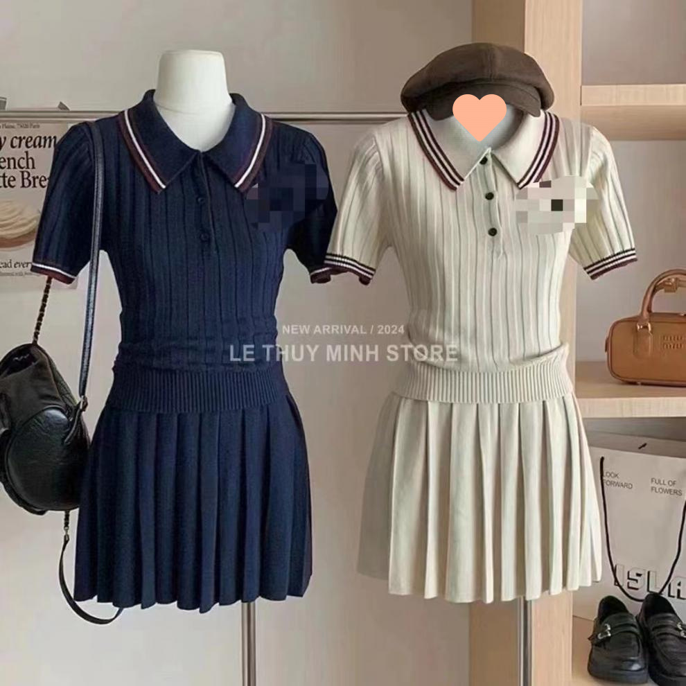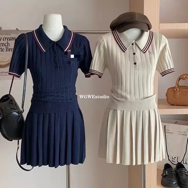13 라인 딸 골드 학업 스타일 콘트라스트 스트라이프 짧은 소매 탑 주름 치마 니트 스커트 투피스 세트