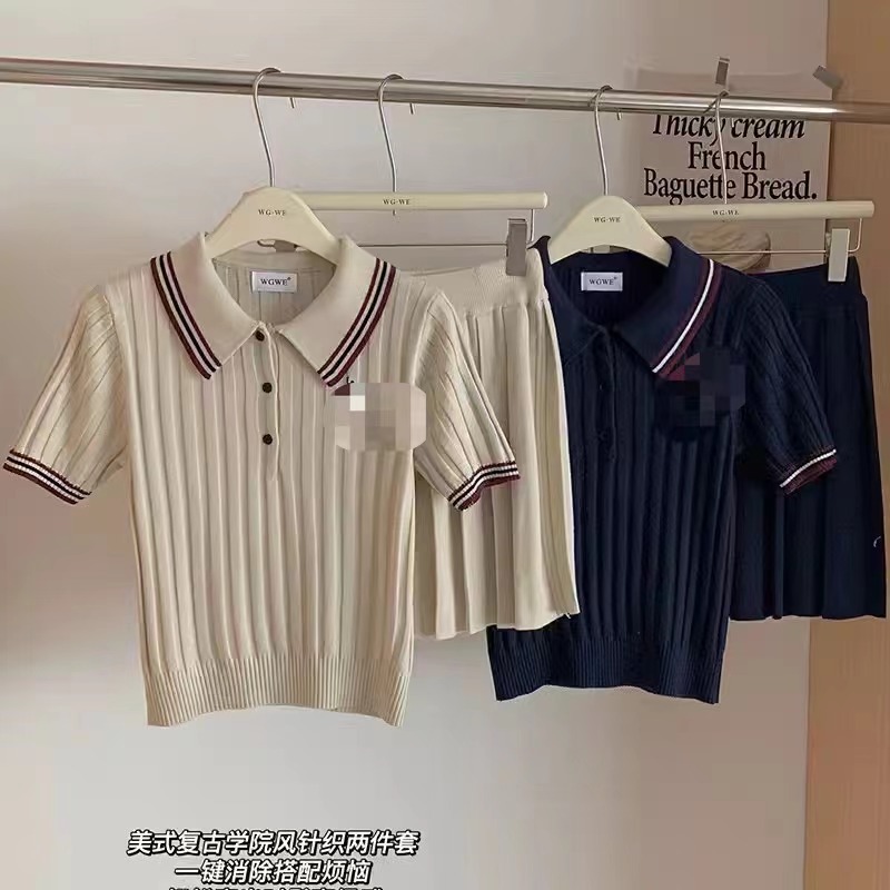 13 라인 딸 골드 학업 스타일 콘트라스트 스트라이프 짧은 소매 탑 주름 치마 니트 스커트 투피스 세트스토어 가기