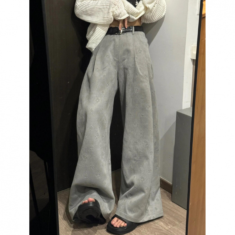 빈티지 새로운 디자인 자카드 그레이 스타일 세트 캐주얼 바지를 입고 여성의 느슨한 더미 넓은 다리 바지스토어 가기