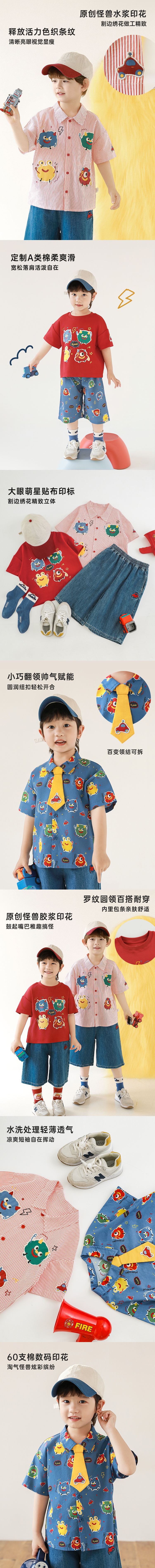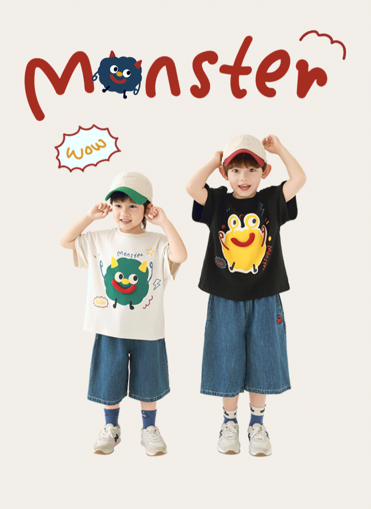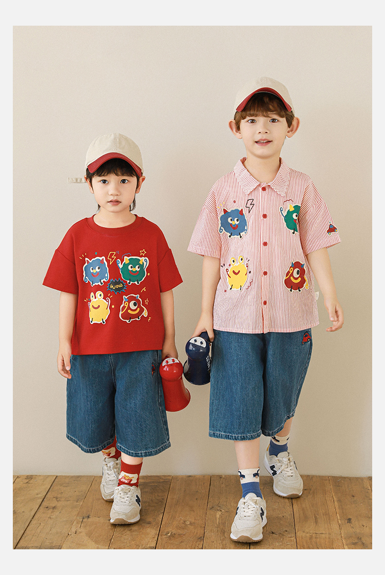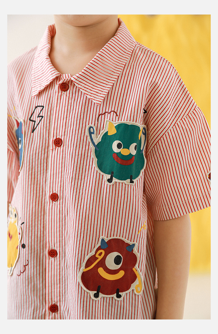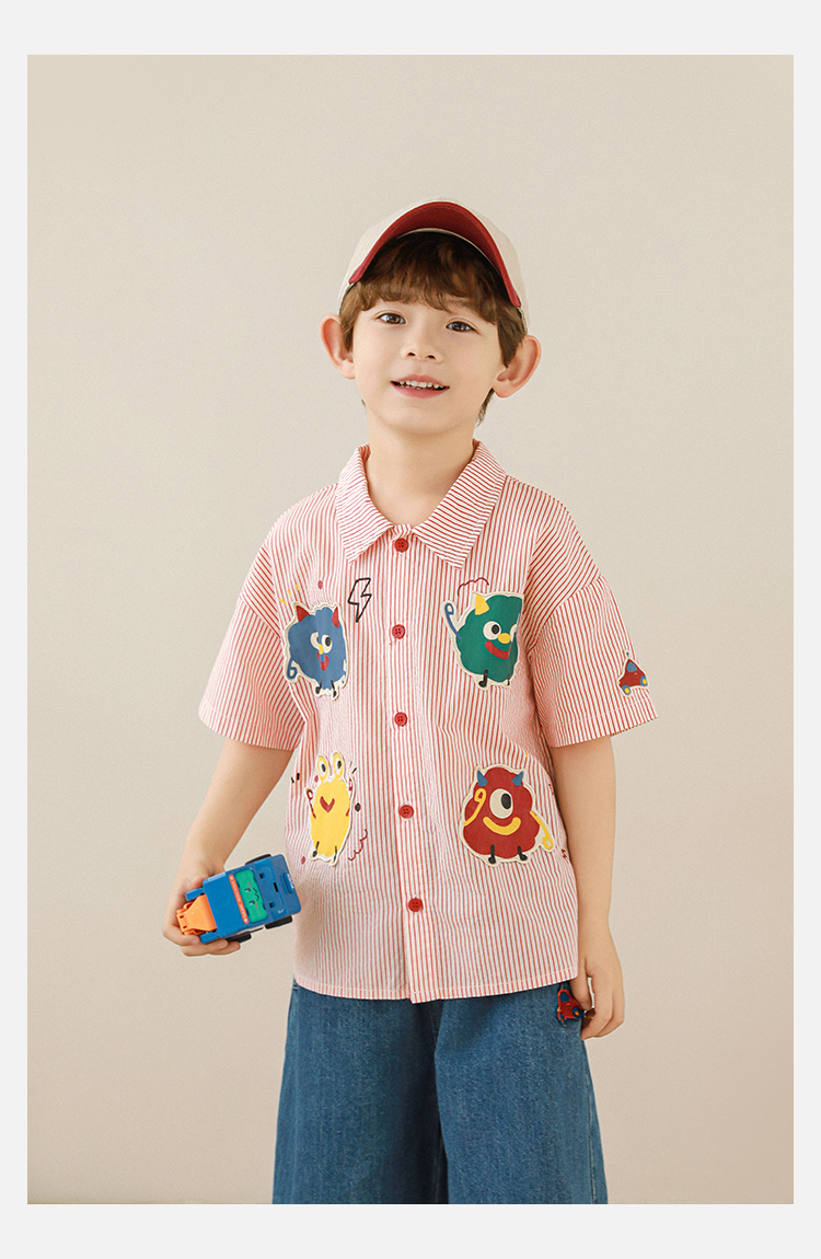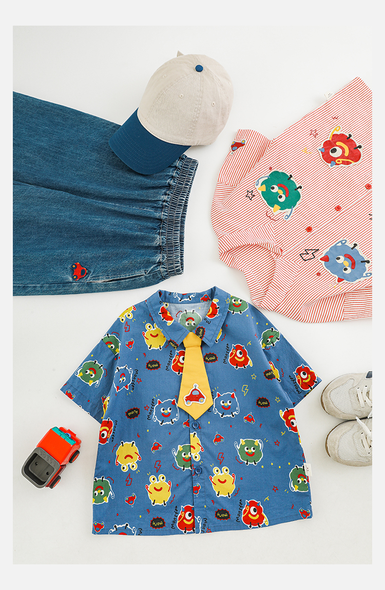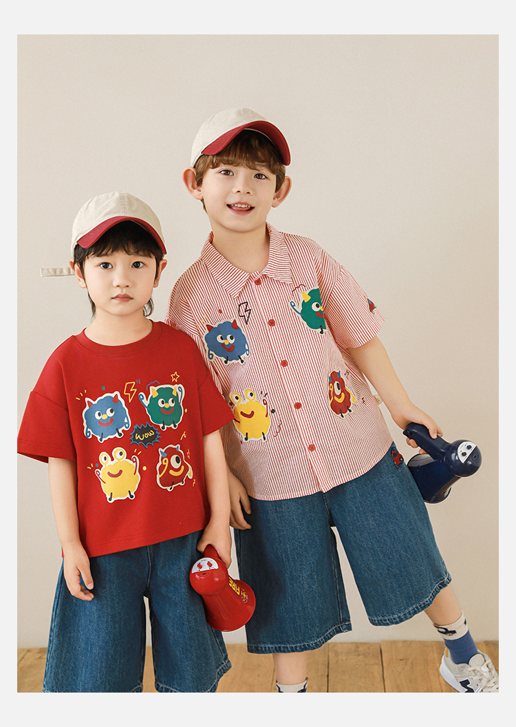 Wurib a boy 2025 새로운 반팔 크루 넥 몬스터 반팔 티셔츠 여름 느슨한 줄무늬 옷깃 셔츠