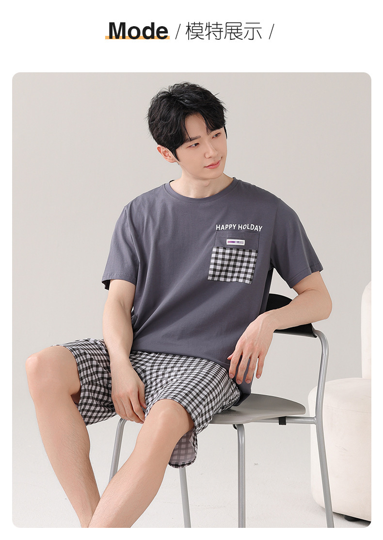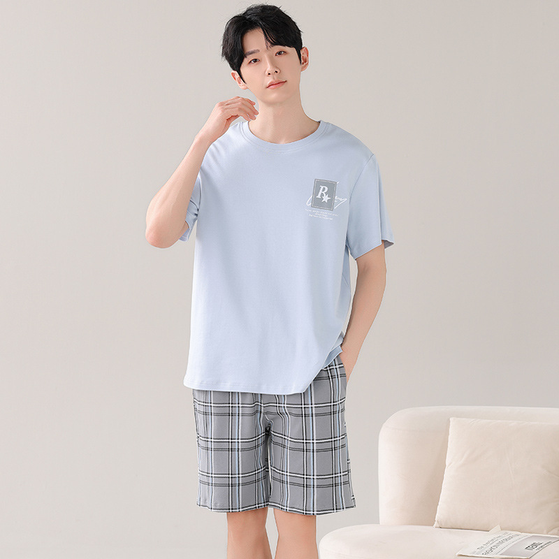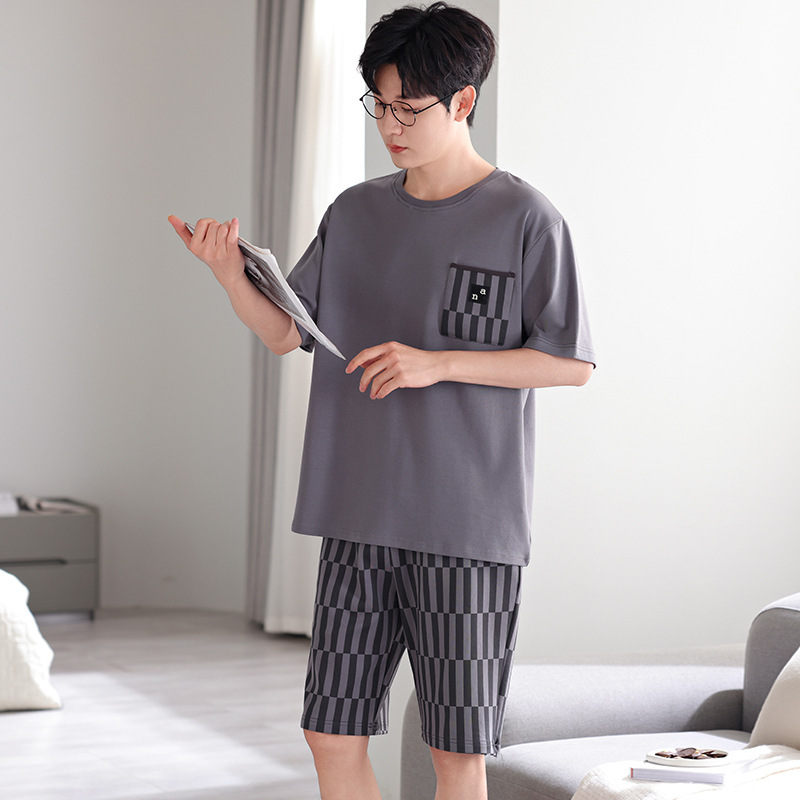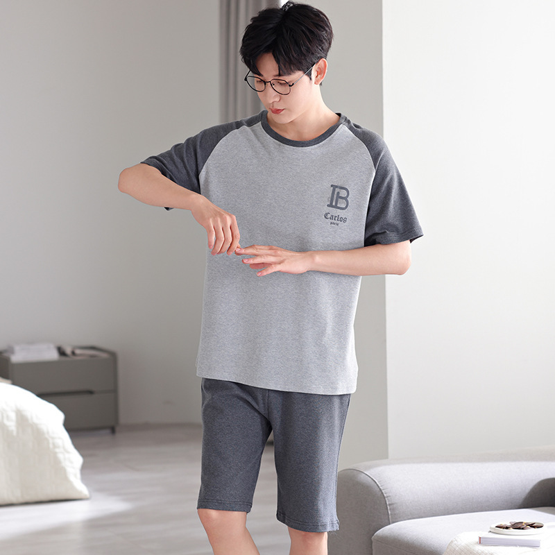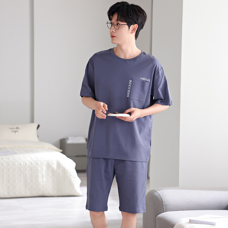 타이트한 경기 면 남자 잠옷 여름 얇은 둥근 목 짧은 소매 반바지 플러스 사이즈 홈 의류 세트 도매로 입을 수 있습니다.스토어 가기