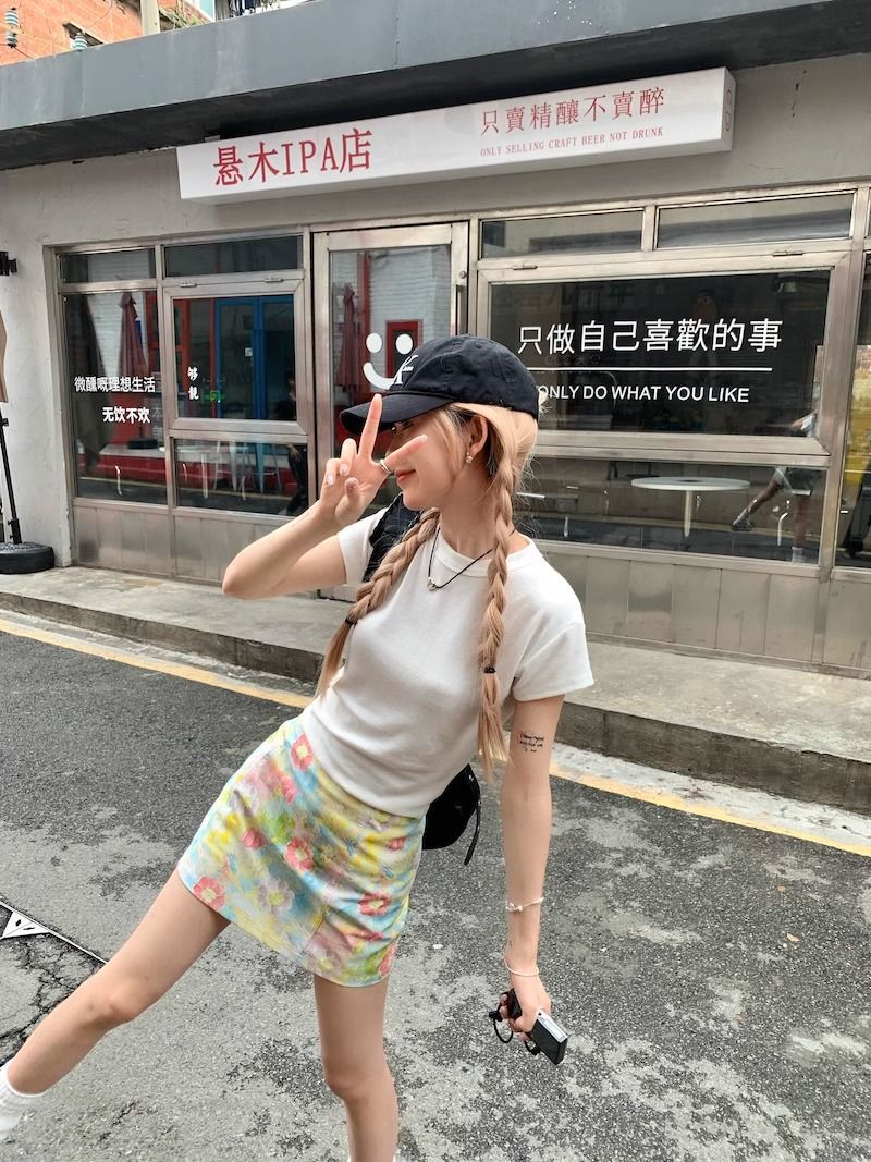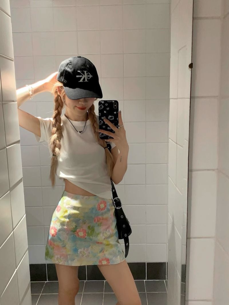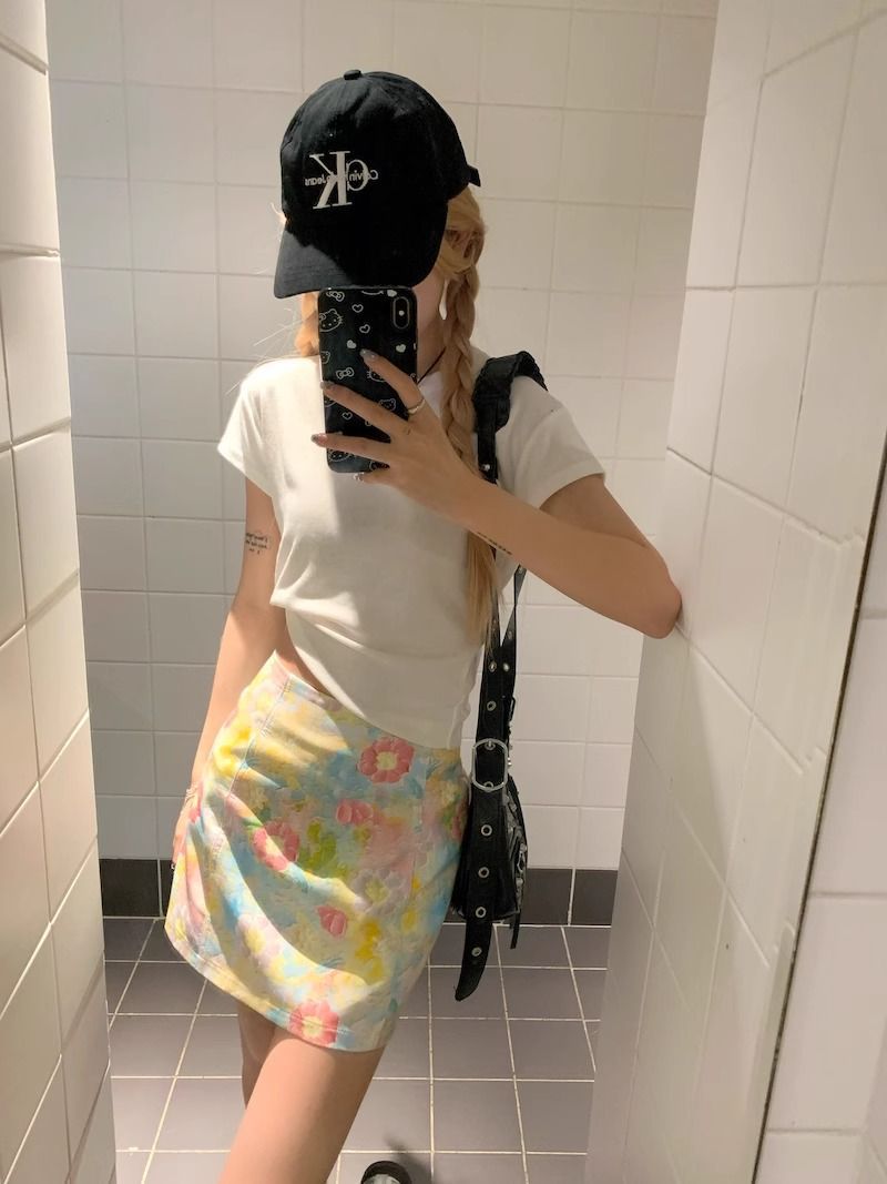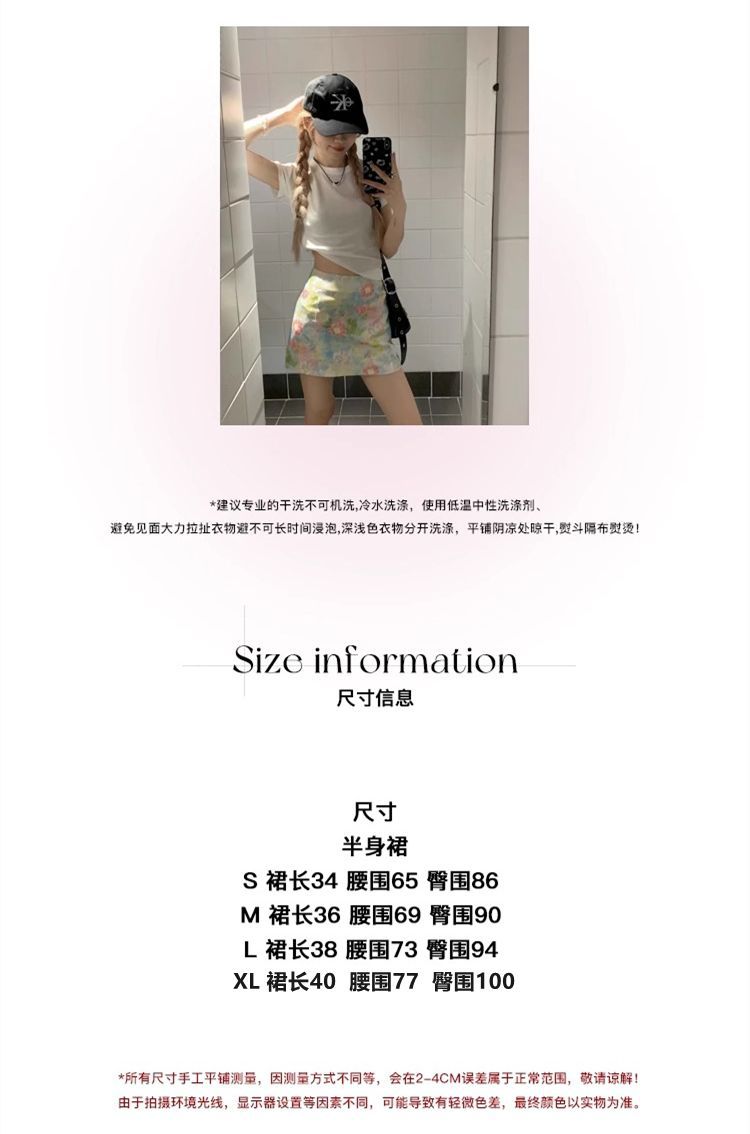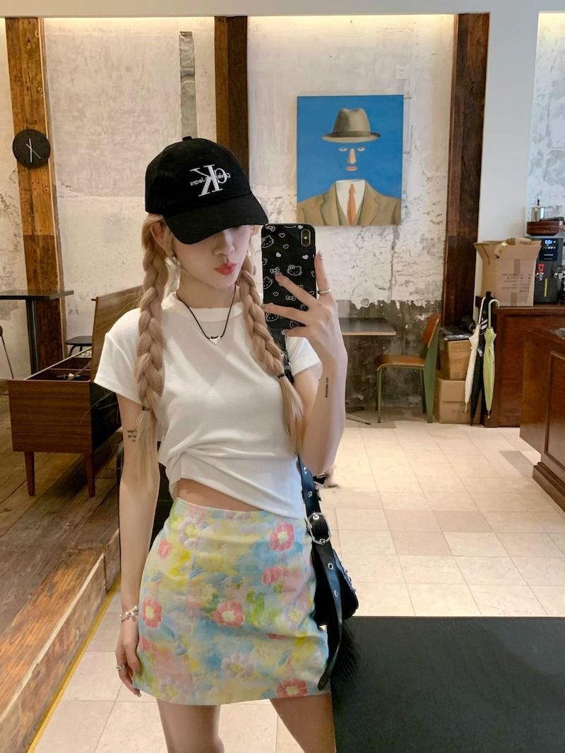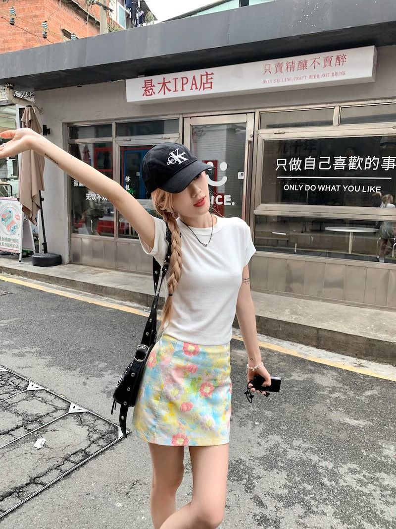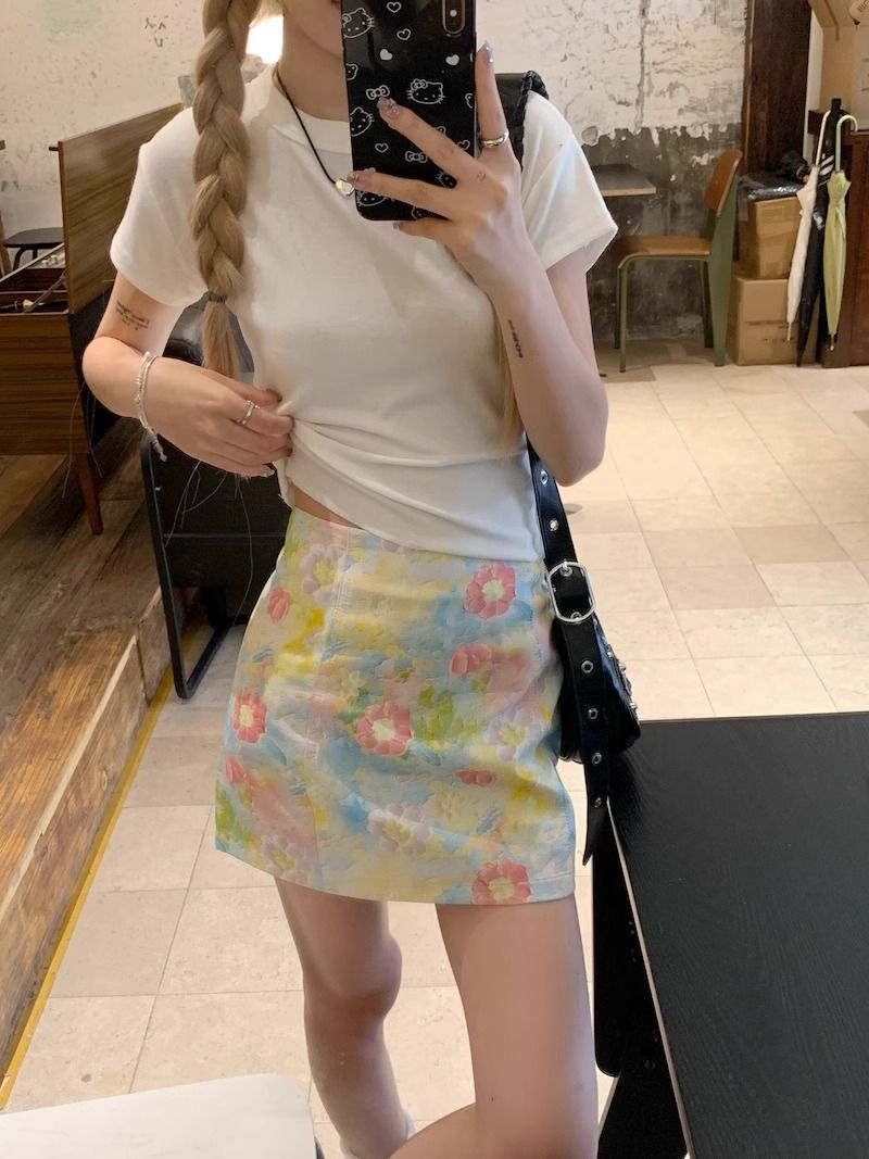 달콤하고 매운 스타일 세트 여성 여름 화이트 어깨 반팔 티셔츠 헤일로 플로랄 스커트 A 자형 힙합 스커트 투피스 세트스토어 가기