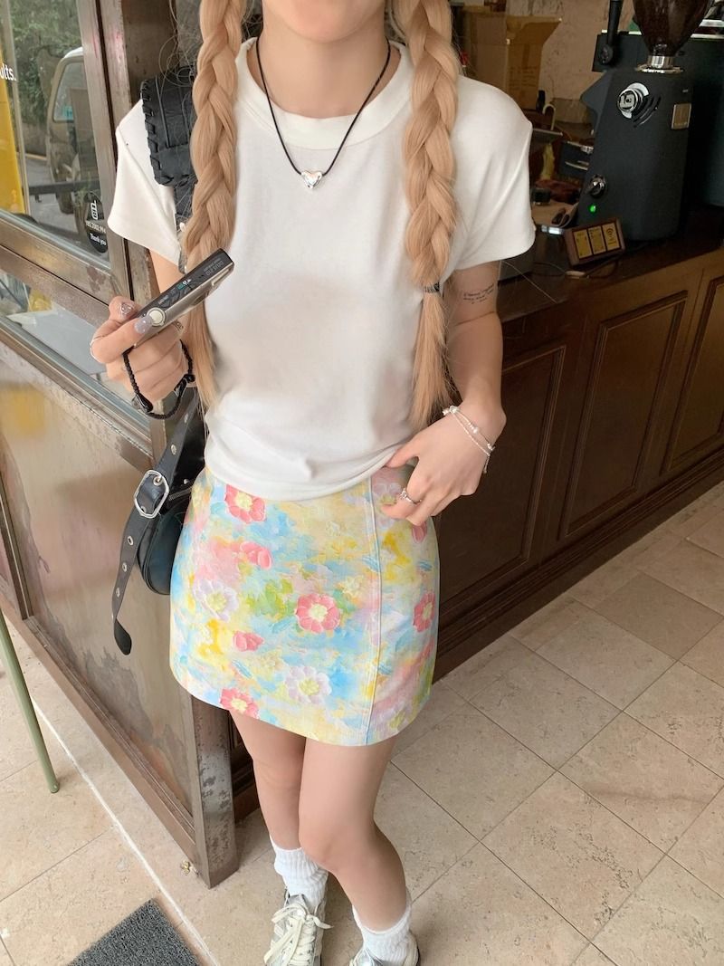 달콤하고 매운 스타일 세트 여성 여름 화이트 어깨 반팔 티셔츠 헤일로 플로랄 스커트 A 자형 힙합 스커트 투피스 세트