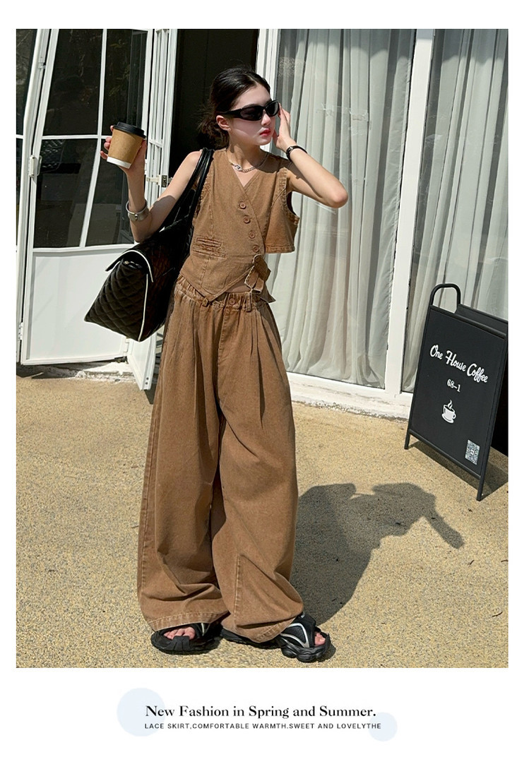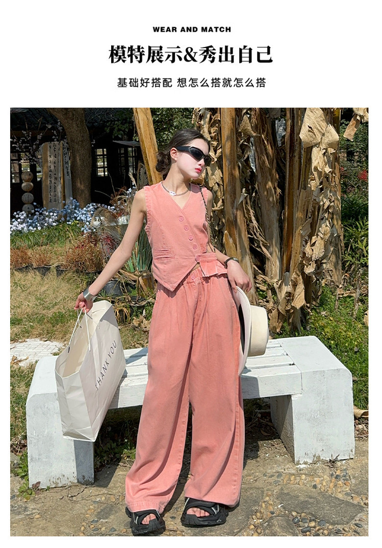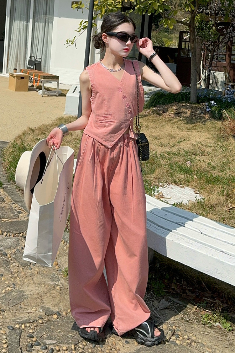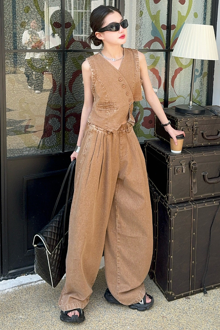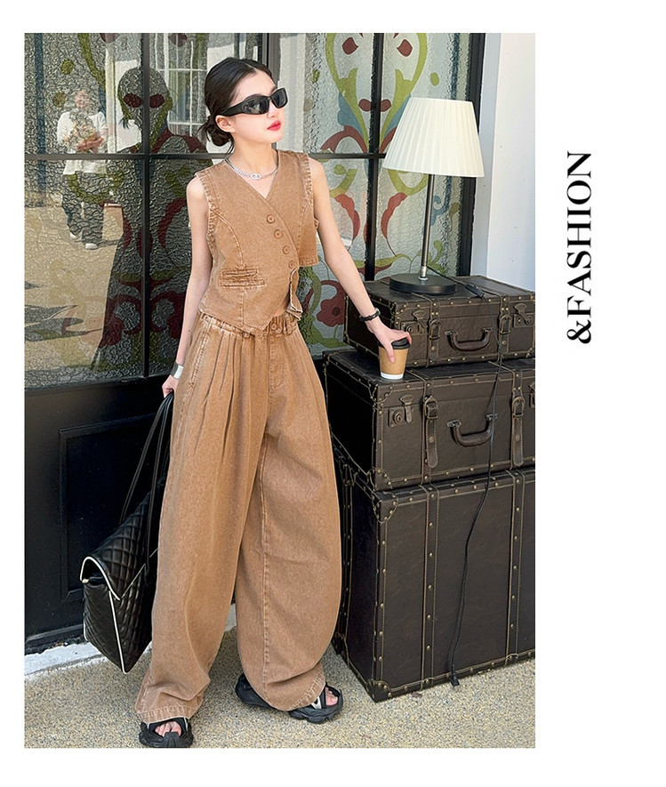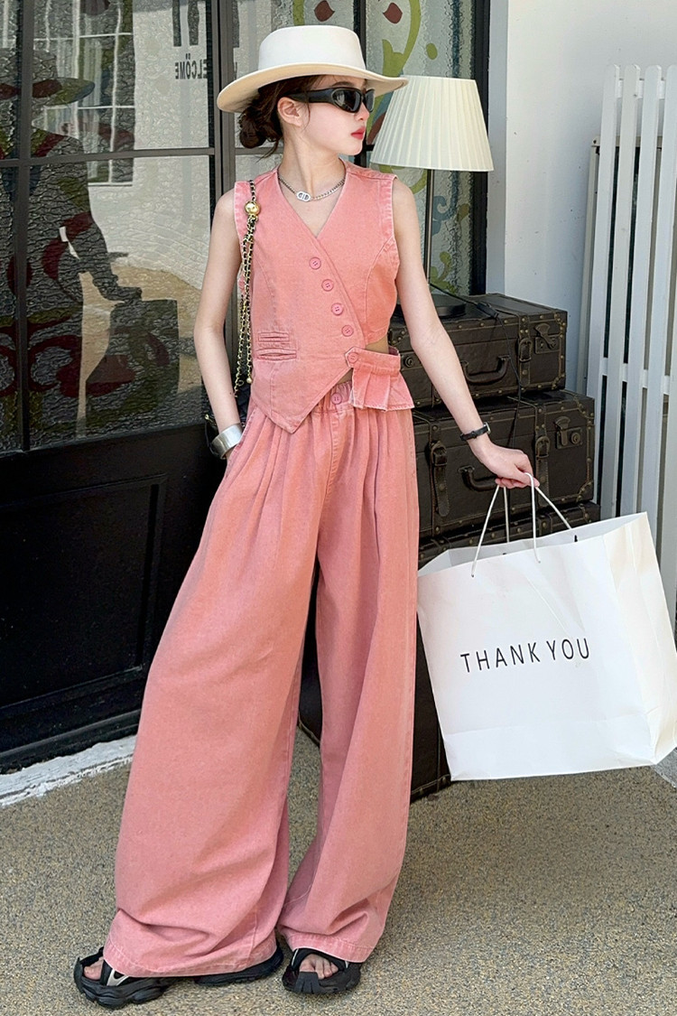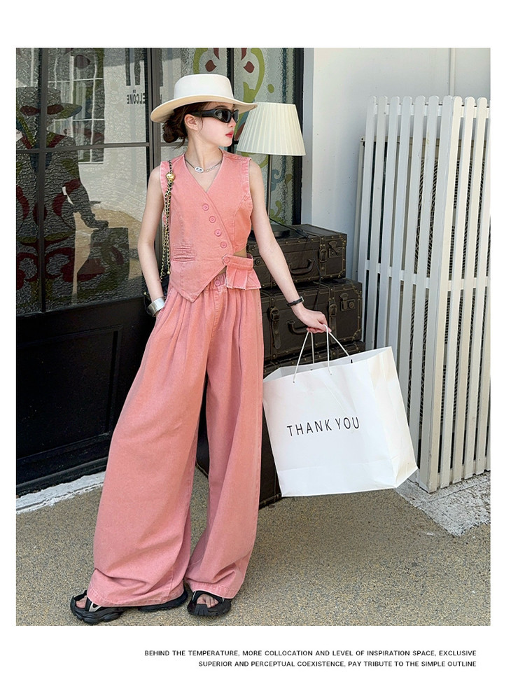 국경 간 소녀 여름 패션 소녀 데님 세트 여름 얇은 중대형 어린이 세련된 레이스 조끼 와이드 레그 바지