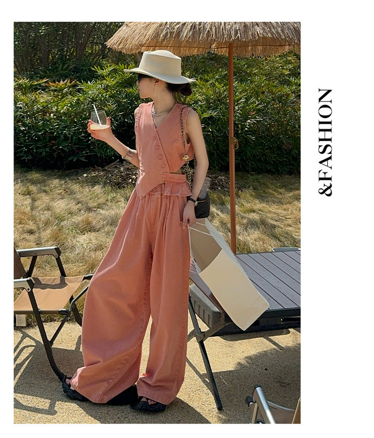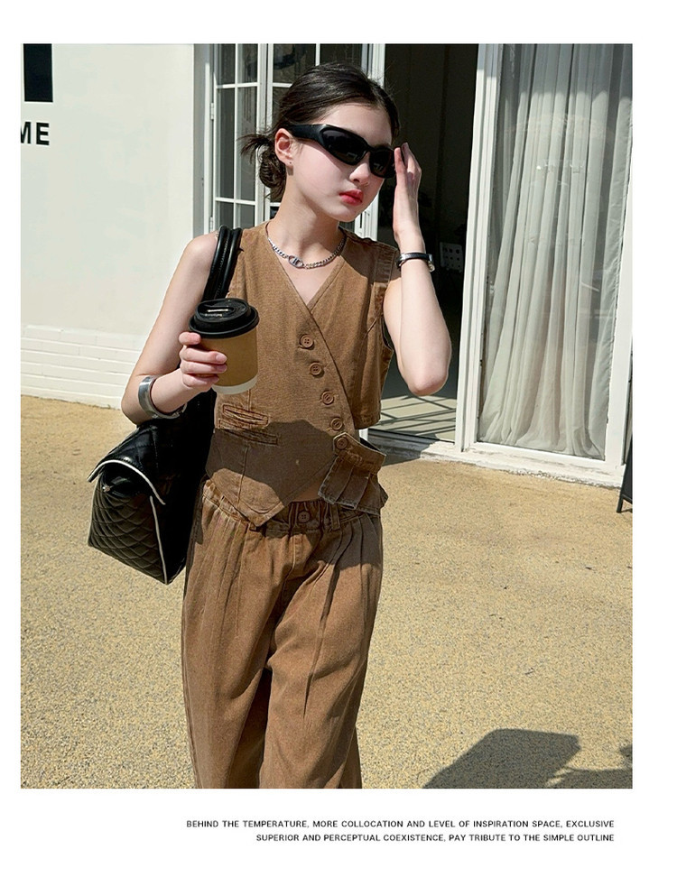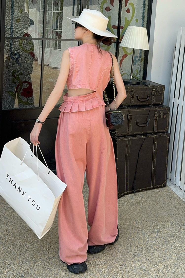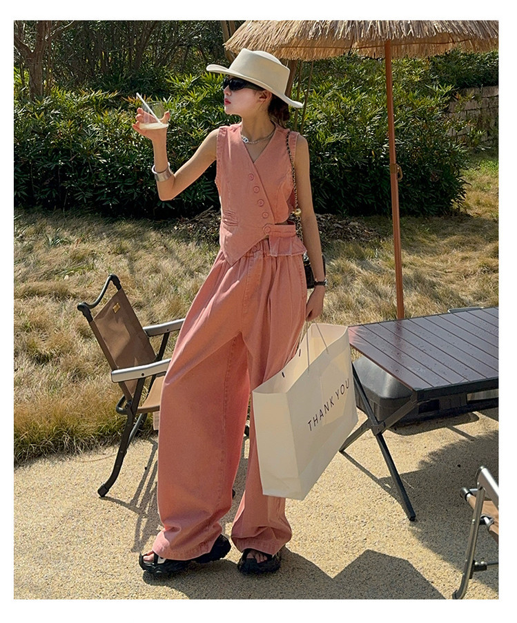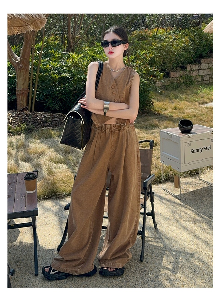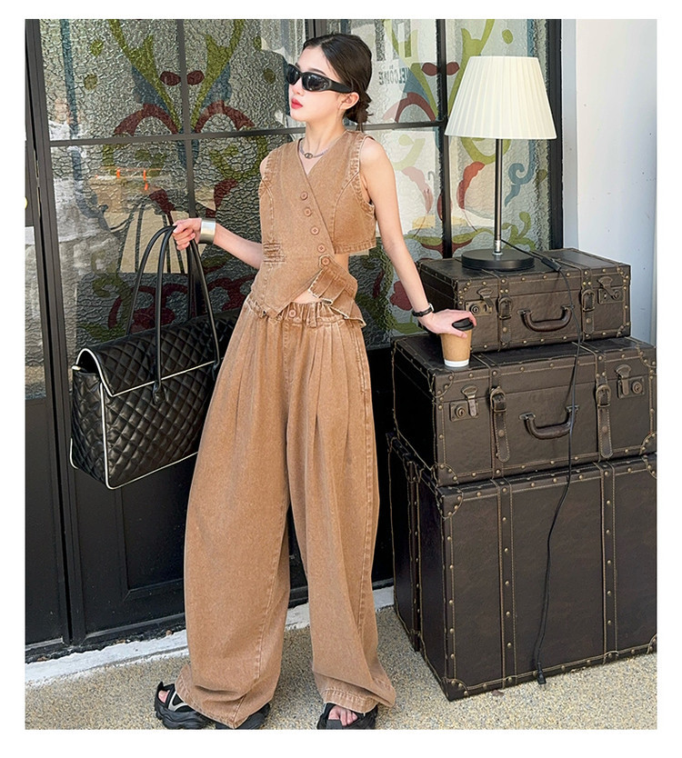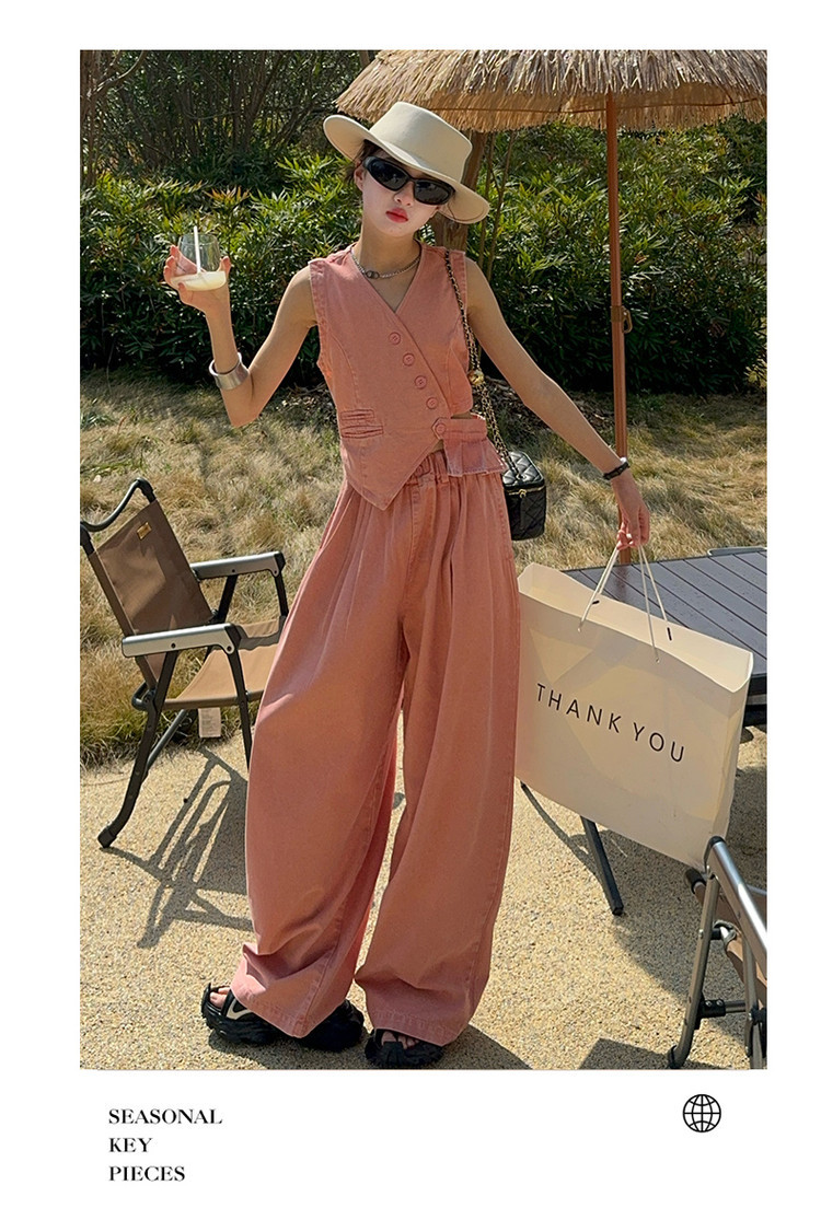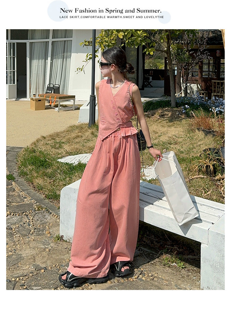 국경 간 소녀 여름 패션 소녀 데님 세트 여름 얇은 중대형 어린이 세련된 레이스 조끼 와이드 레그 바지