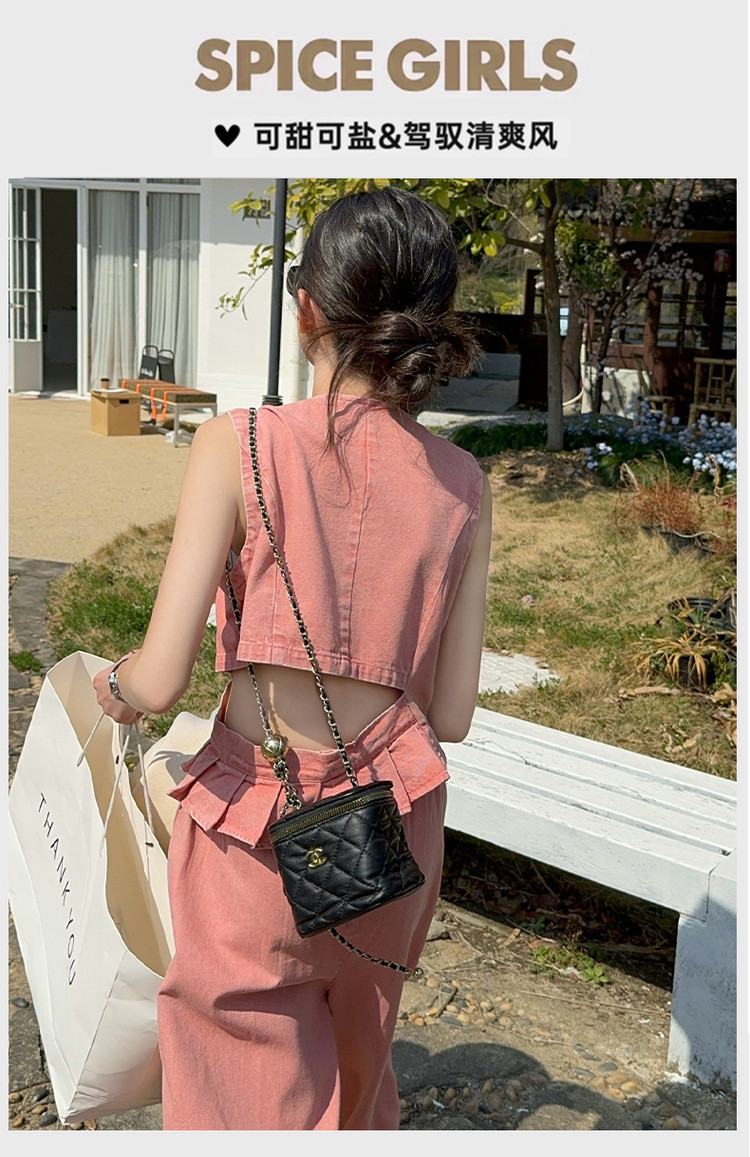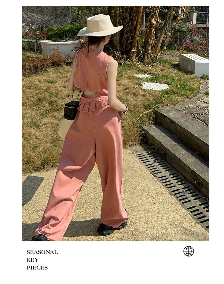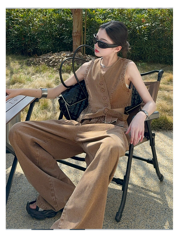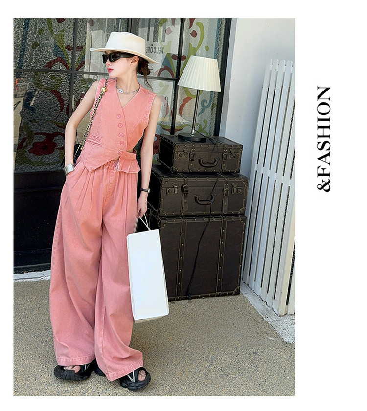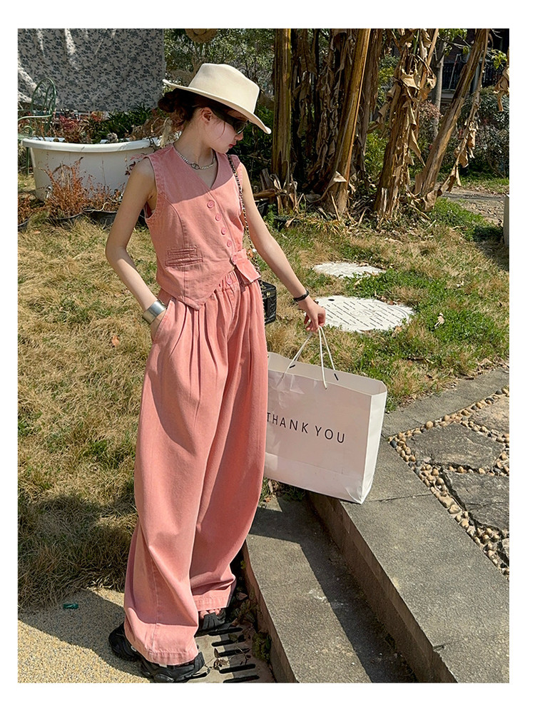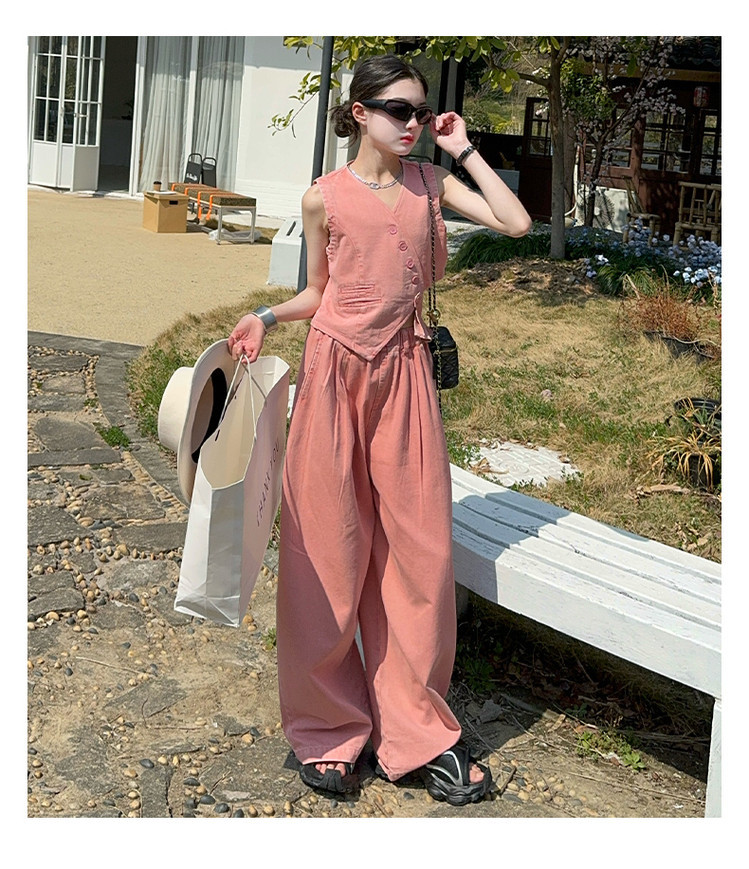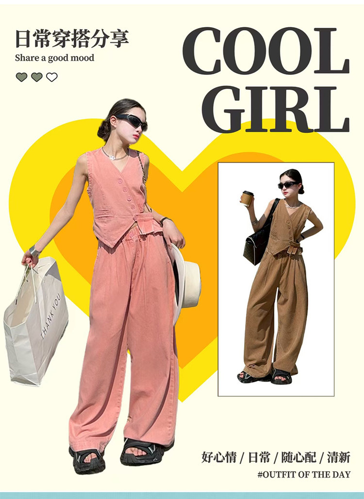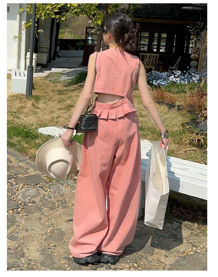 국경 간 소녀 여름 패션 소녀 데님 세트 여름 얇은 중대형 어린이 세련된 레이스 조끼 와이드 레그 바지