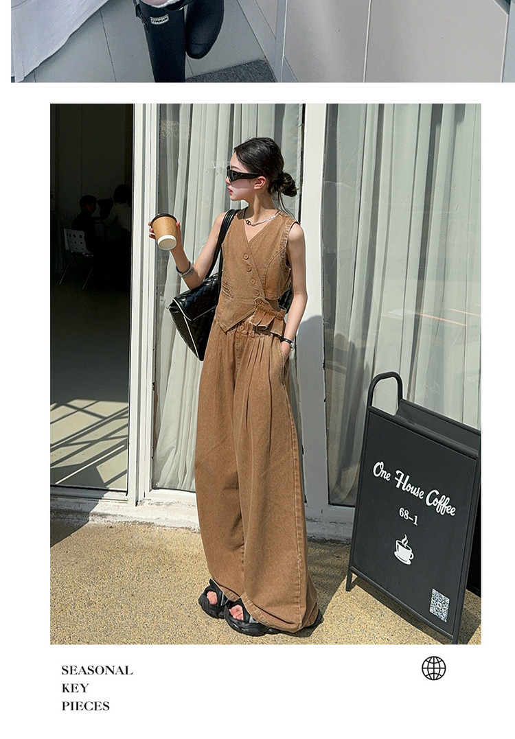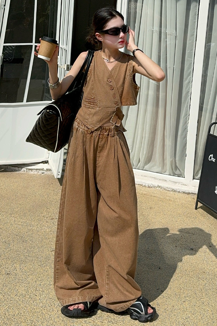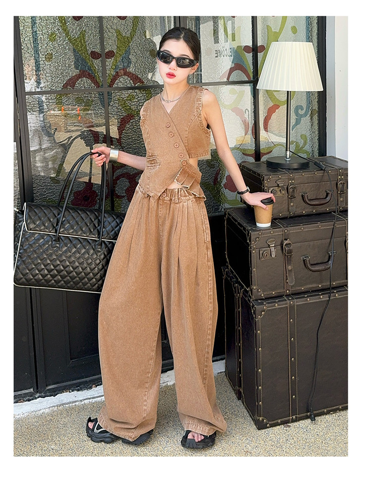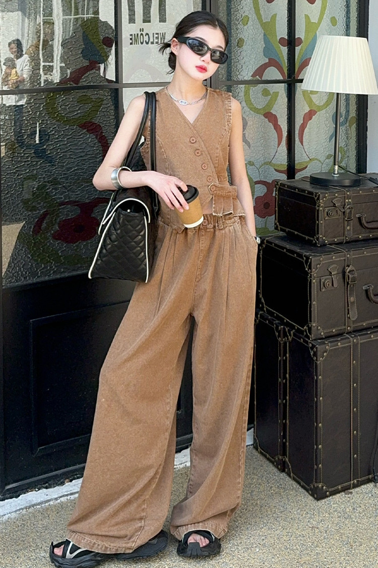 국경 간 소녀 여름 패션 소녀 데님 세트 여름 얇은 중대형 어린이 세련된 레이스 조끼 와이드 레그 바지스토어 가기