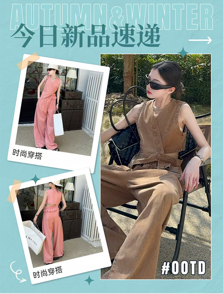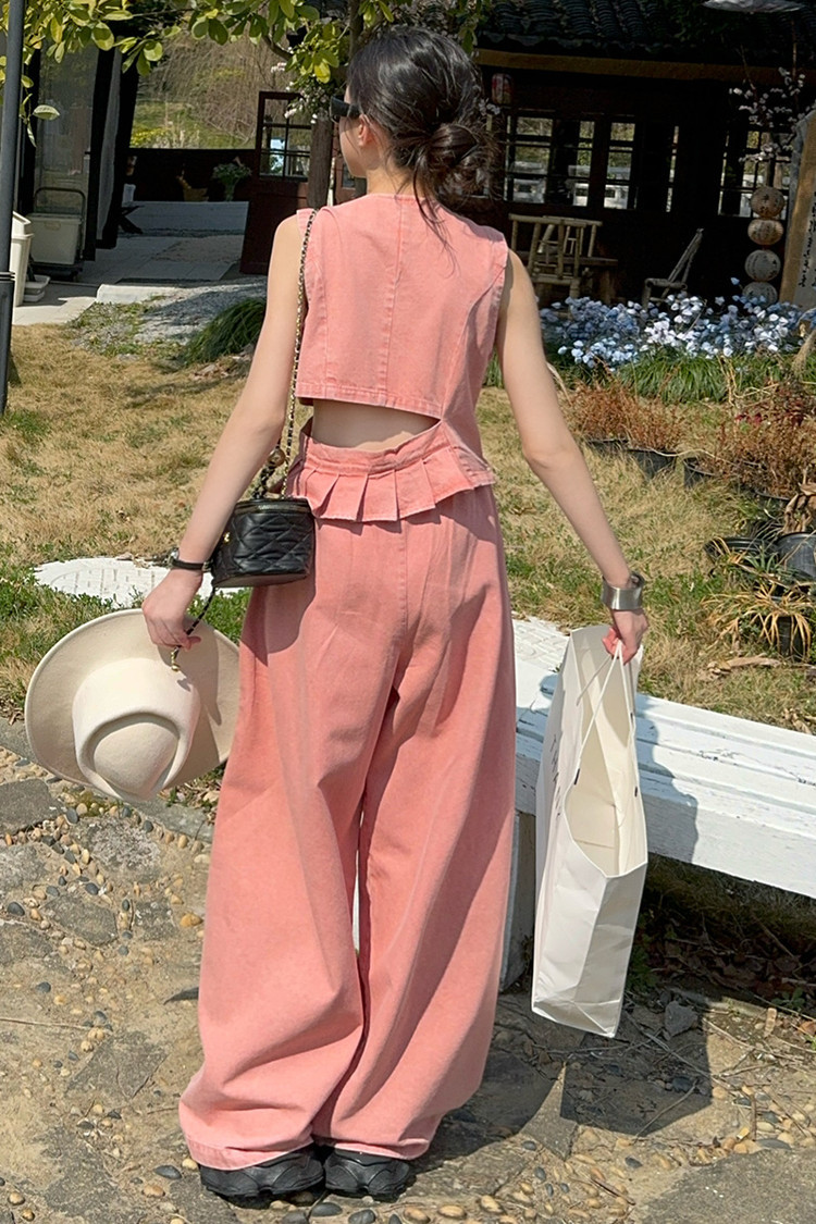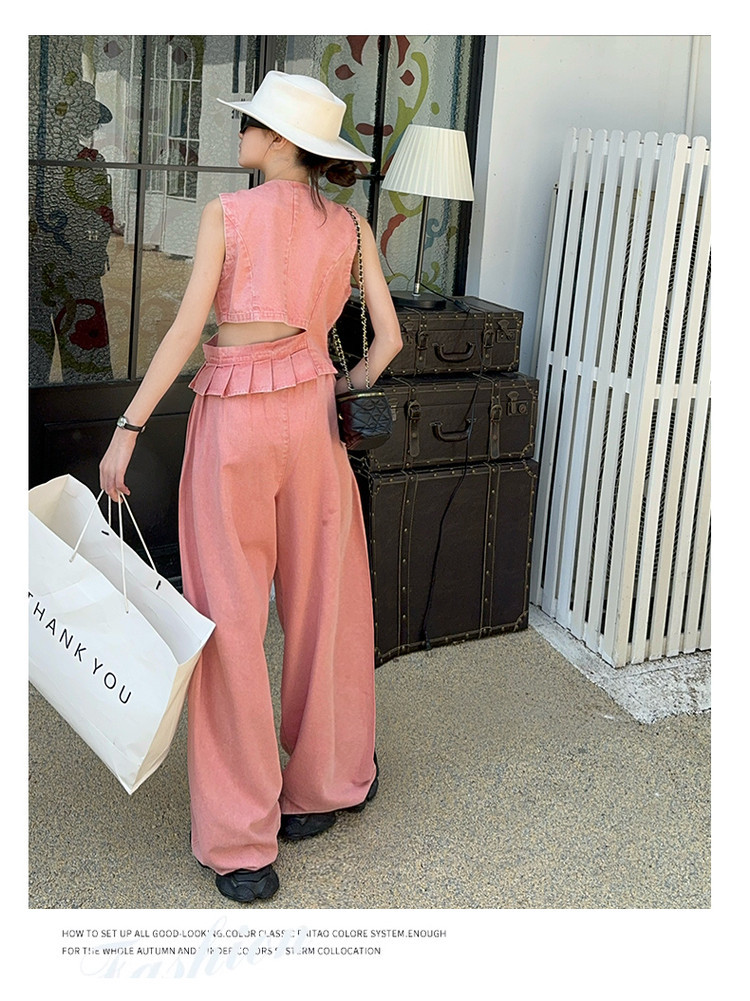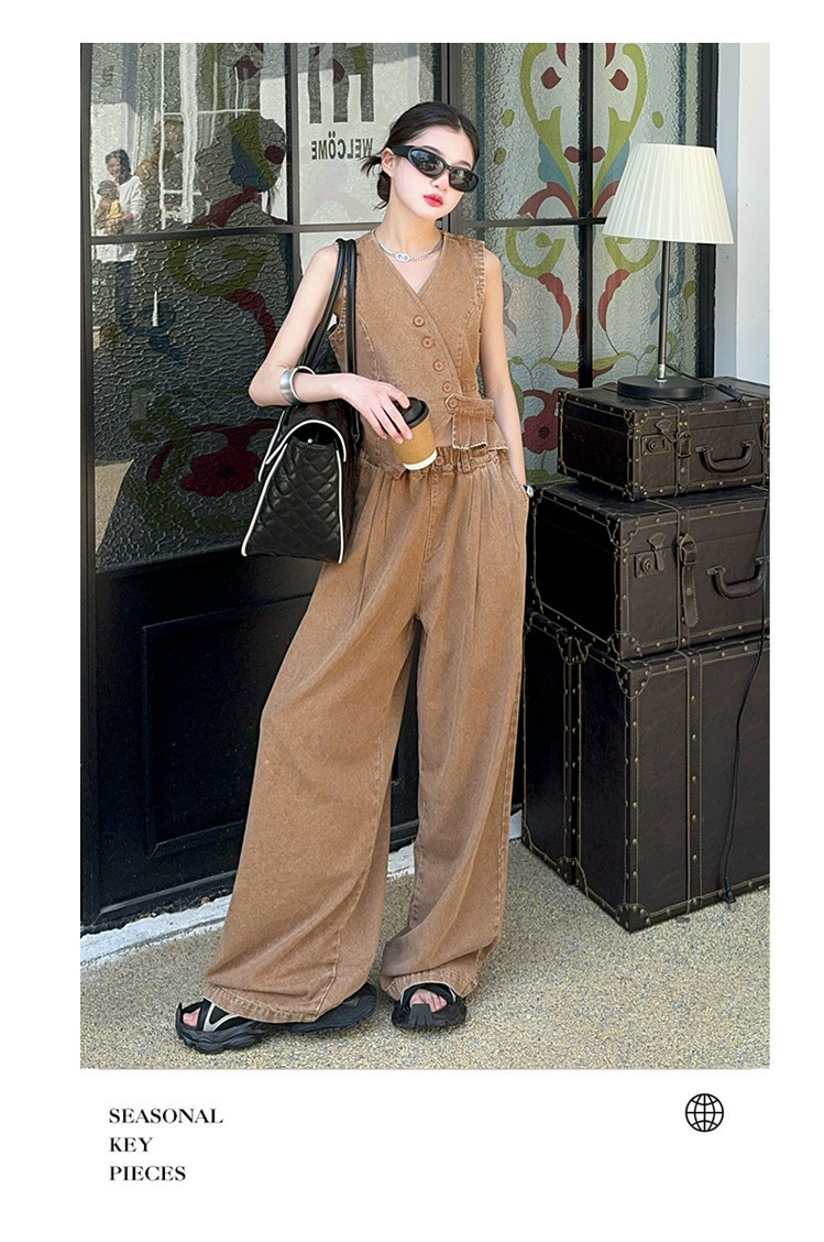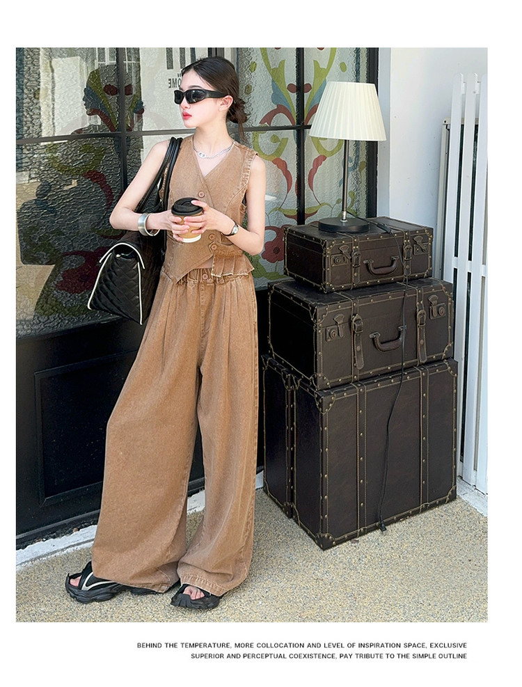 국경 간 소녀 여름 패션 소녀 데님 세트 여름 얇은 중대형 어린이 세련된 레이스 조끼 와이드 레그 바지스토어 가기