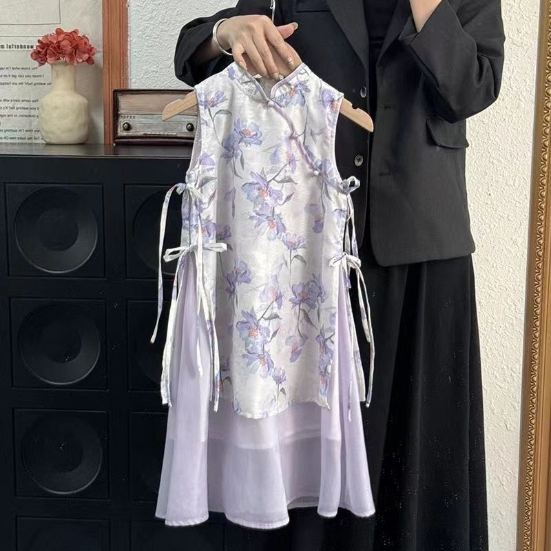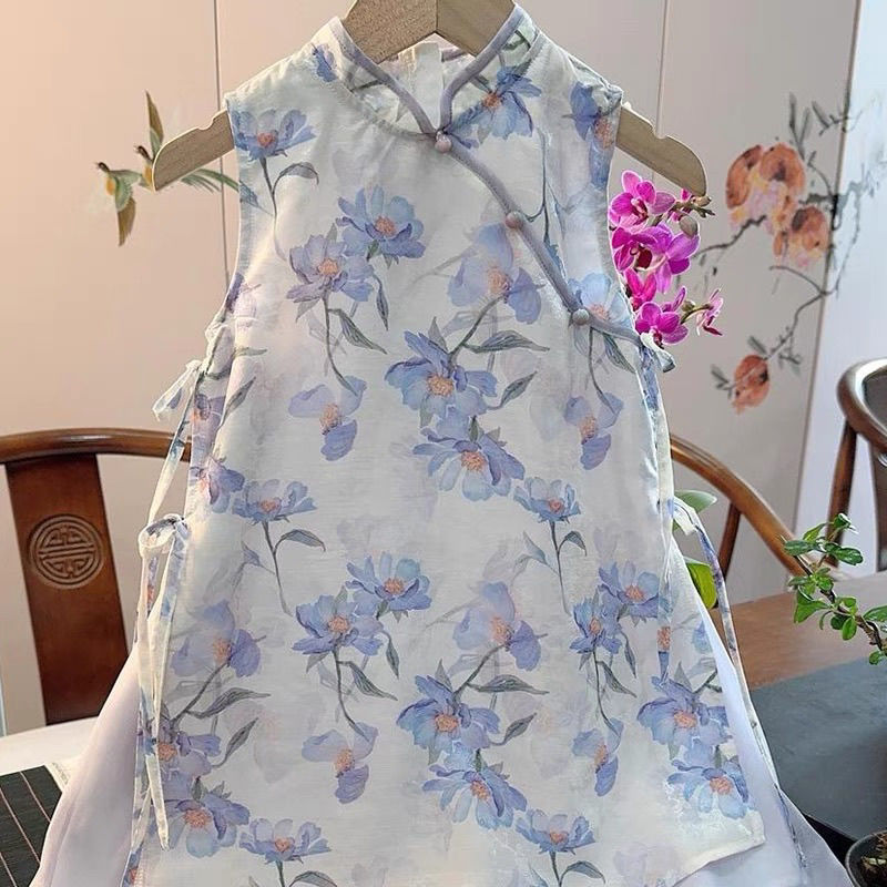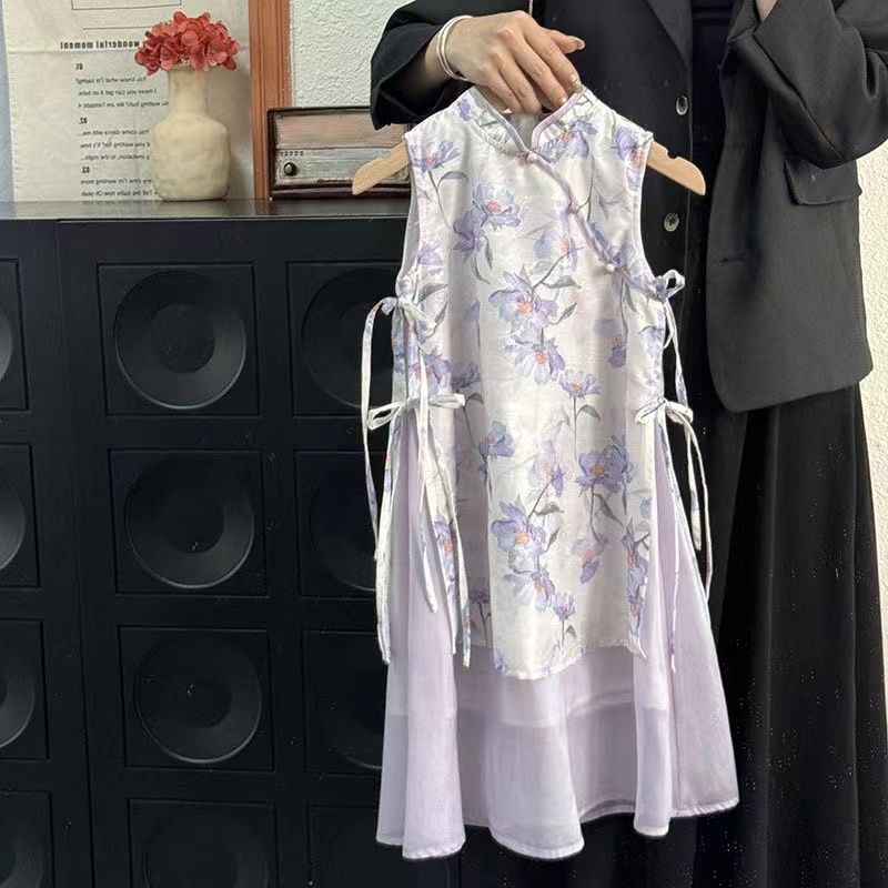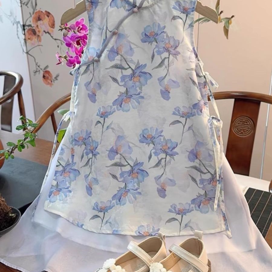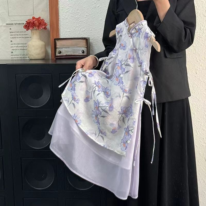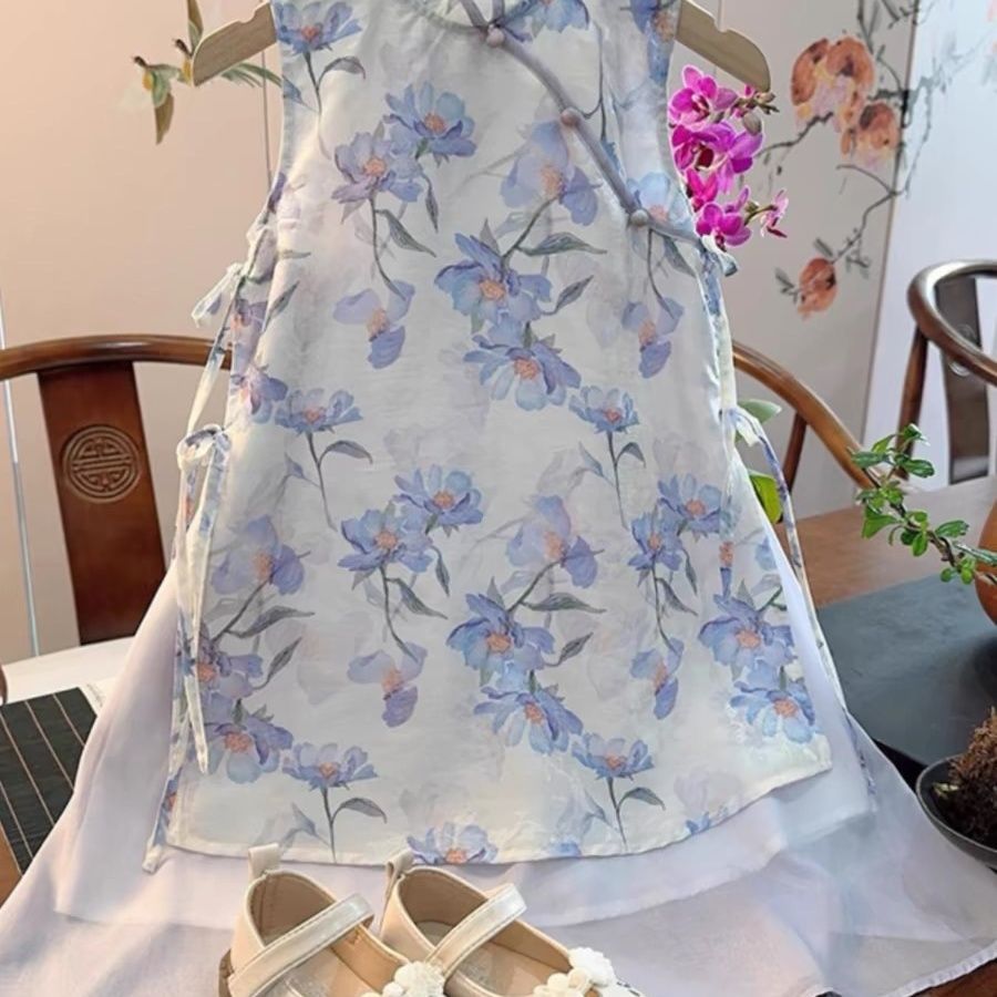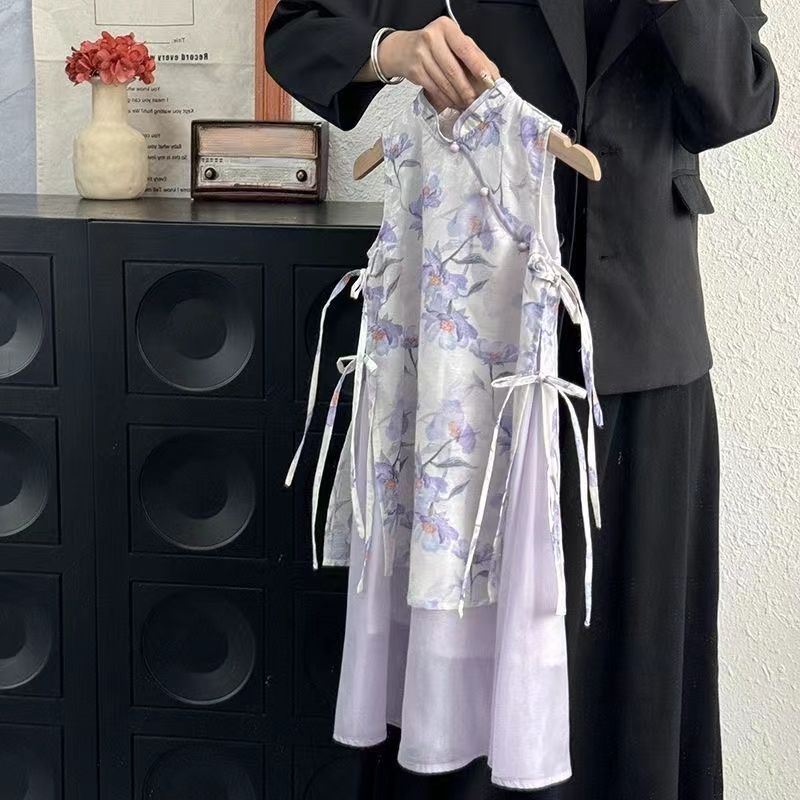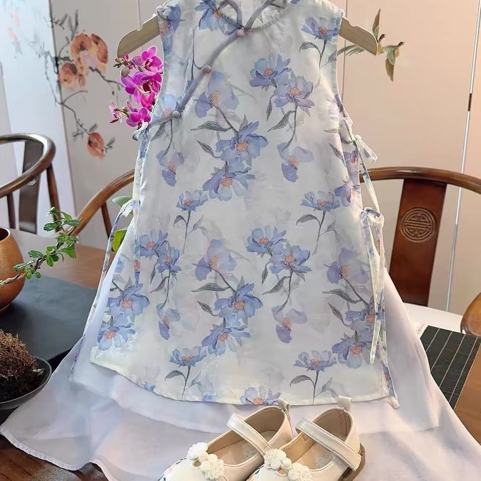 새로운 중국 스타일 원피스 소녀의 여름 새로운 어린이 바이올렛 꽃 청삼 원피스 클래식 수정 된 빅 원피스
