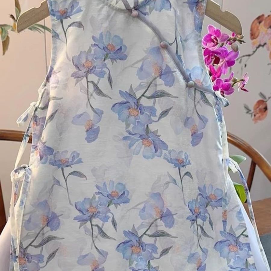 새로운 중국 스타일 원피스 소녀의 여름 새로운 어린이 바이올렛 꽃 청삼 원피스 클래식 수정 된 빅 원피스스토어 가기
