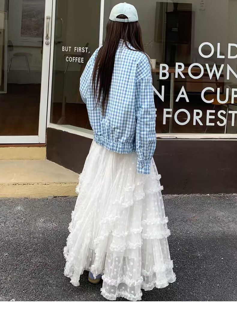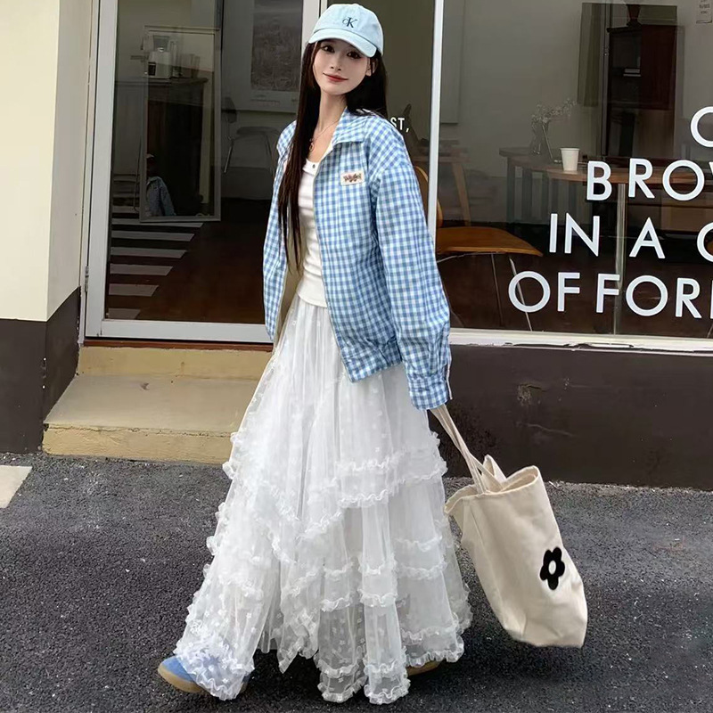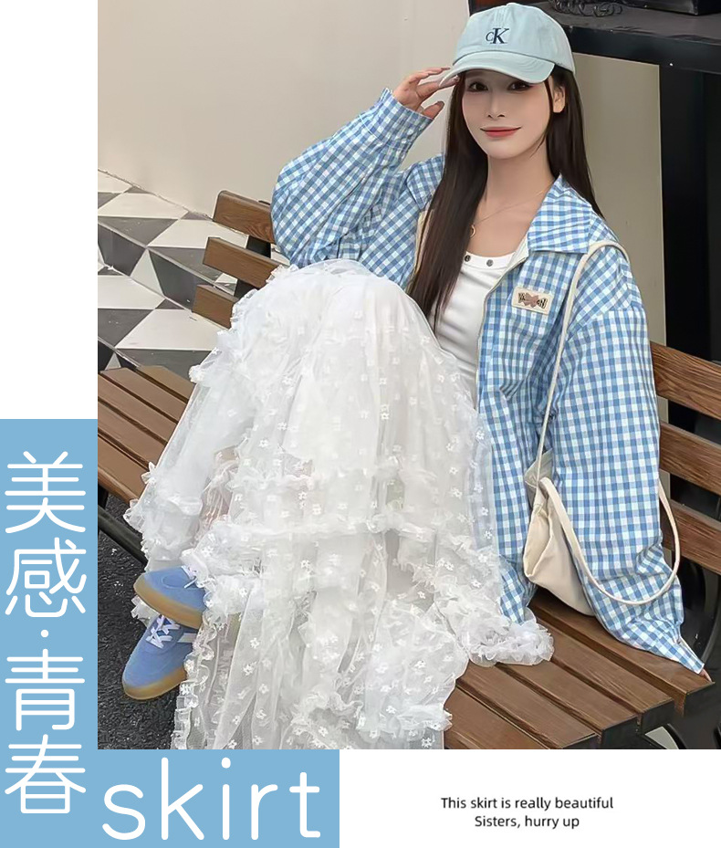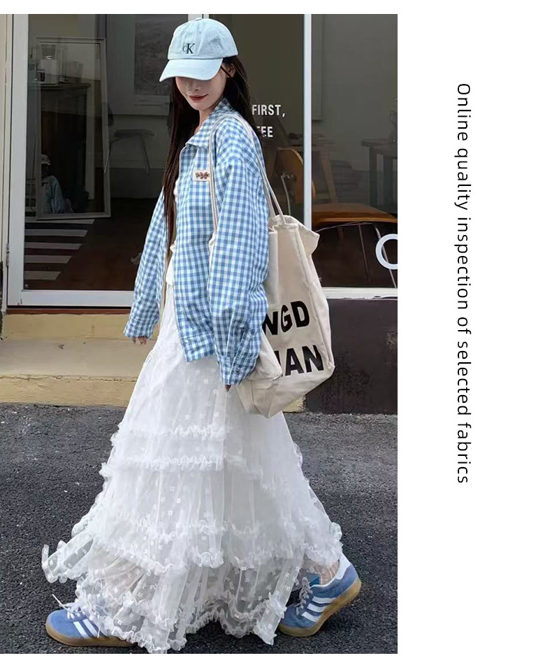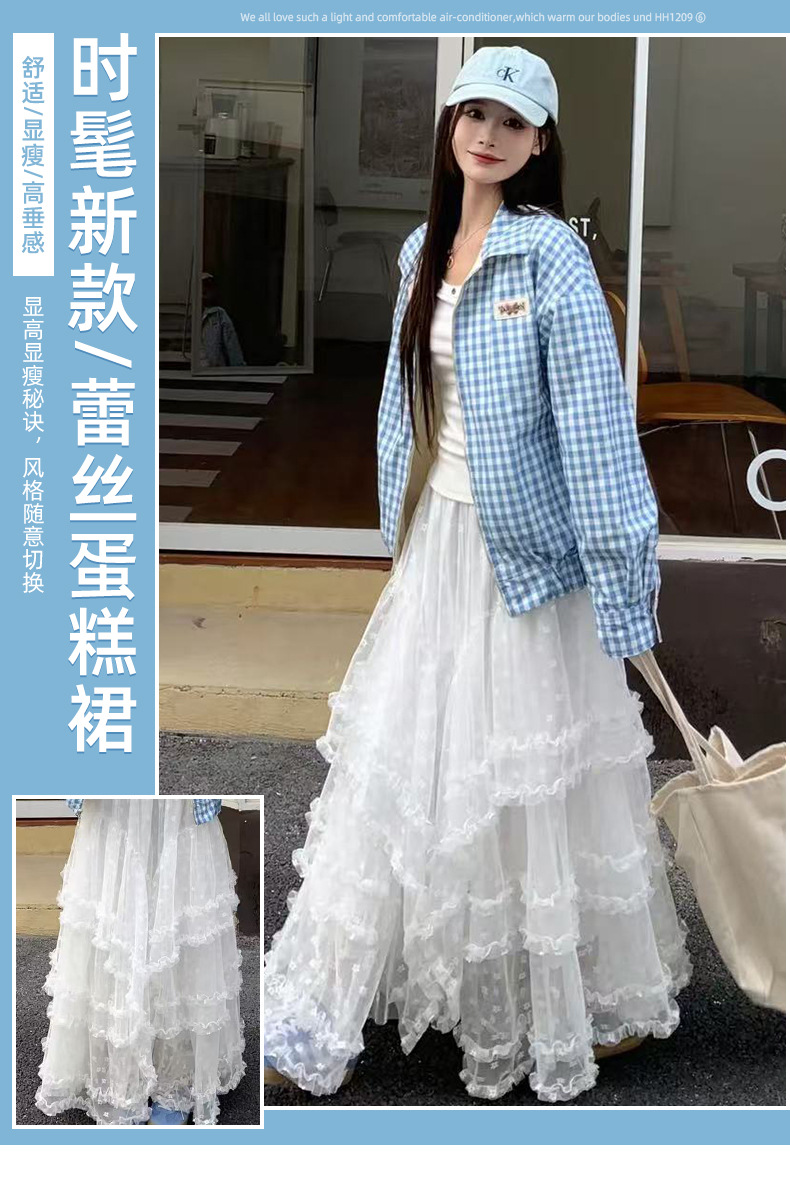 화이트 레이스 메쉬 스커트 여성의 여름 2025 새로운 중간 길이의 푹신한 스커트 높은 허리 슬림 A 라인 케이크 스커트스토어 가기