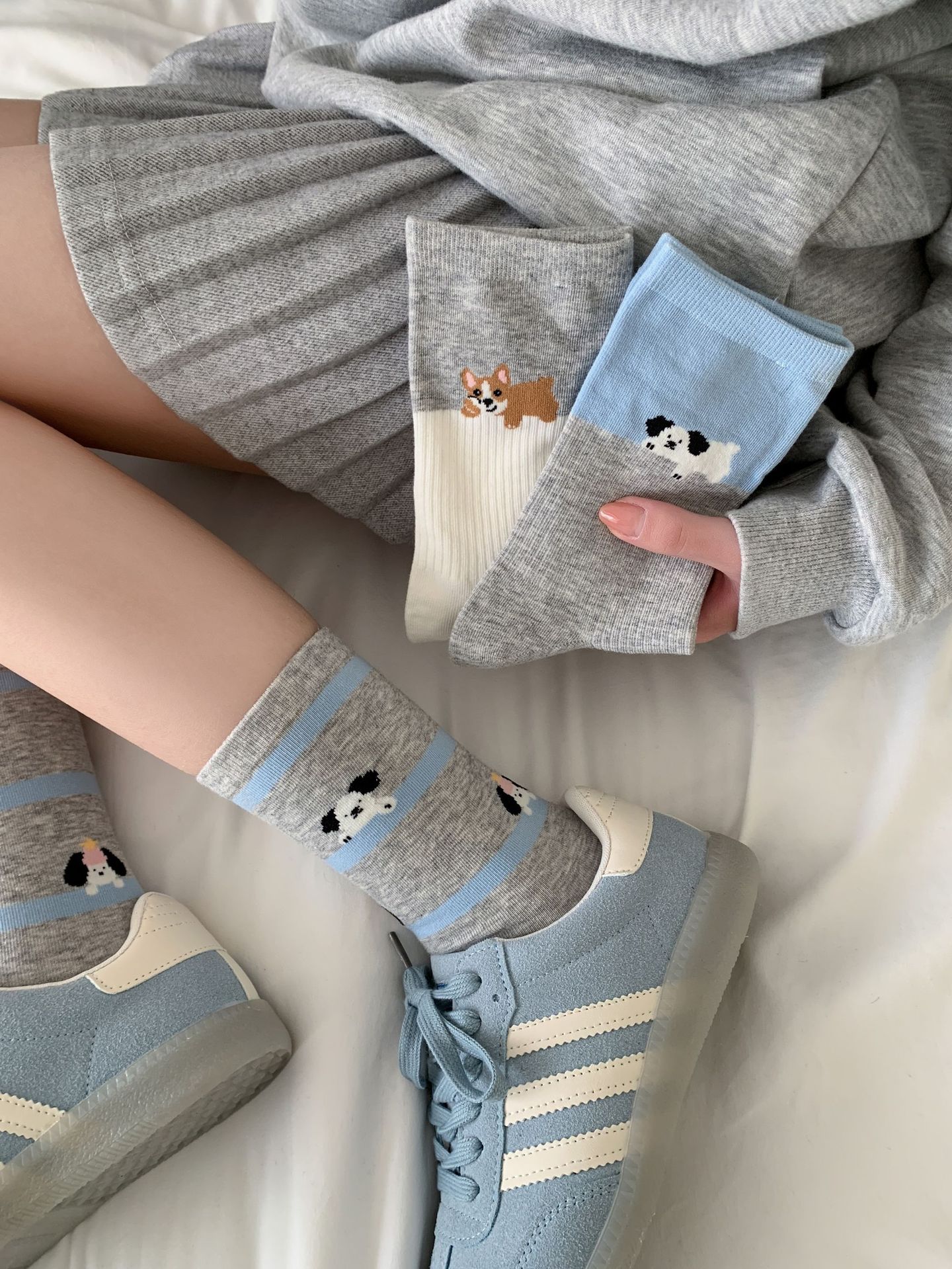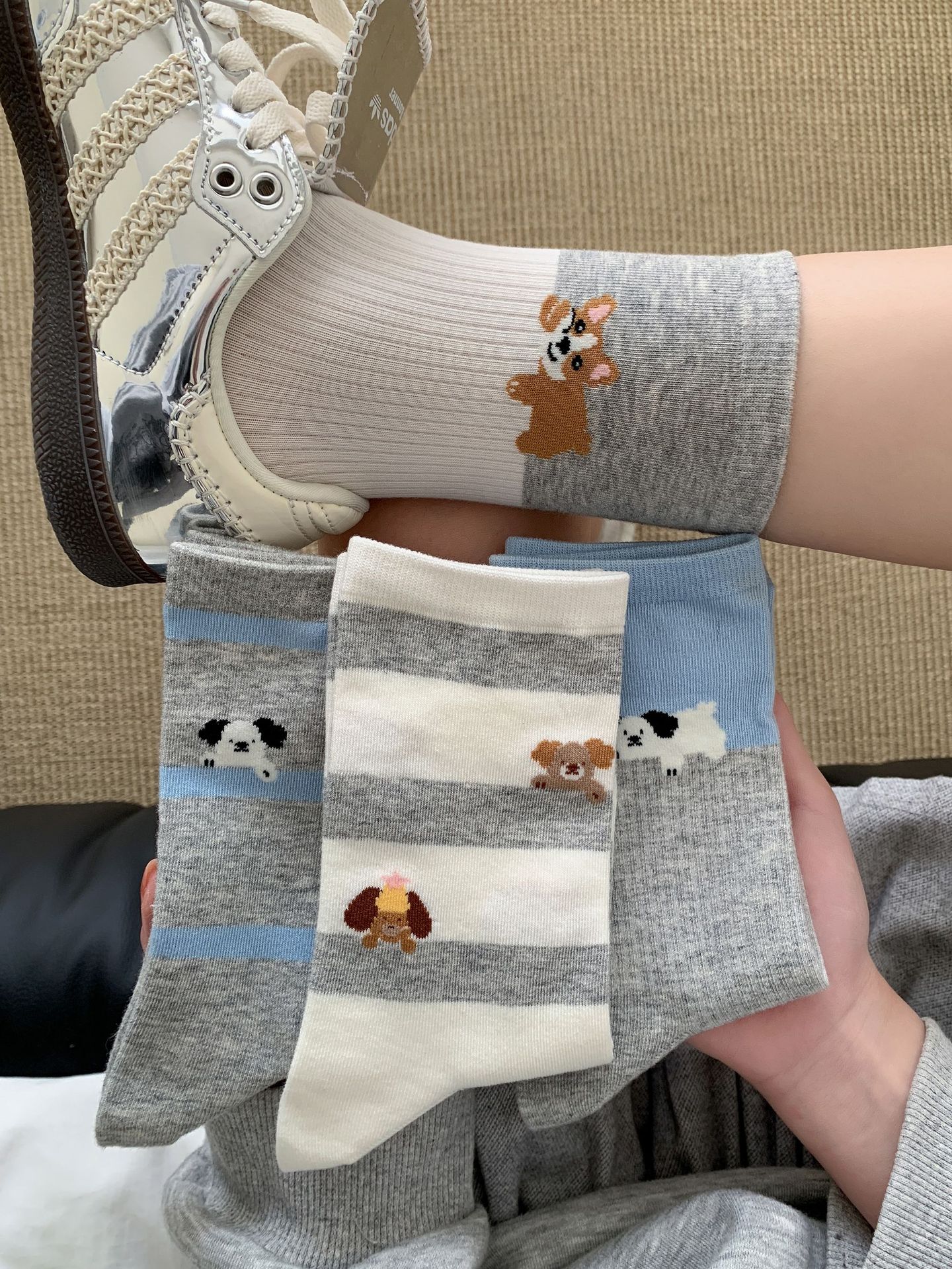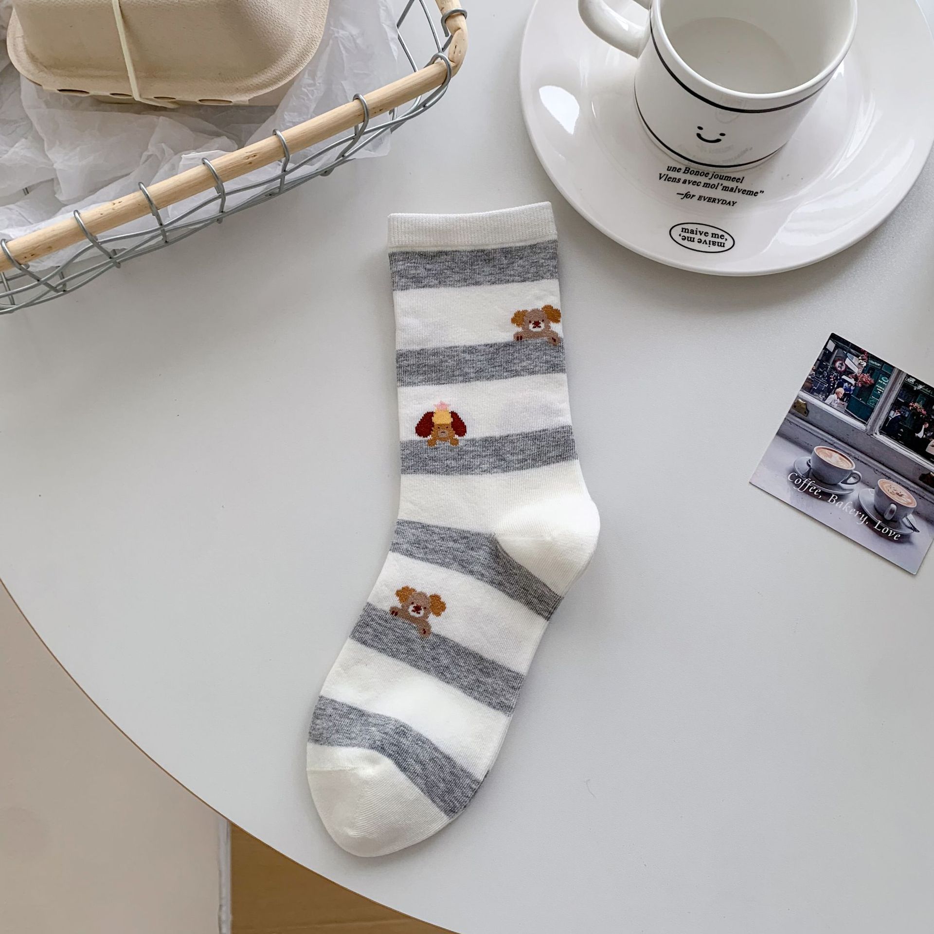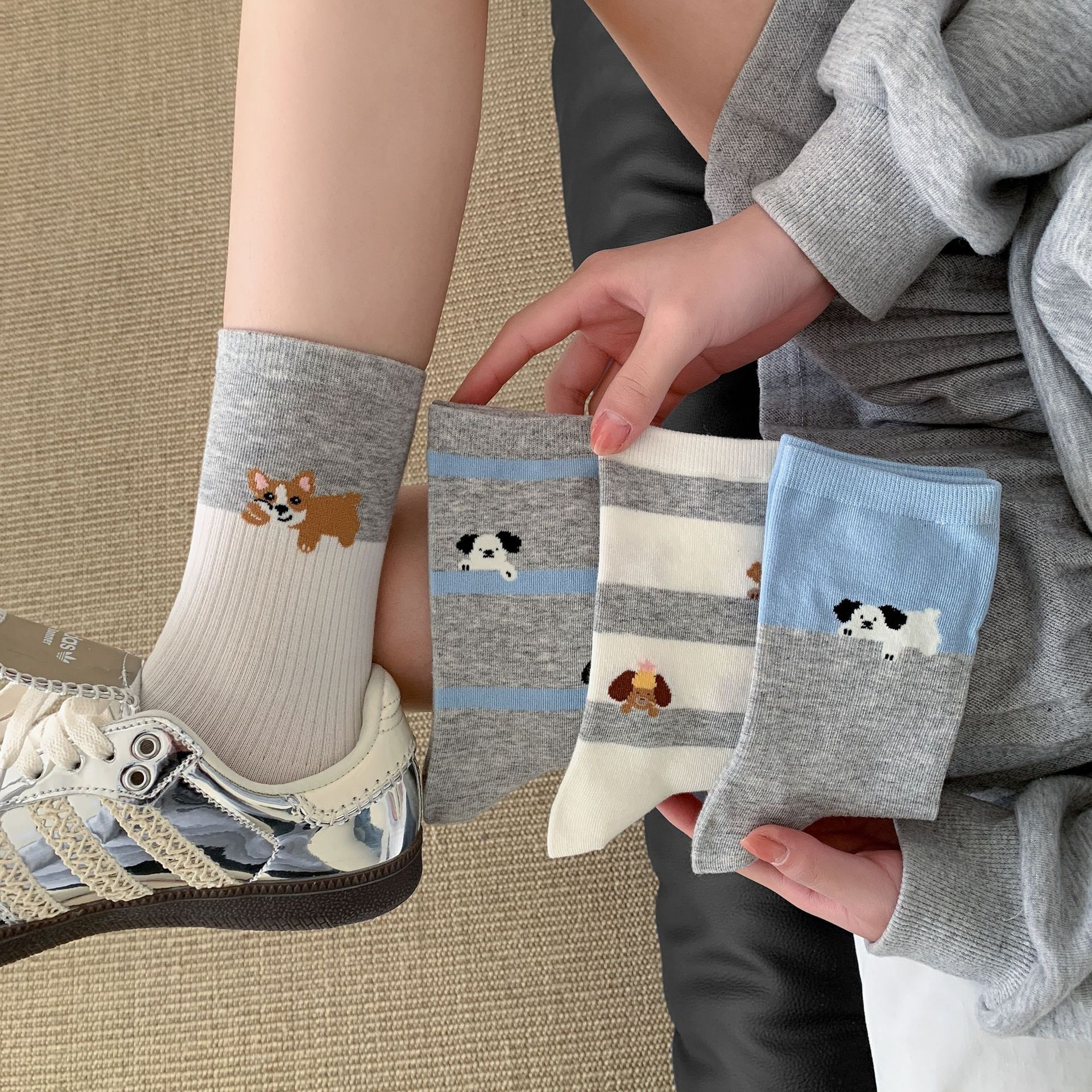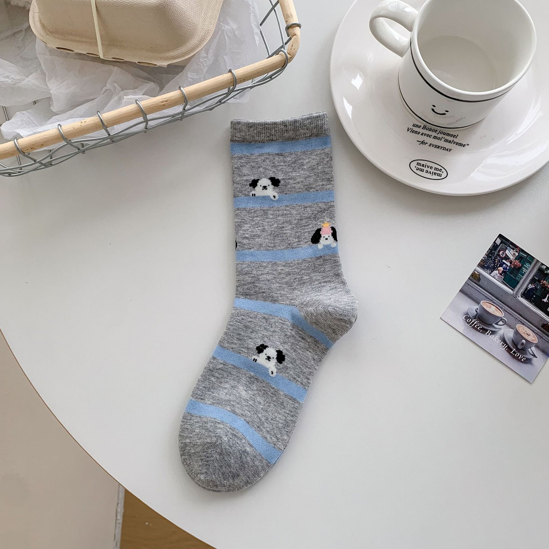 회색 양말 여성의 뼈없는 양말 만화 귀여운 색상 일치하는 강아지 인 색상 일치 줄무늬 강아지 대학 스타일 순수한면 양말스토어 가기