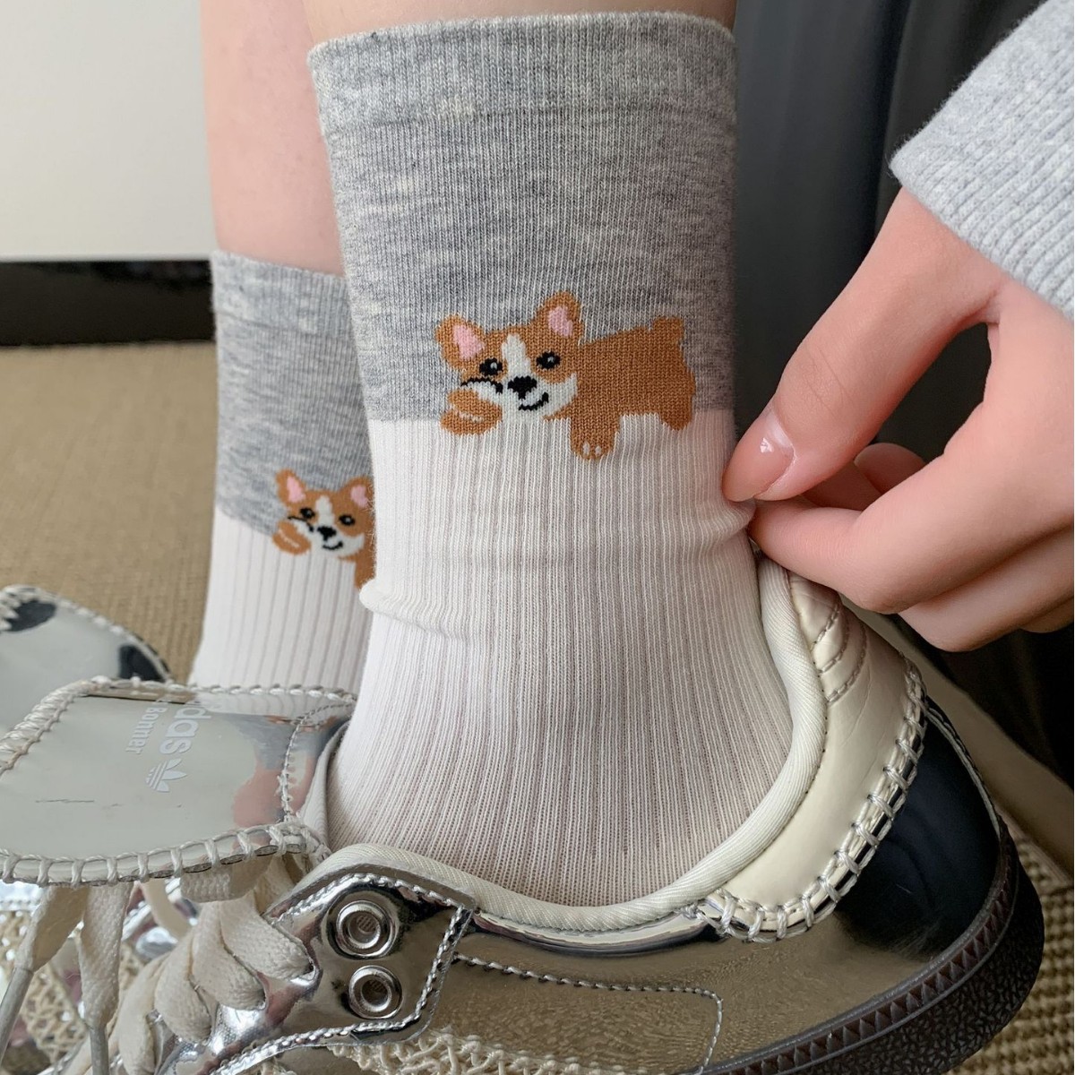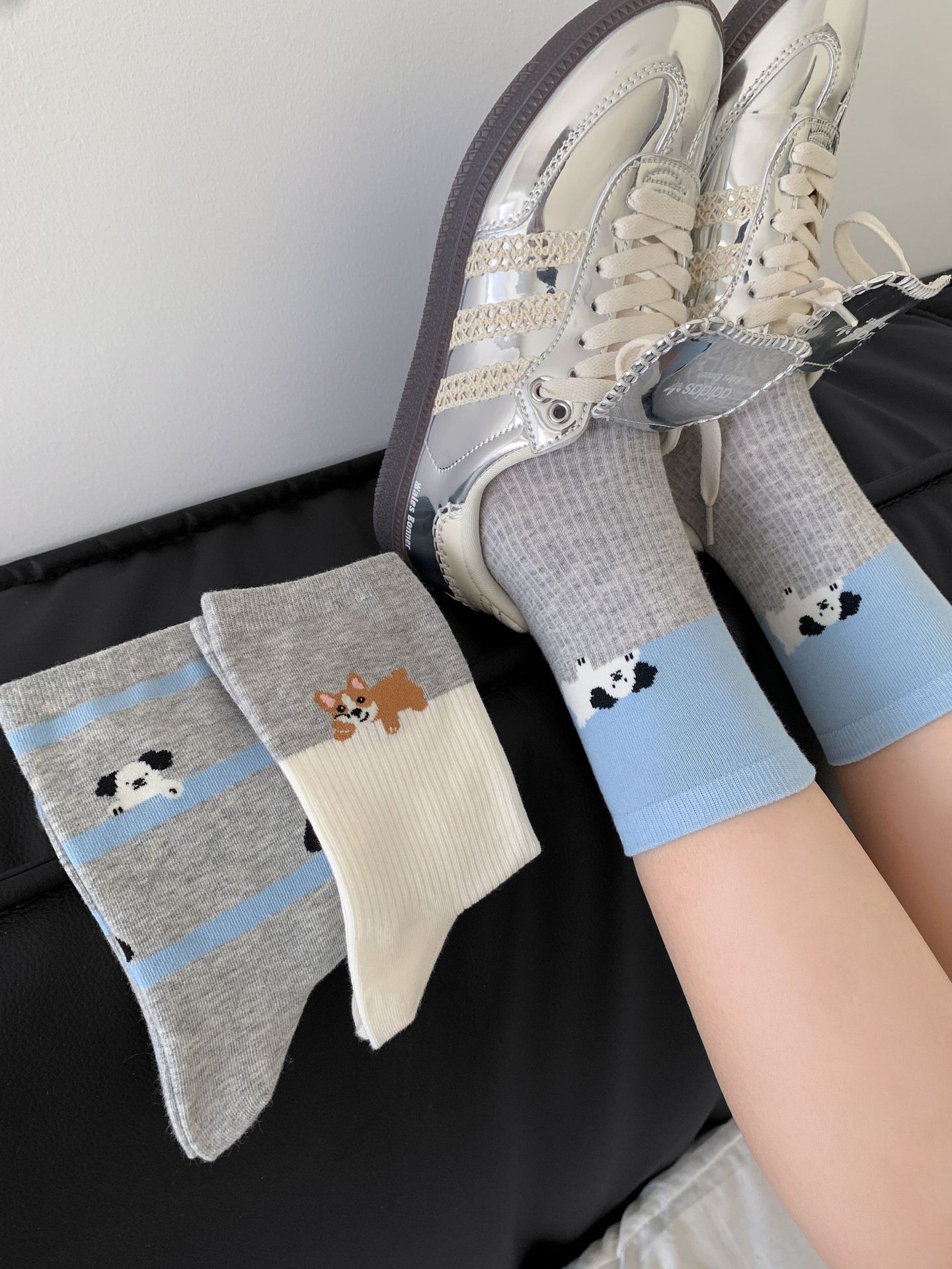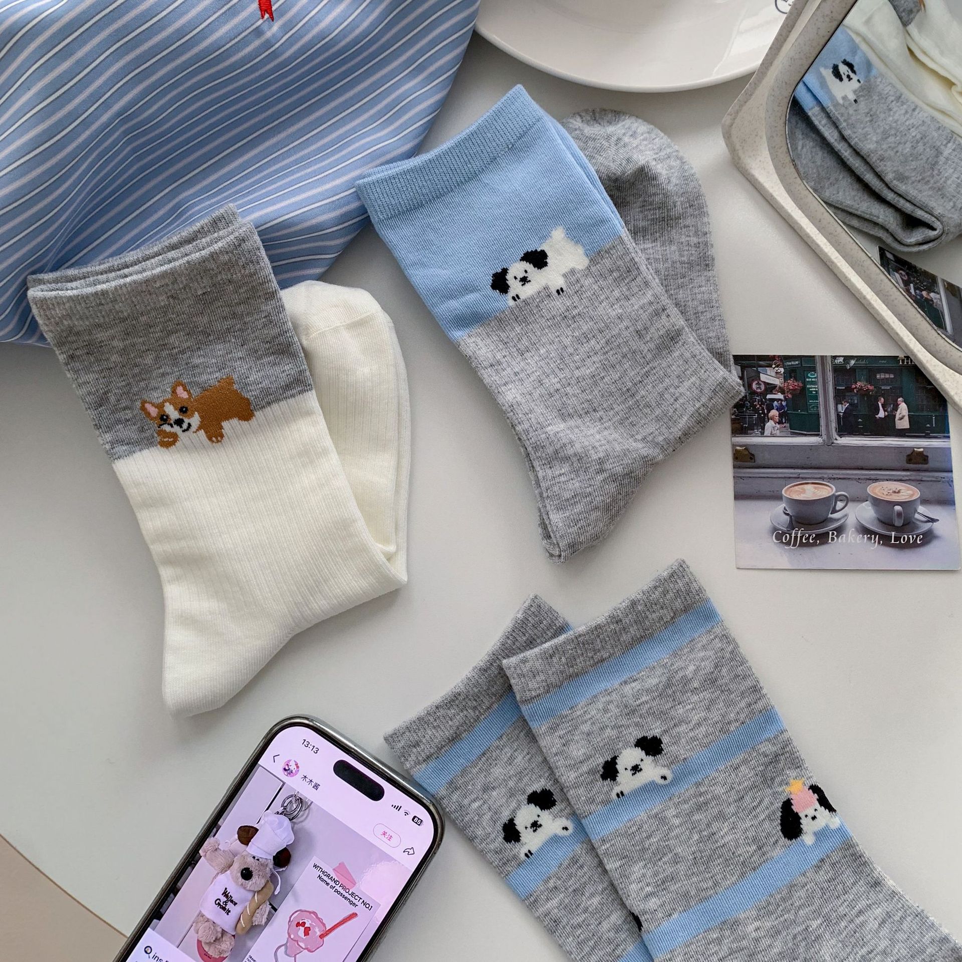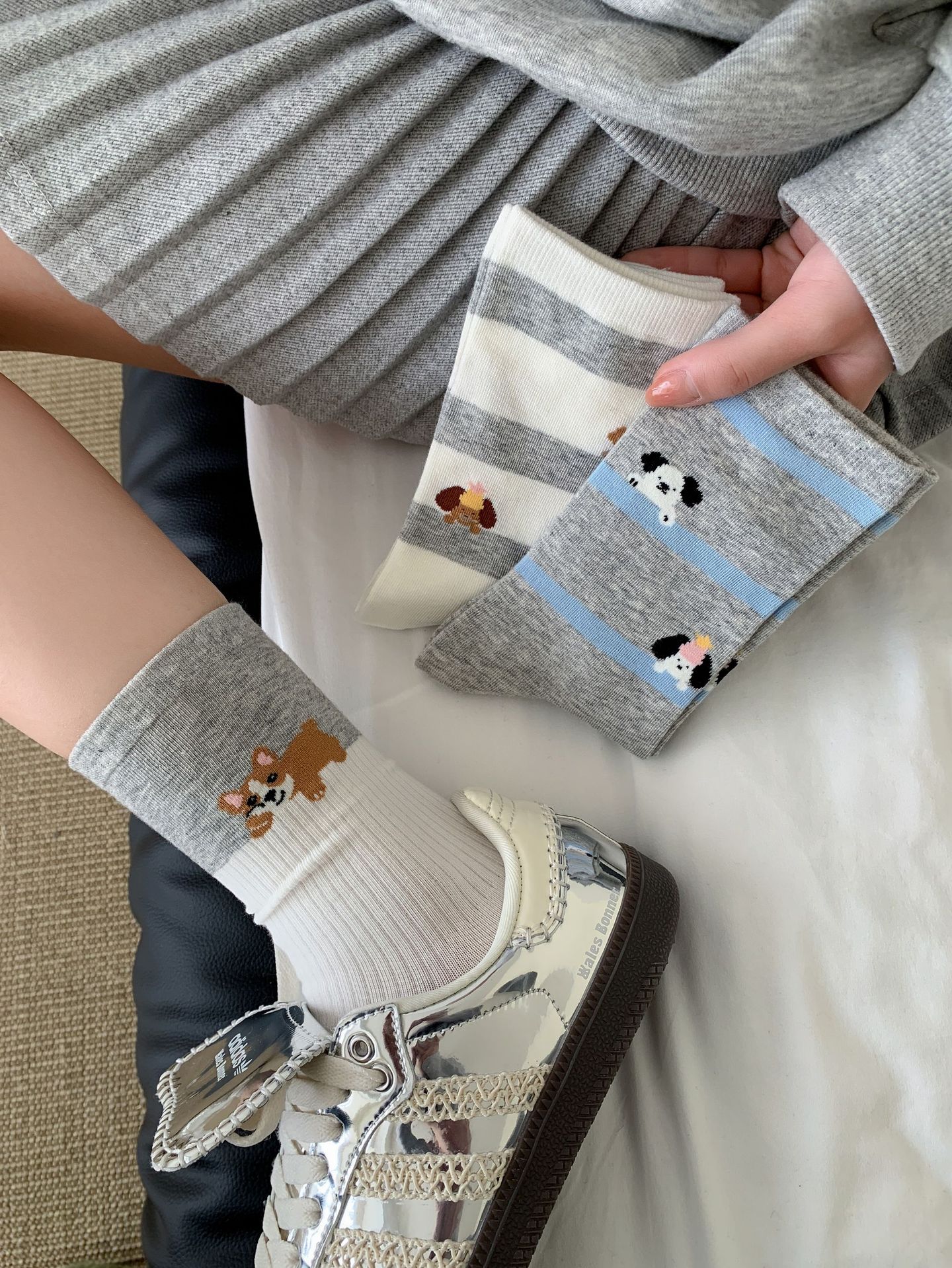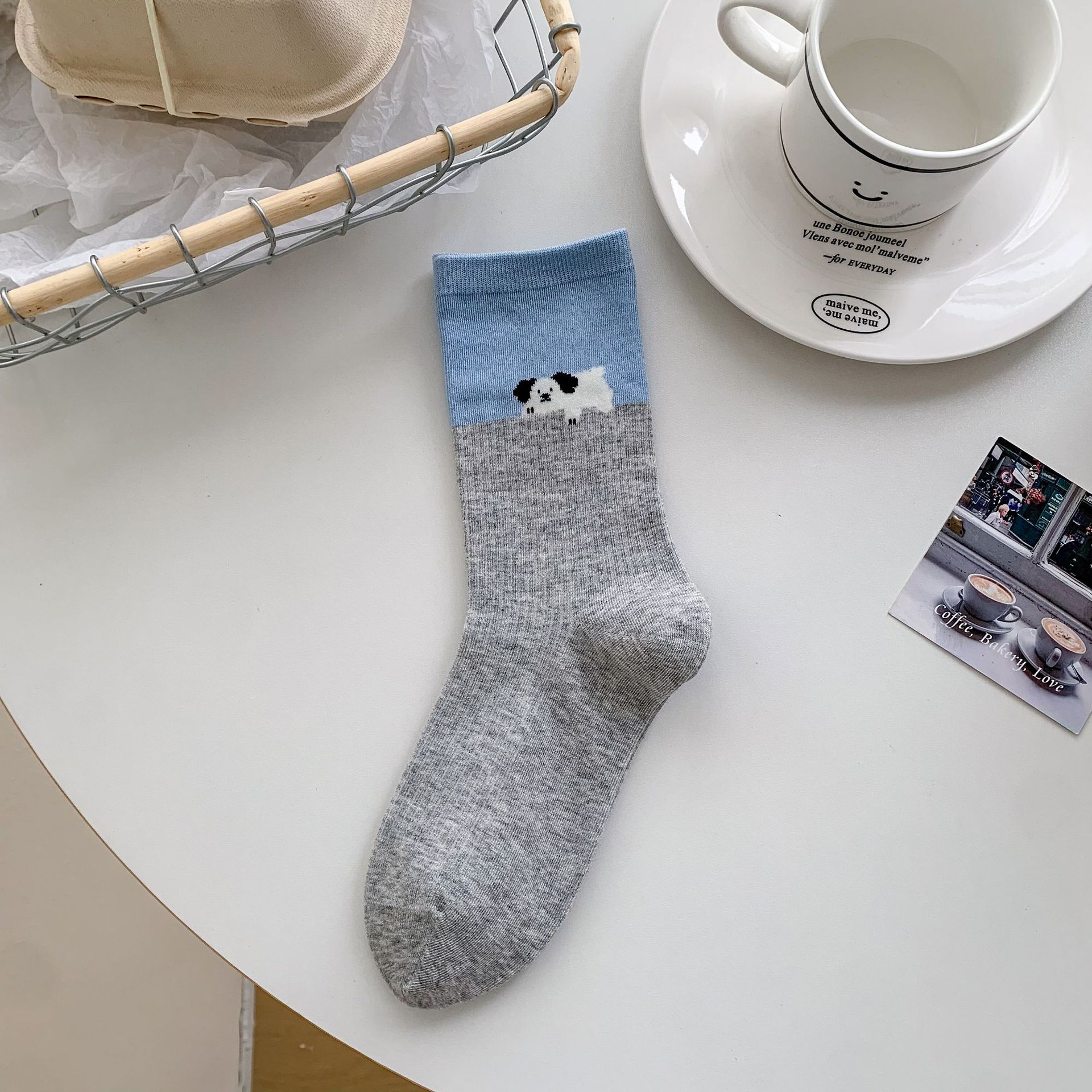 회색 양말 여성의 뼈없는 양말 만화 귀여운 색상 일치하는 강아지 인 색상 일치 줄무늬 강아지 대학 스타일 순수한면 양말스토어 가기