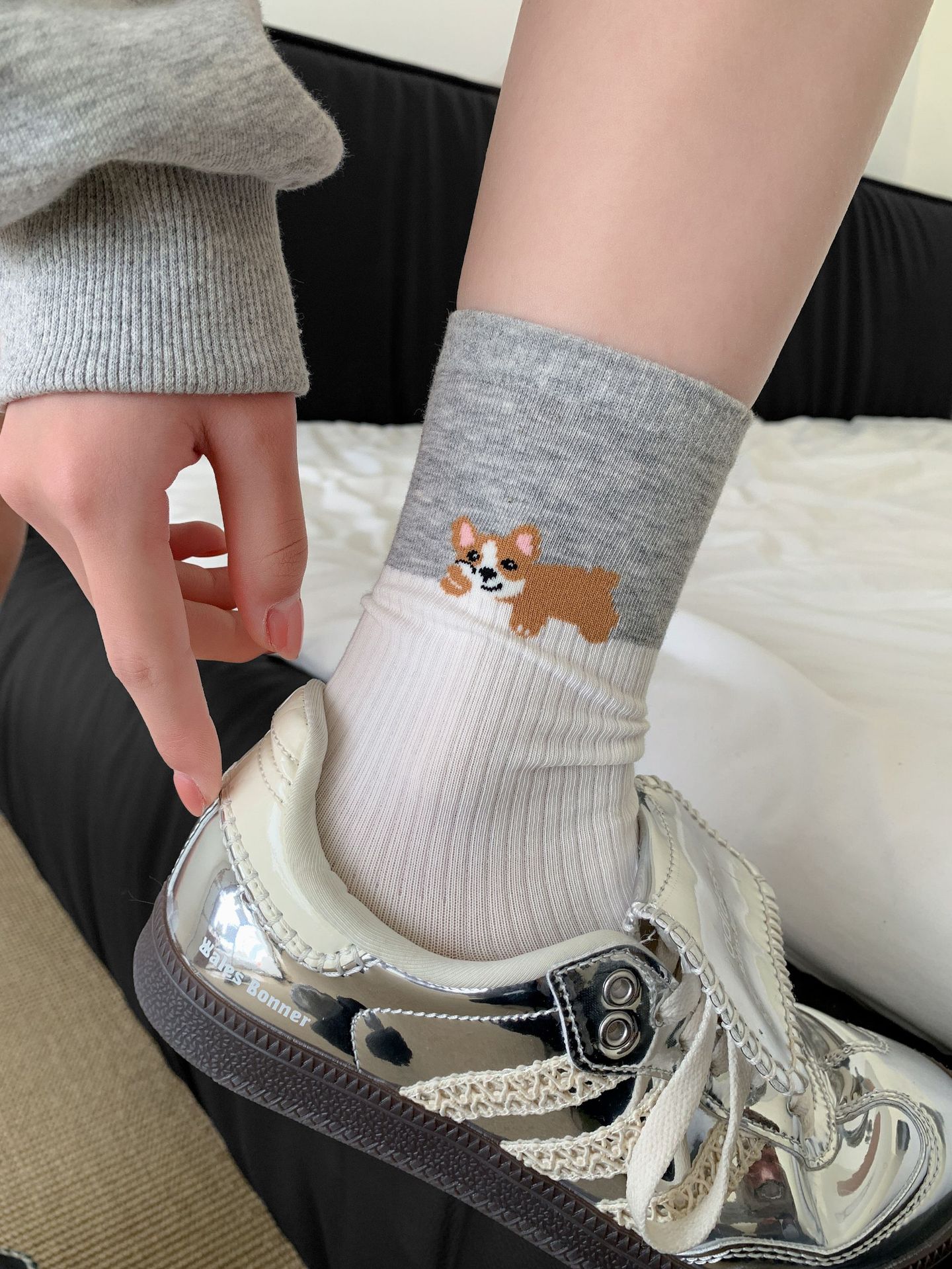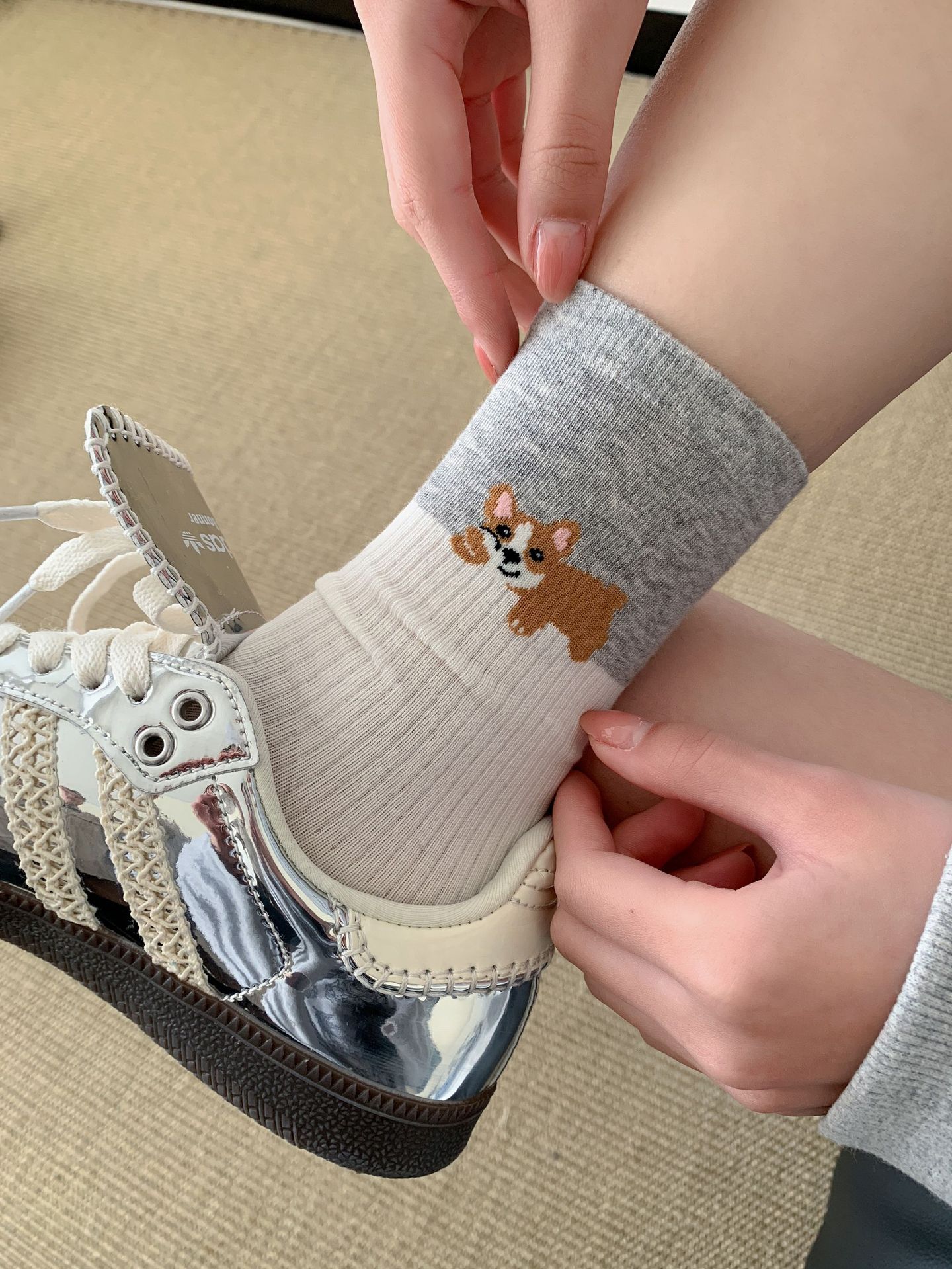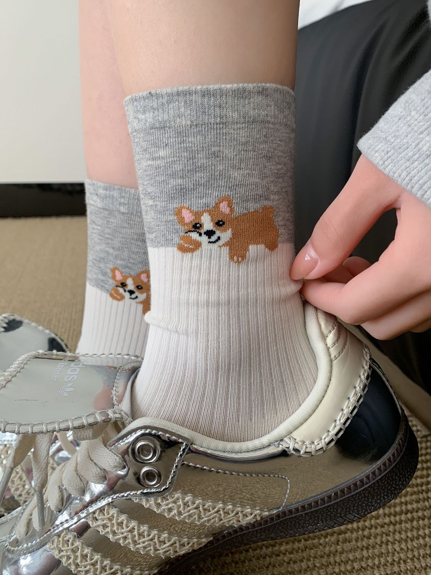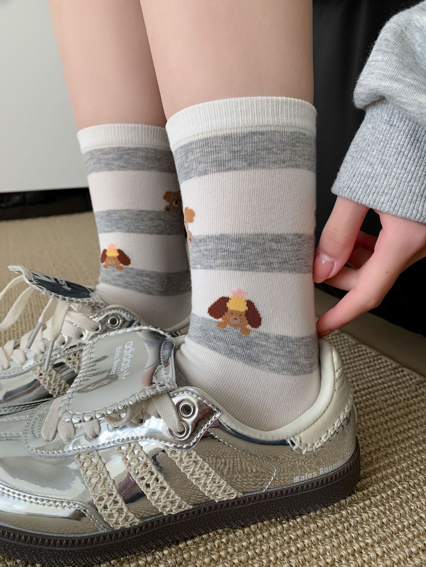 회색 양말 여성의 뼈없는 양말 만화 귀여운 색상 일치하는 강아지 인 색상 일치 줄무늬 강아지 대학 스타일 순수한면 양말스토어 가기