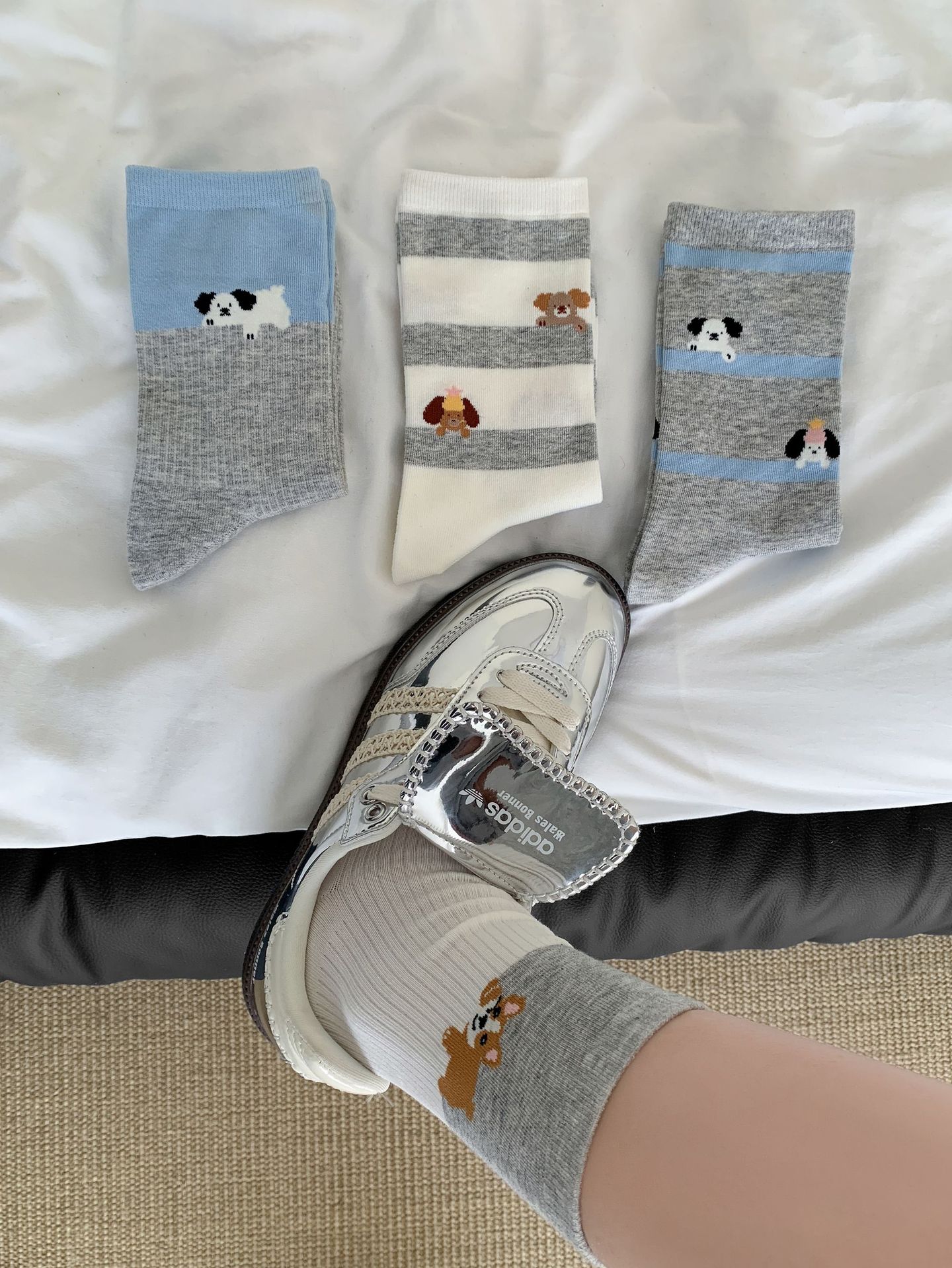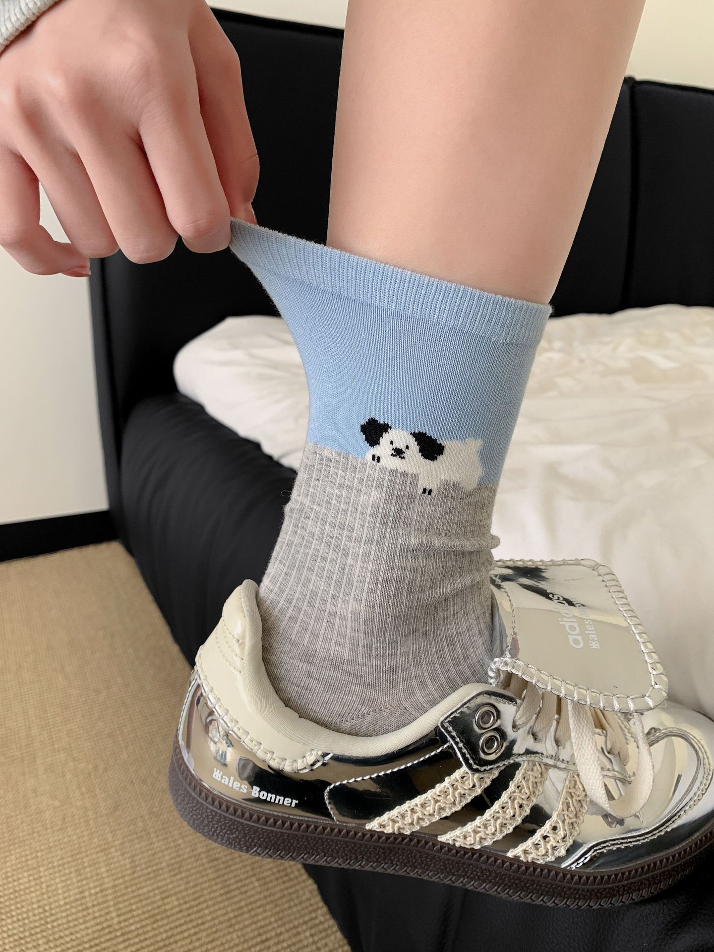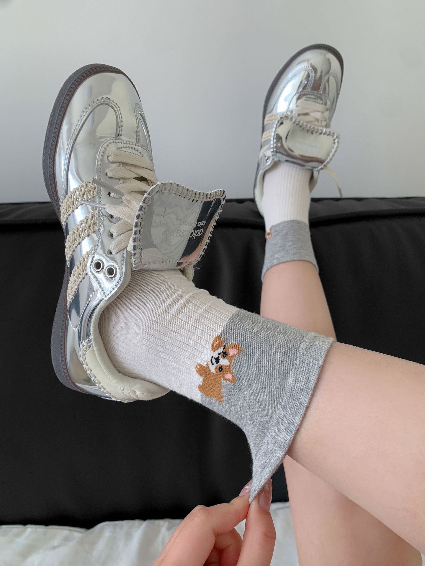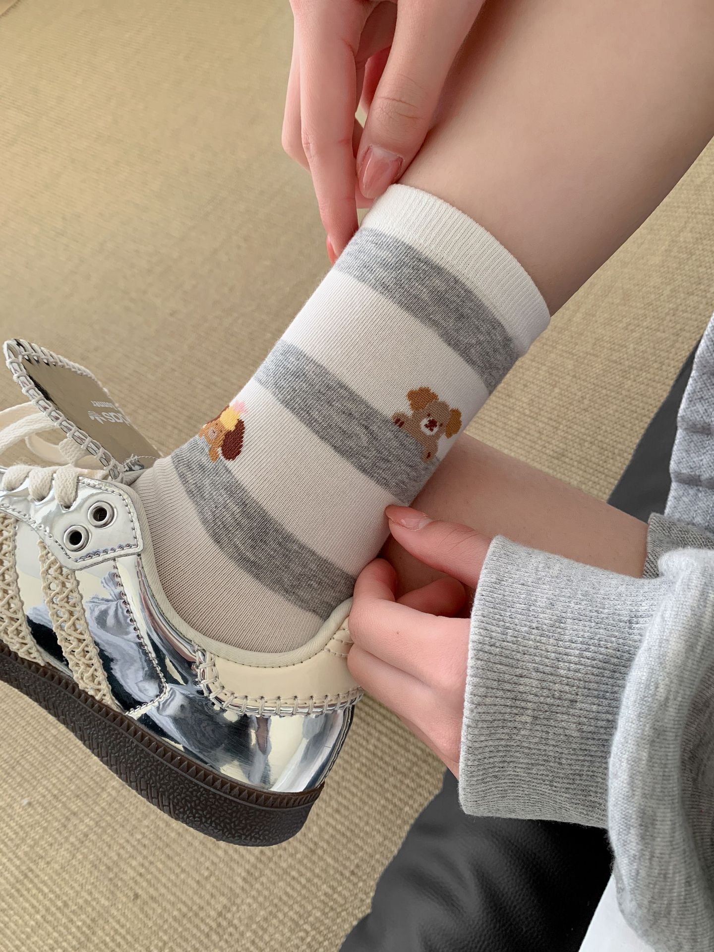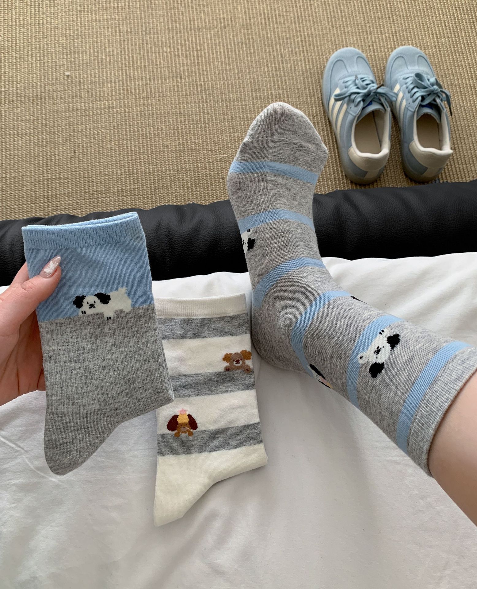 회색 양말 여성의 뼈없는 양말 만화 귀여운 색상 일치하는 강아지 인 색상 일치 줄무늬 강아지 대학 스타일 순수한면 양말스토어 가기