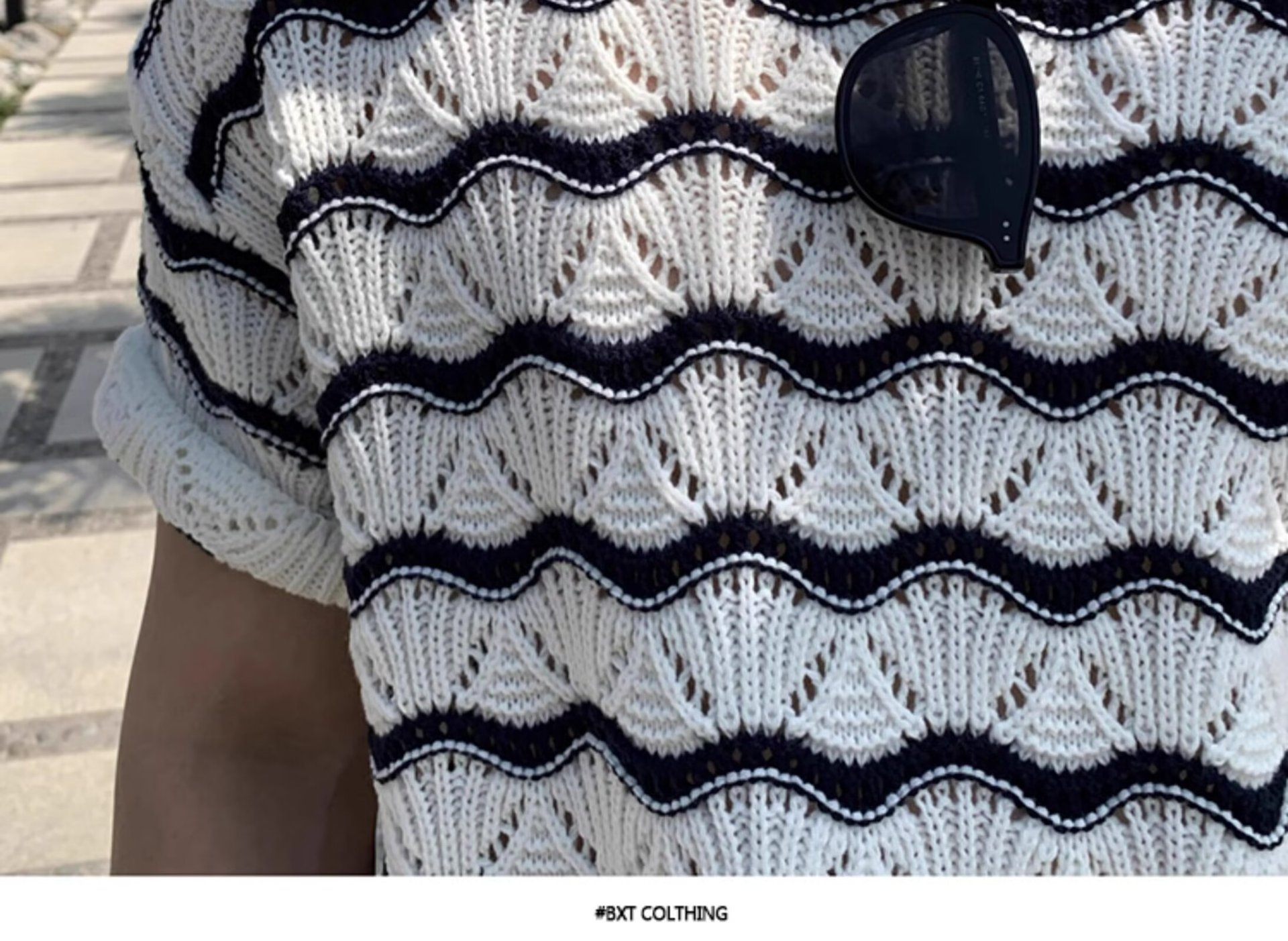 반팔 줄무늬 티셔츠 남자 여름 통기성 얇은 둥근 목 할로우 니트웨어 아메리칸 스타일 레트로 반소매 루즈 티셔츠스토어 가기