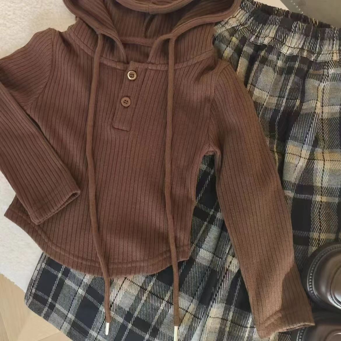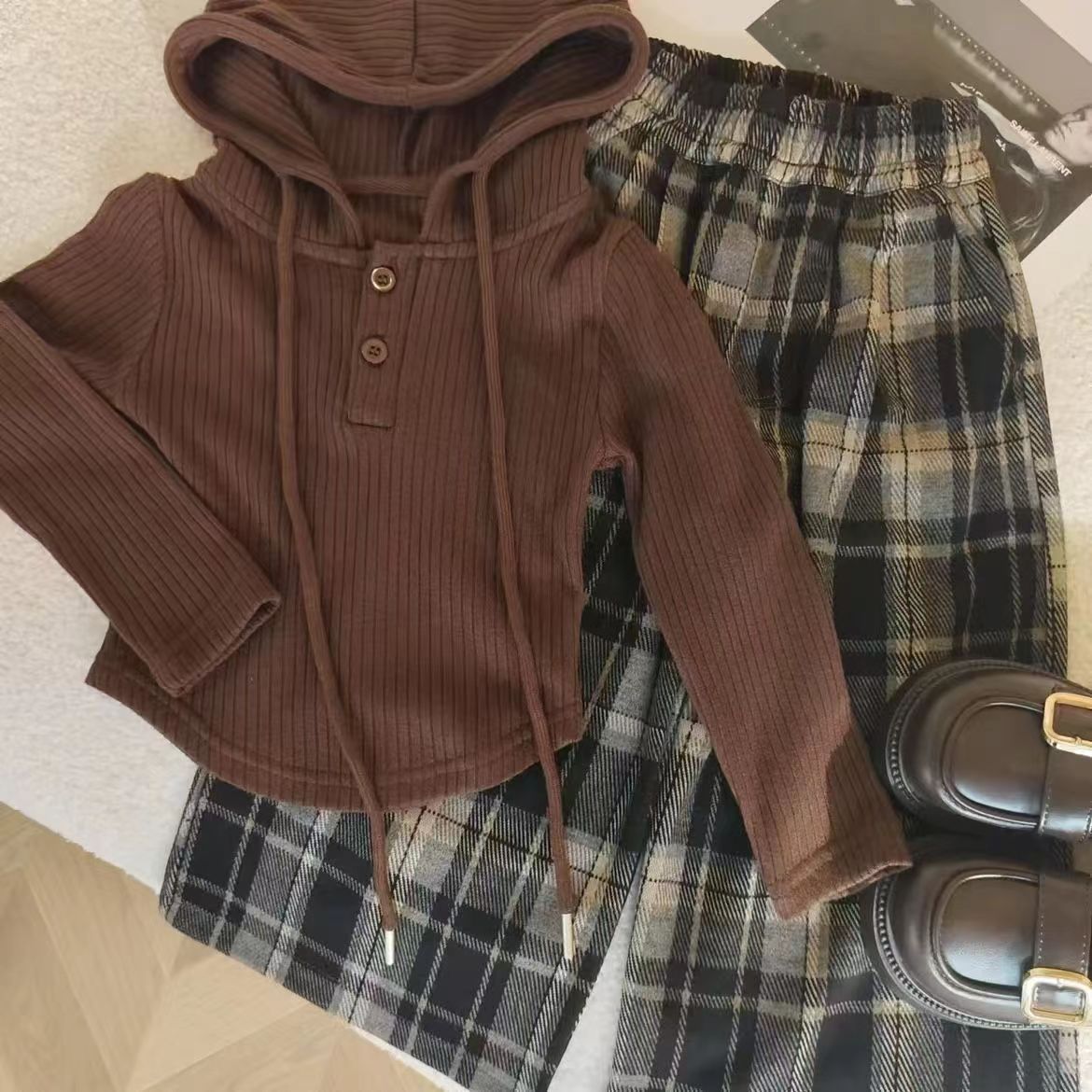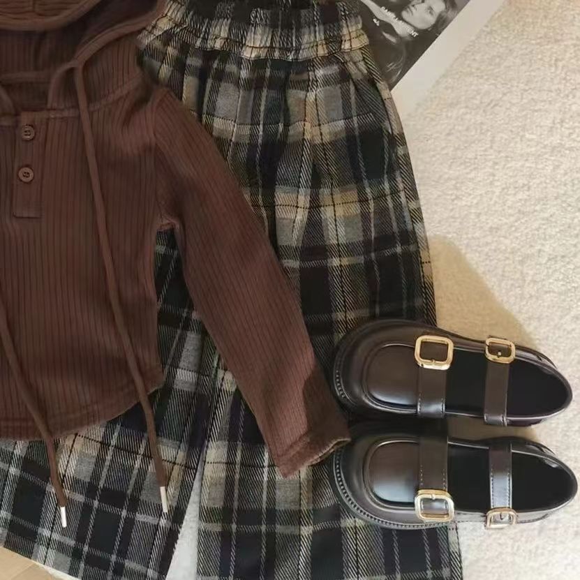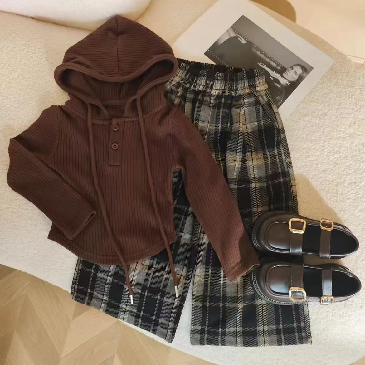 • 브라운 후드 스웨트셔츠 + 체크무늬 와이드 팬츠