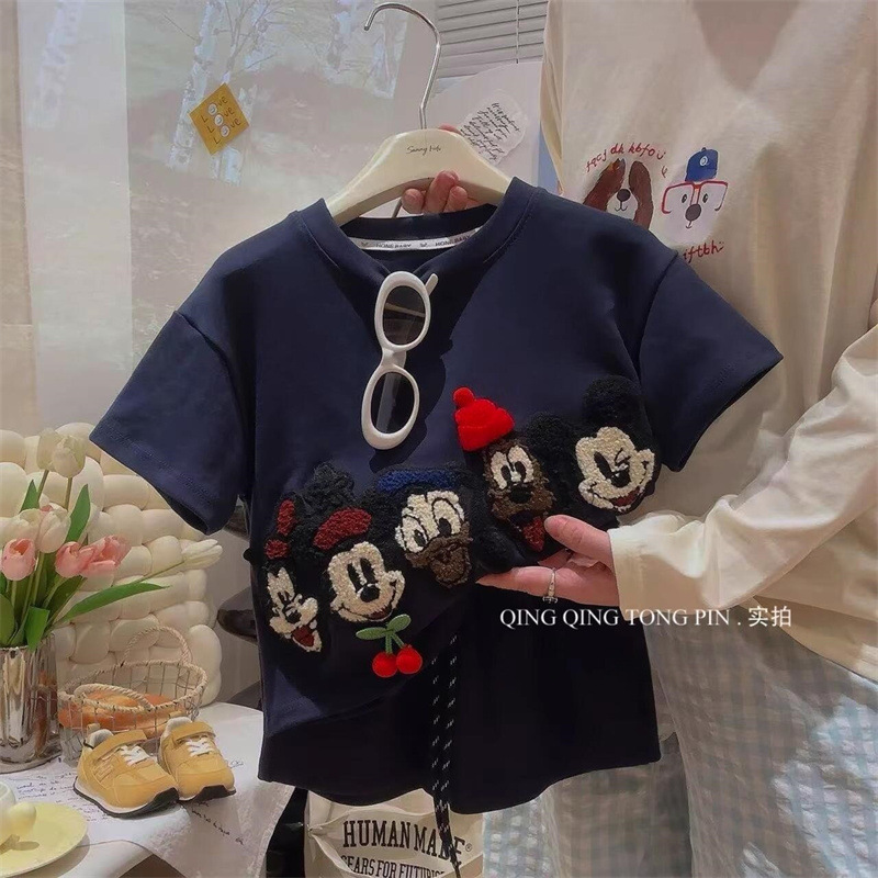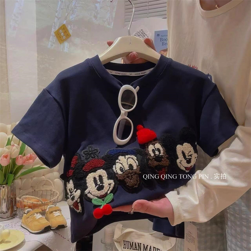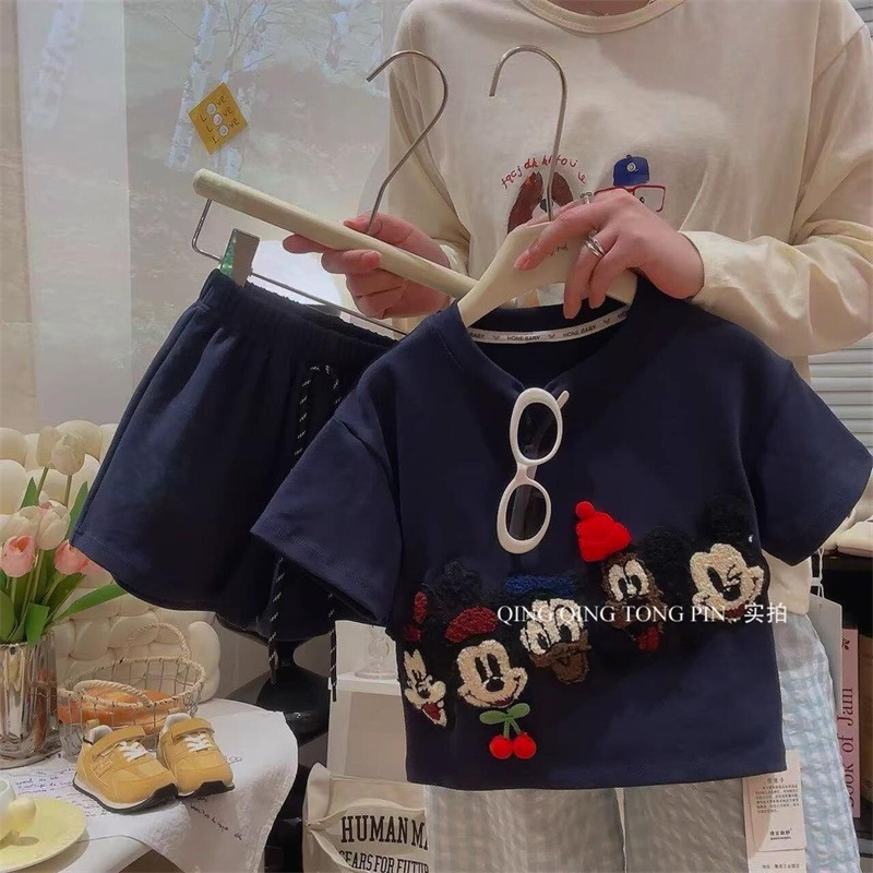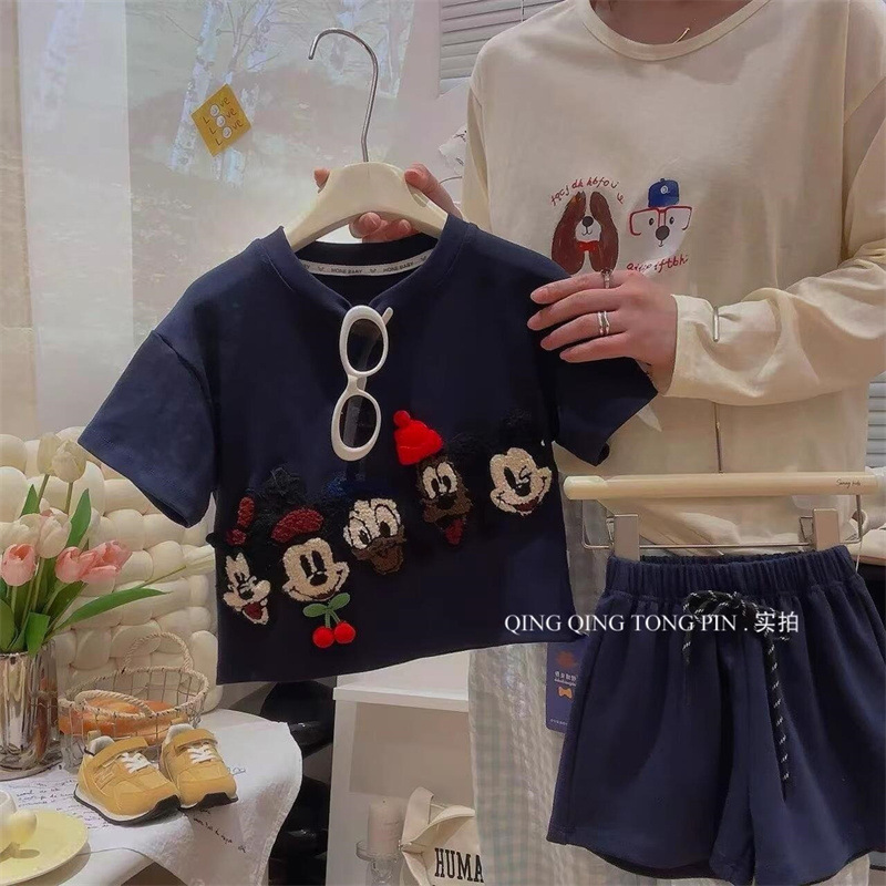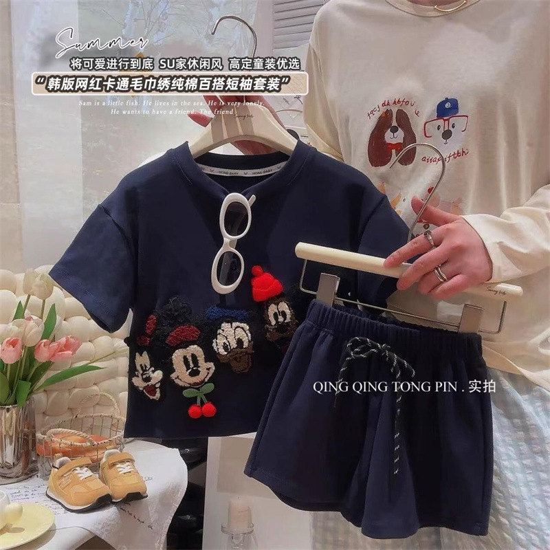 [라임] 여자 한국식 만화 네이비 타월 자수 짧은 소매 반바지 세트 25 여름 유행 투피스 세트스토어 가기
