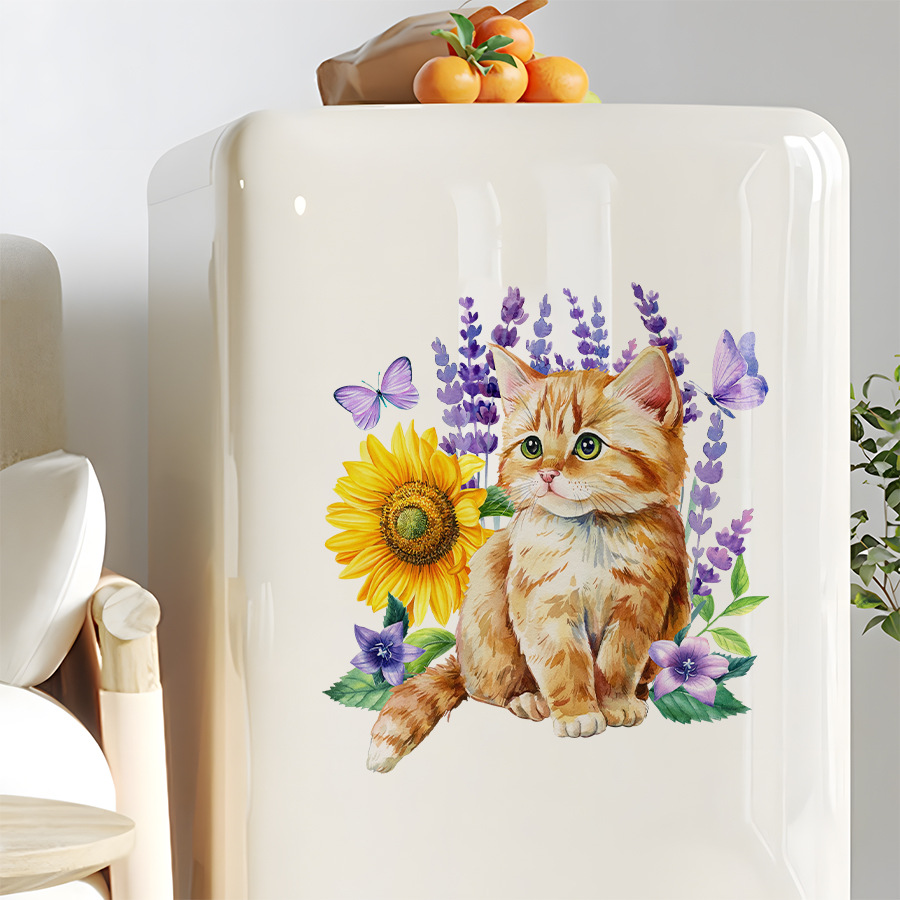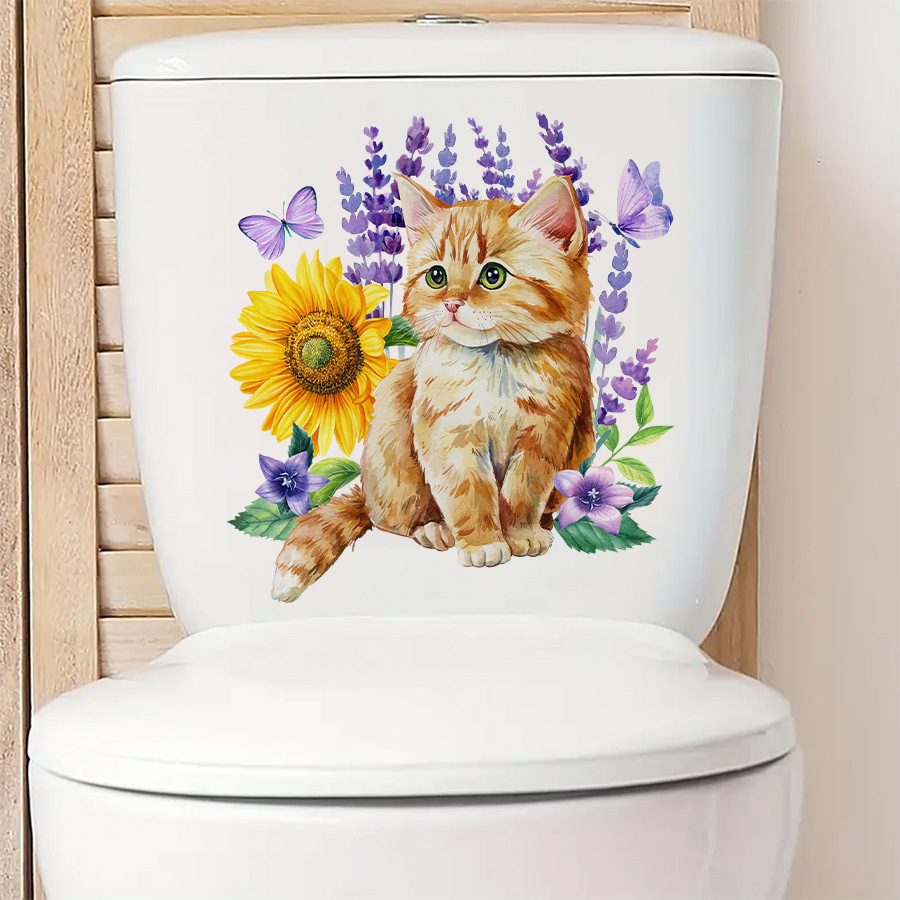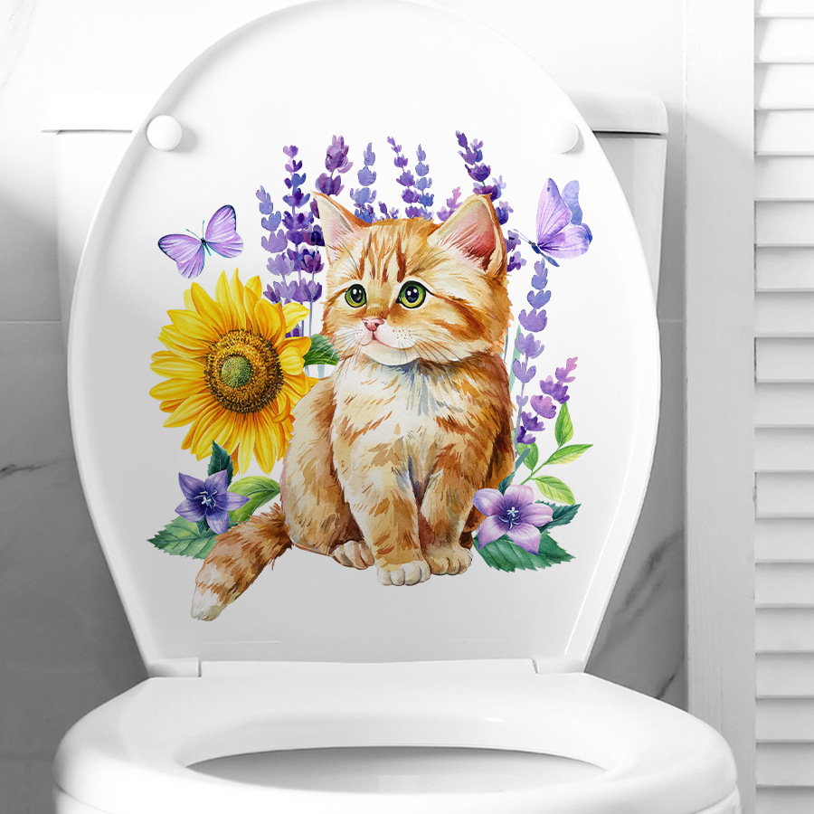 BR3613C 만화 고양이 해바라기 라벤더 식물 꽃 자체 접착 화장실 스티커 욕실 장식 스티커