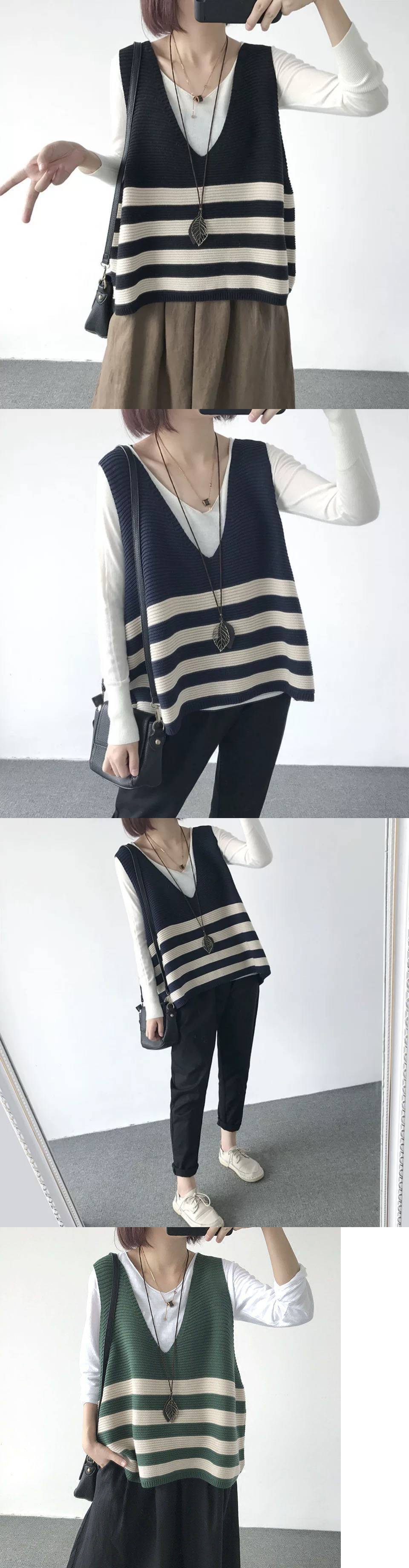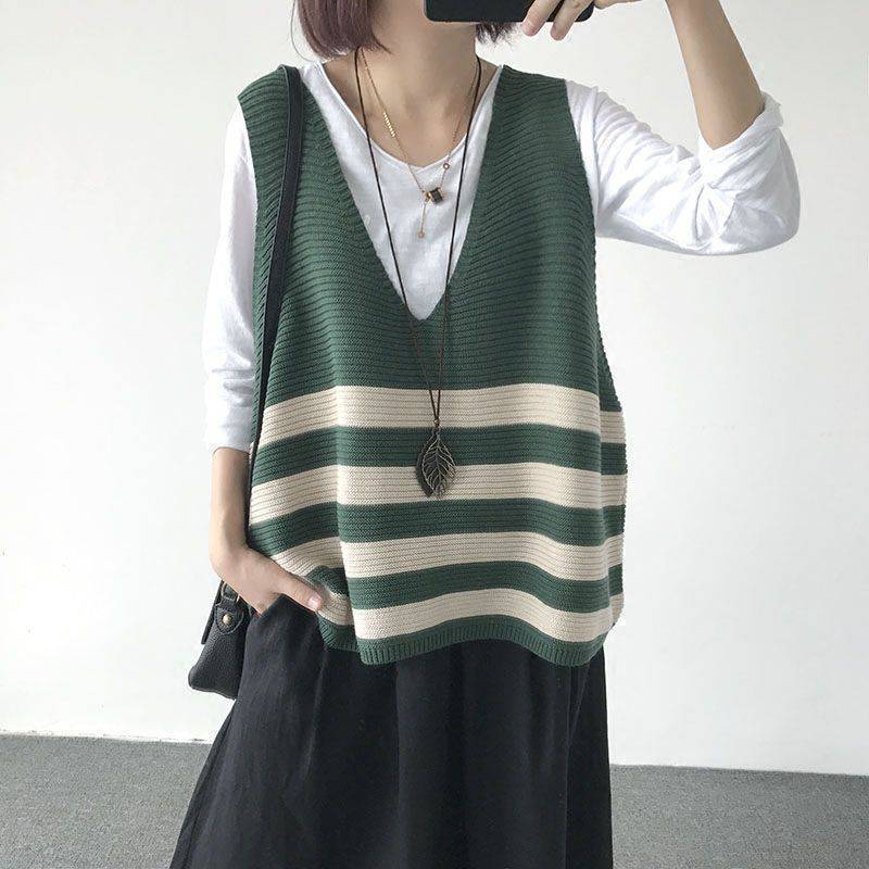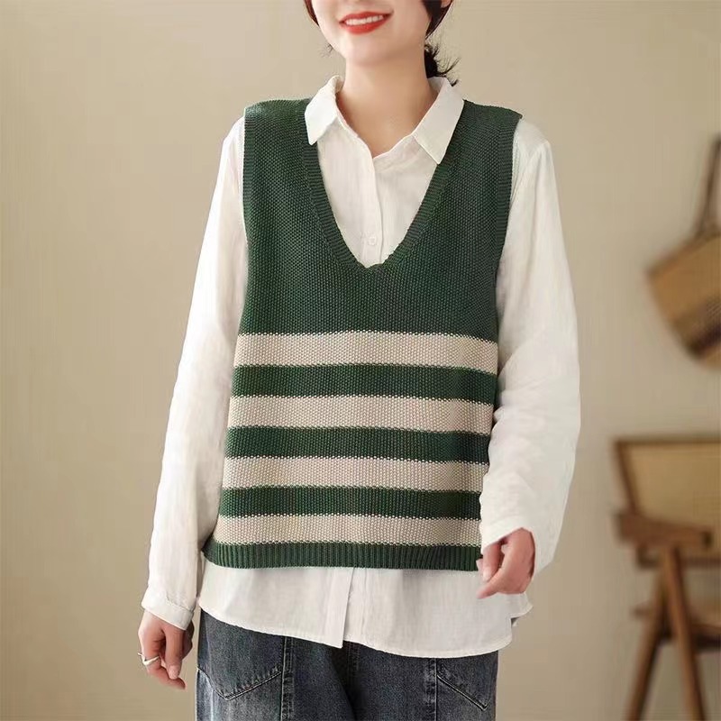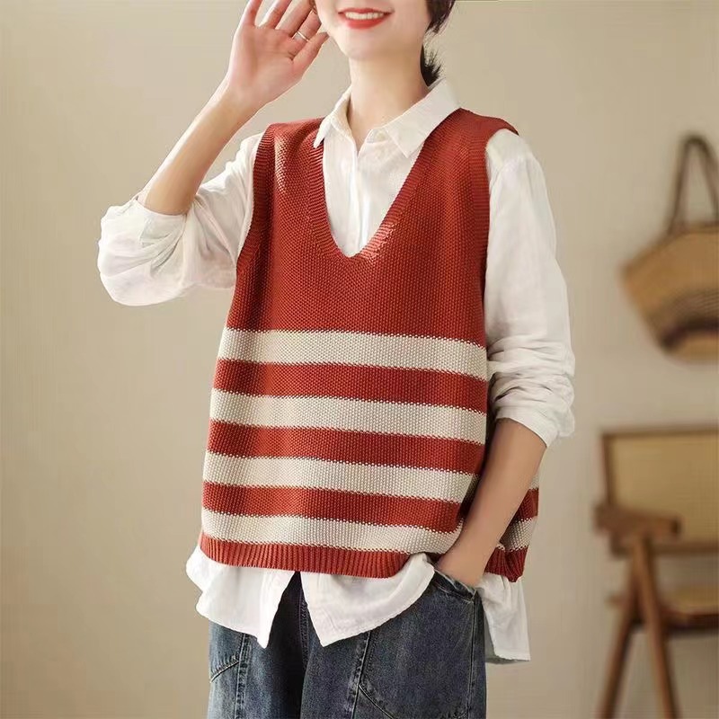 2026 봄 신상품 예술적인 레트로 스타일 민소매 V넥 루즈핏 풀오버 배색 스트라이프 코튼 조끼 여성용스토어 가기