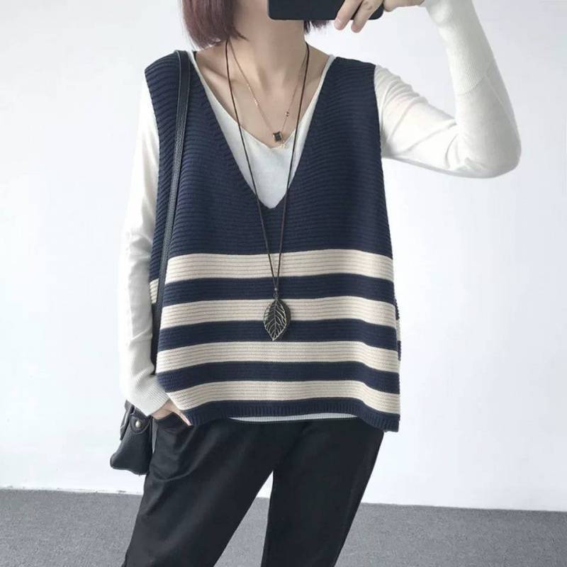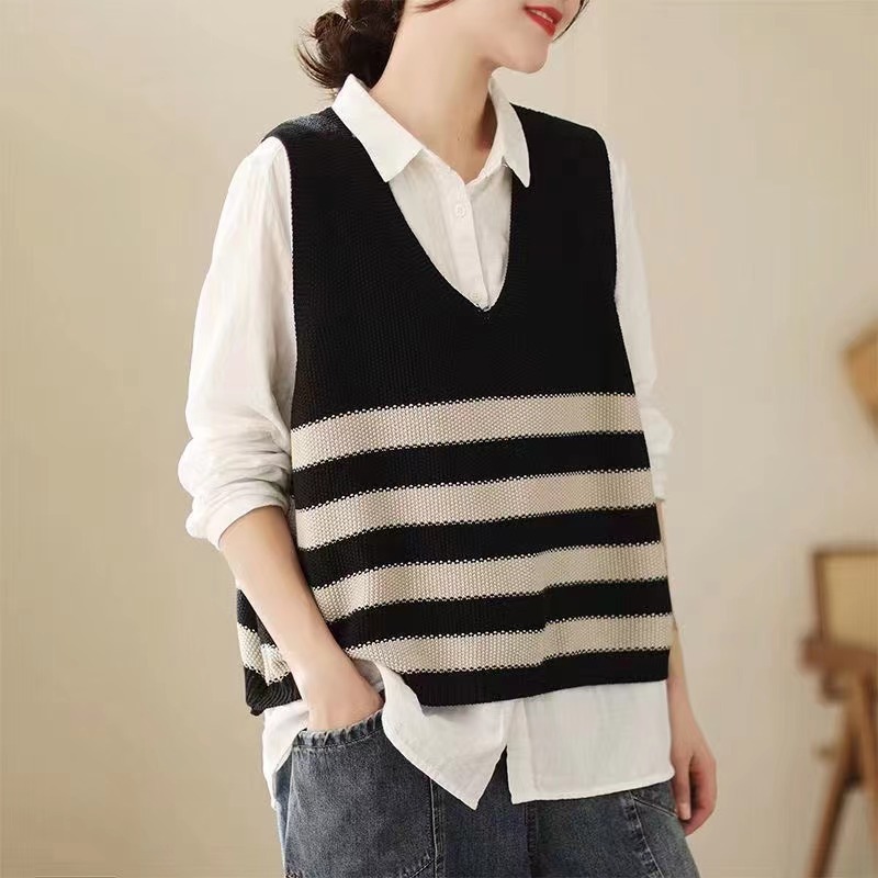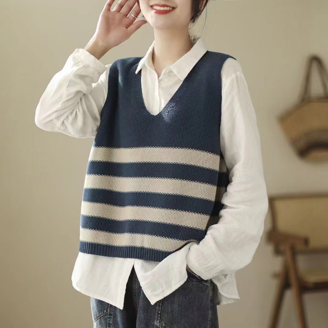 2026 봄 신상품 예술적인 레트로 스타일 민소매 V넥 루즈핏 풀오버 배색 스트라이프 코튼 조끼 여성용