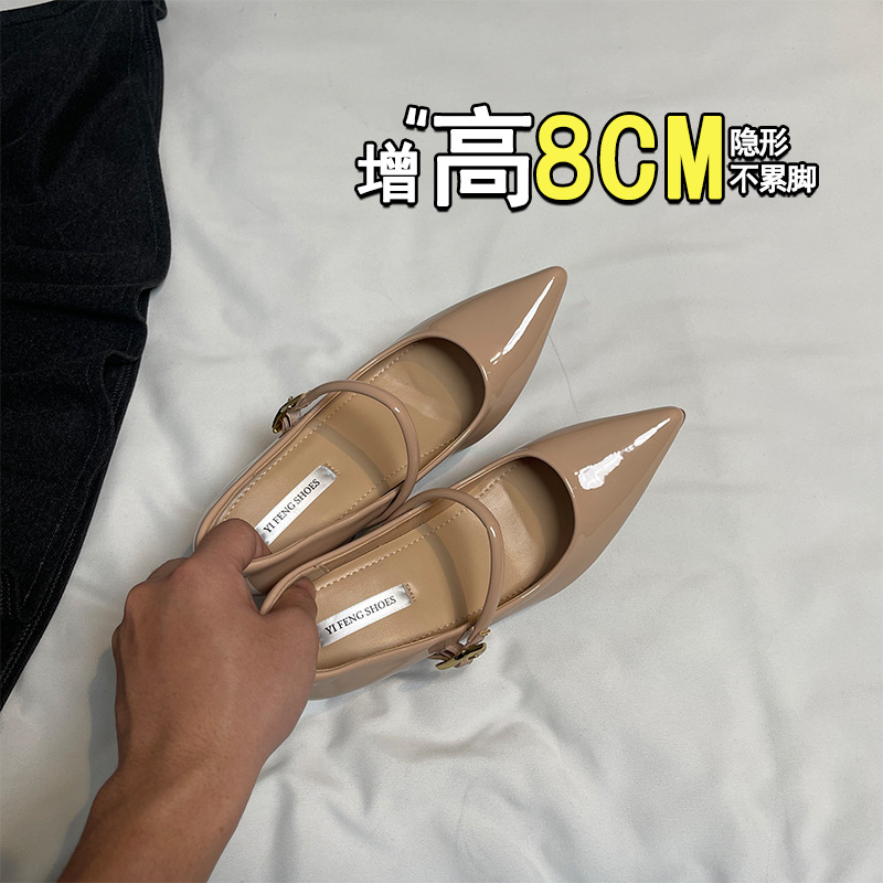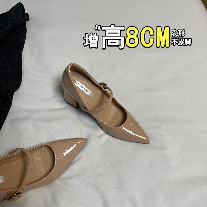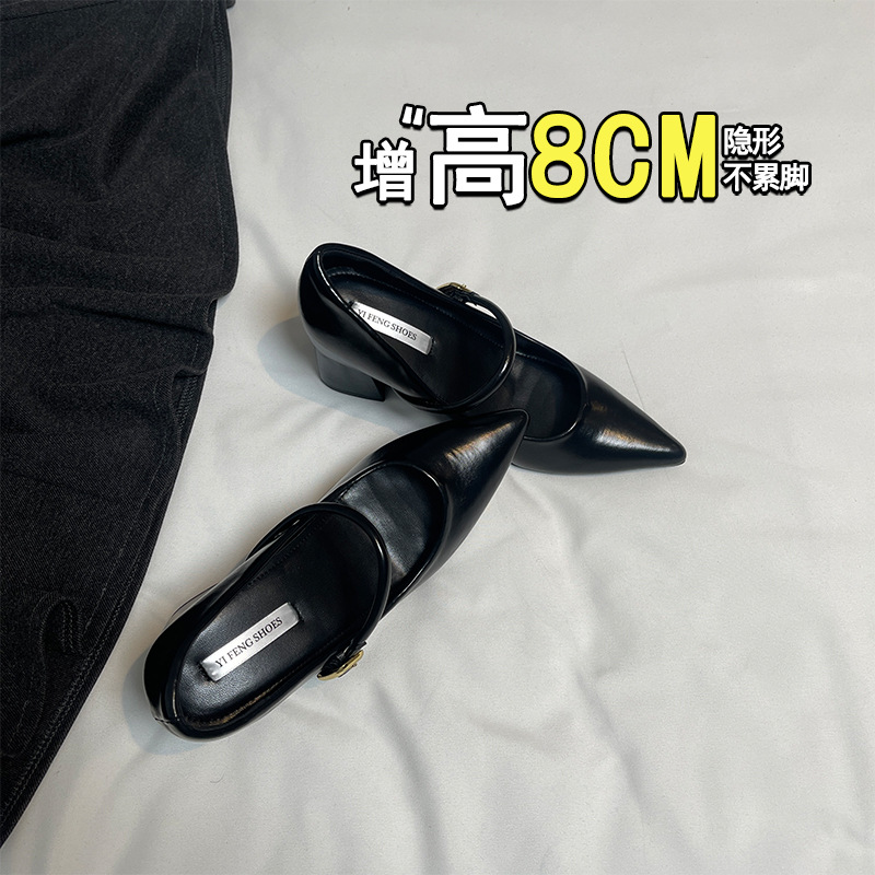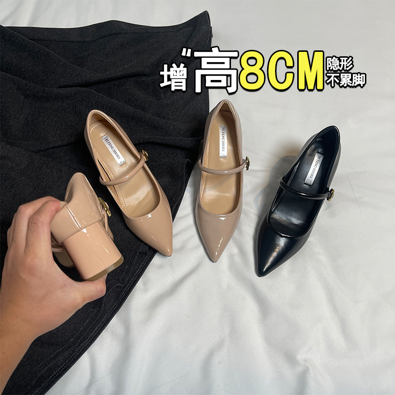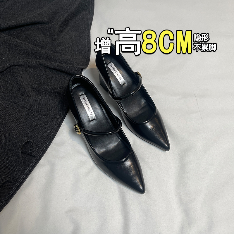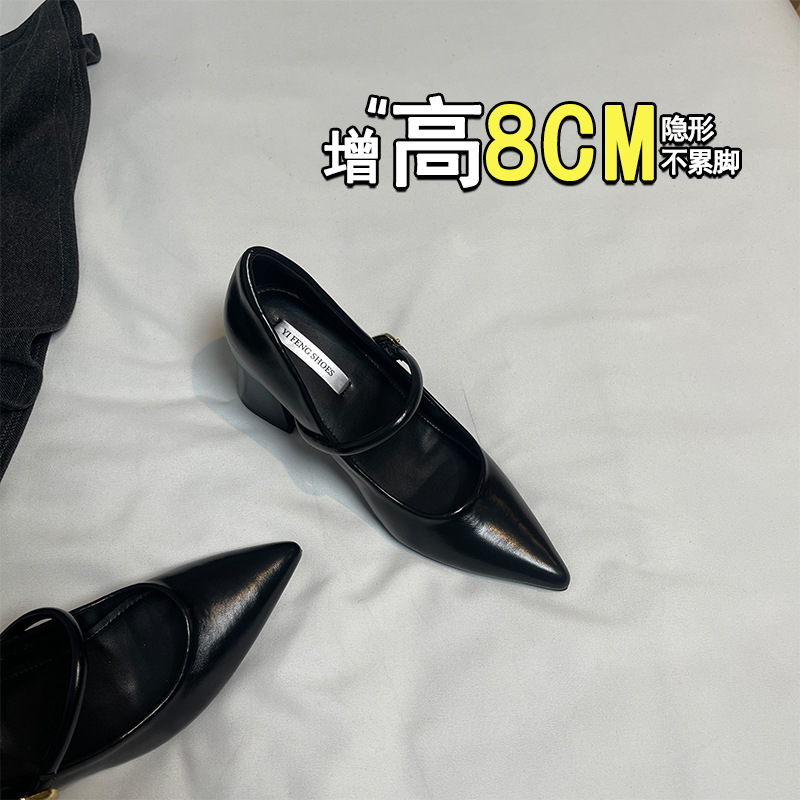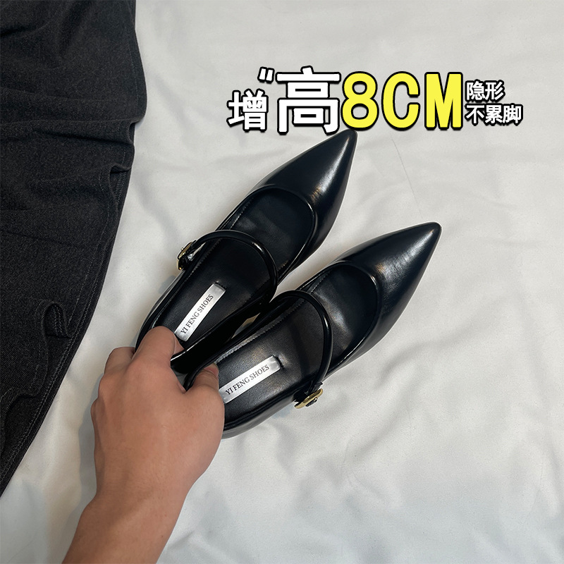 양가죽 뾰족한 보이지 않는 높이 증가 하이힐 하이힐 신발의 쁘띠 여성 2025 새로운 올매치 거친 뒤꿈치 싱글 레이어 신발스토어 가기