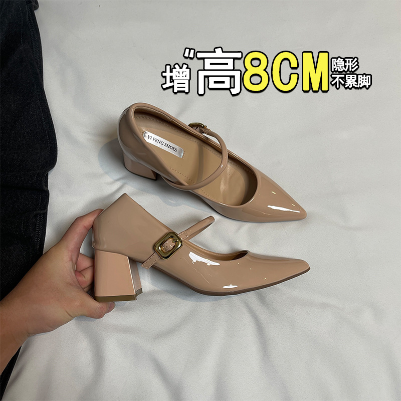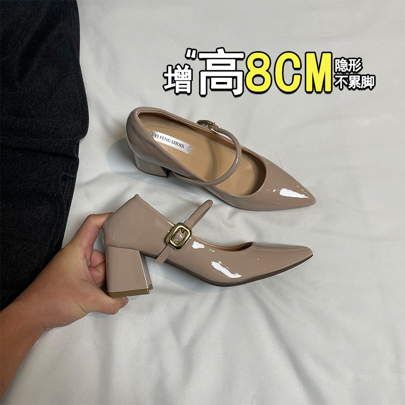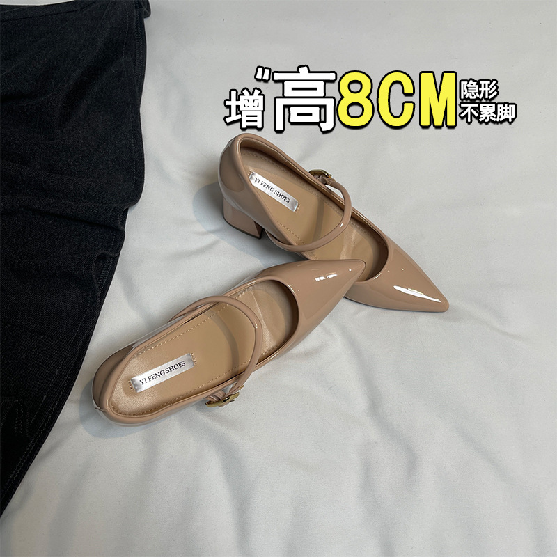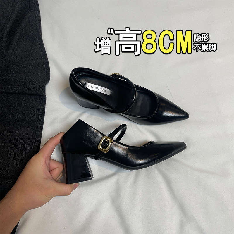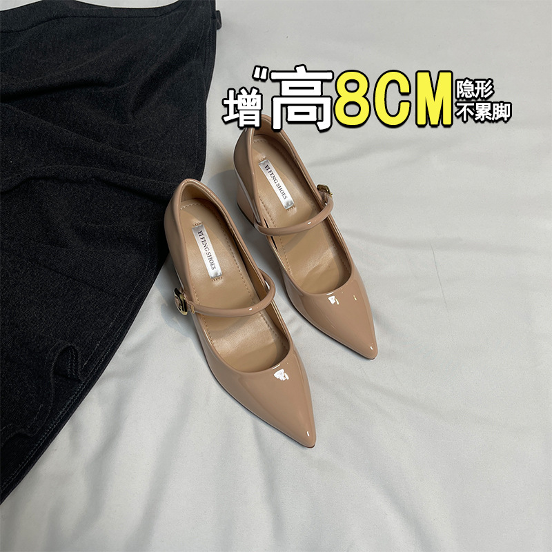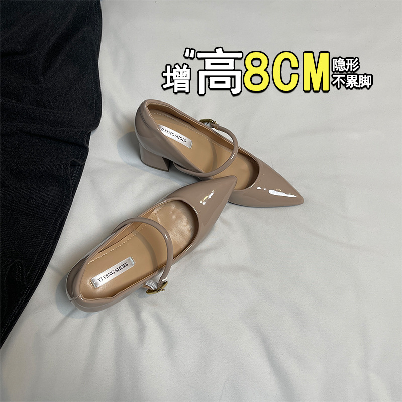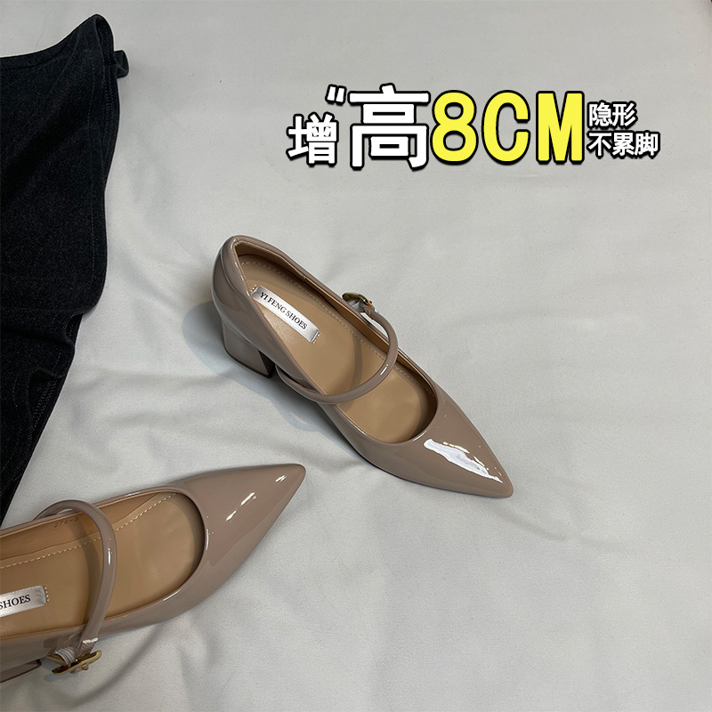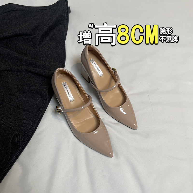 양가죽 뾰족한 보이지 않는 높이 증가 하이힐 하이힐 신발의 쁘띠 여성 2025 새로운 올매치 거친 뒤꿈치 싱글 레이어 신발스토어 가기