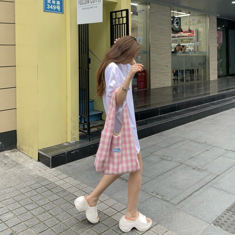 새로운 캐주얼 올 매치 체크 무늬 캔버스 어깨 가방 여성 대학생 학교 가방 휴대용 대용량 크로스 바디 백스토어 가기