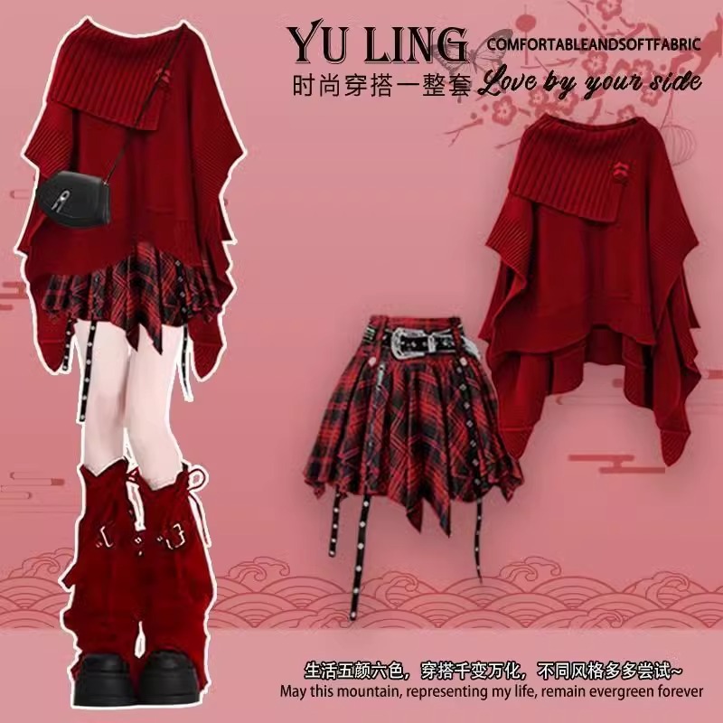 이른 봄 부드럽고 달콤한 착용 여성의 2025 새로운 디자인 센스 레드 망토 불규칙한 스커트 투피스 세트스토어 가기