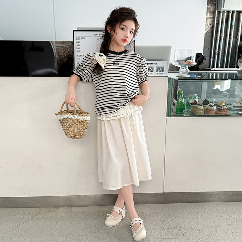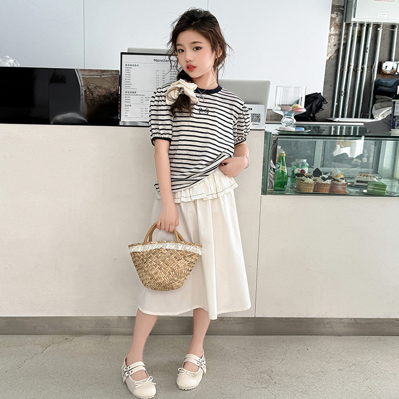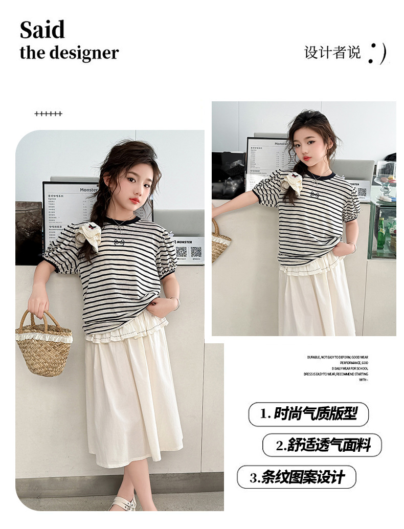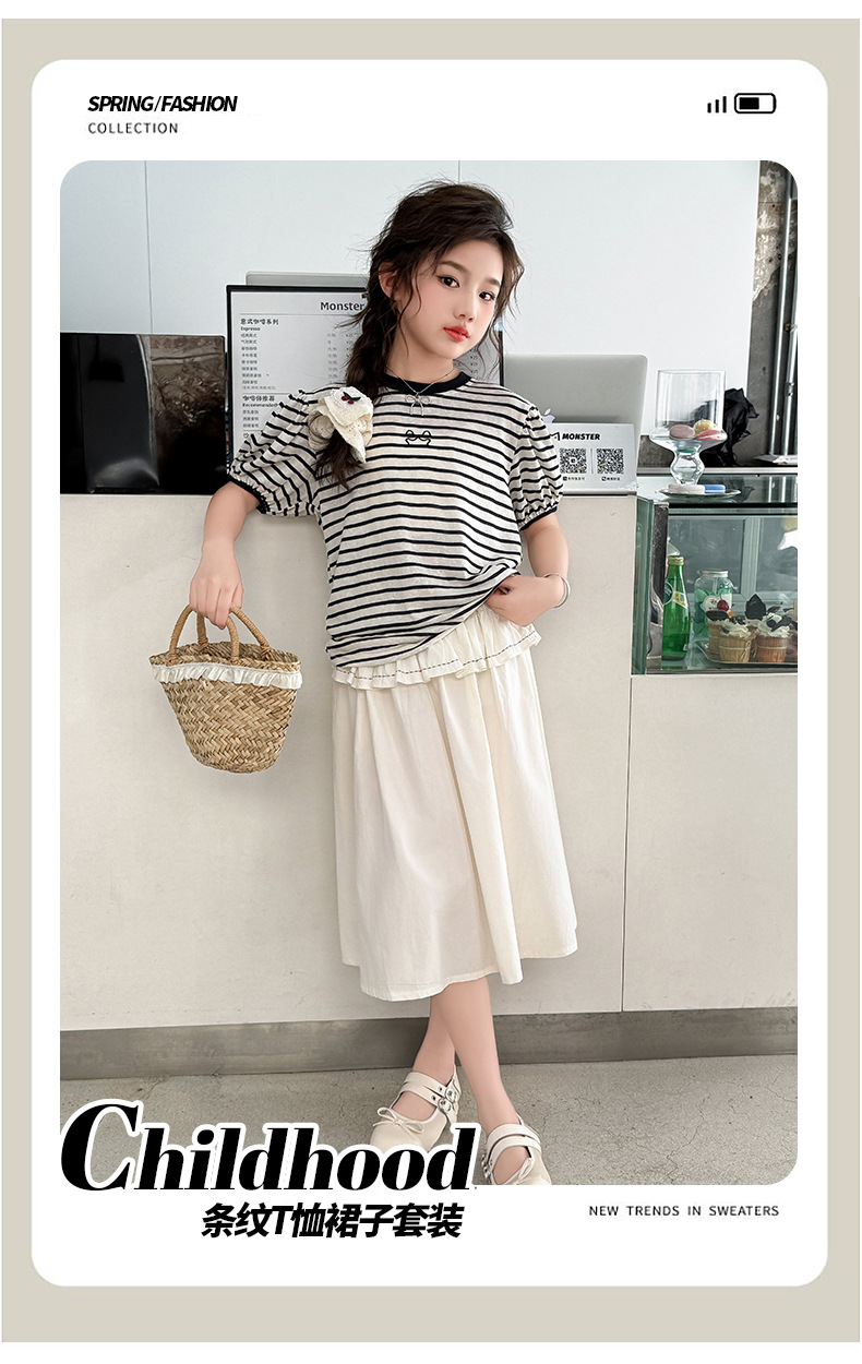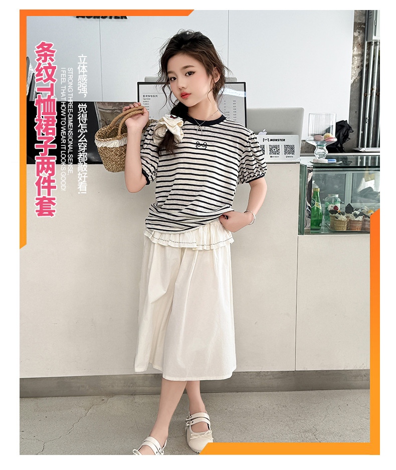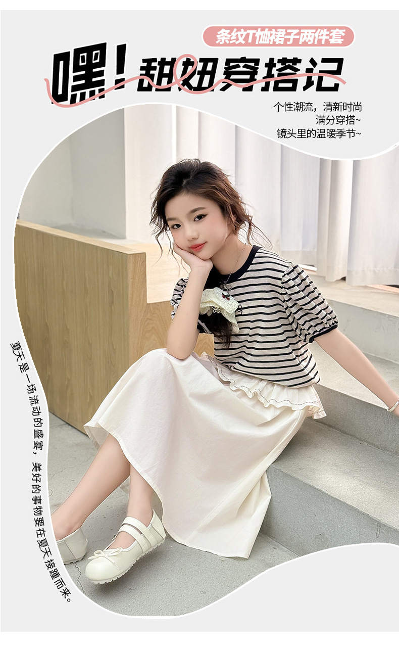 소녀들의 여름 원피스 세트 2025 새로운 어린이 여름 캐주얼 줄무늬 어린이를위한 반팔 유행 투피스 스커트