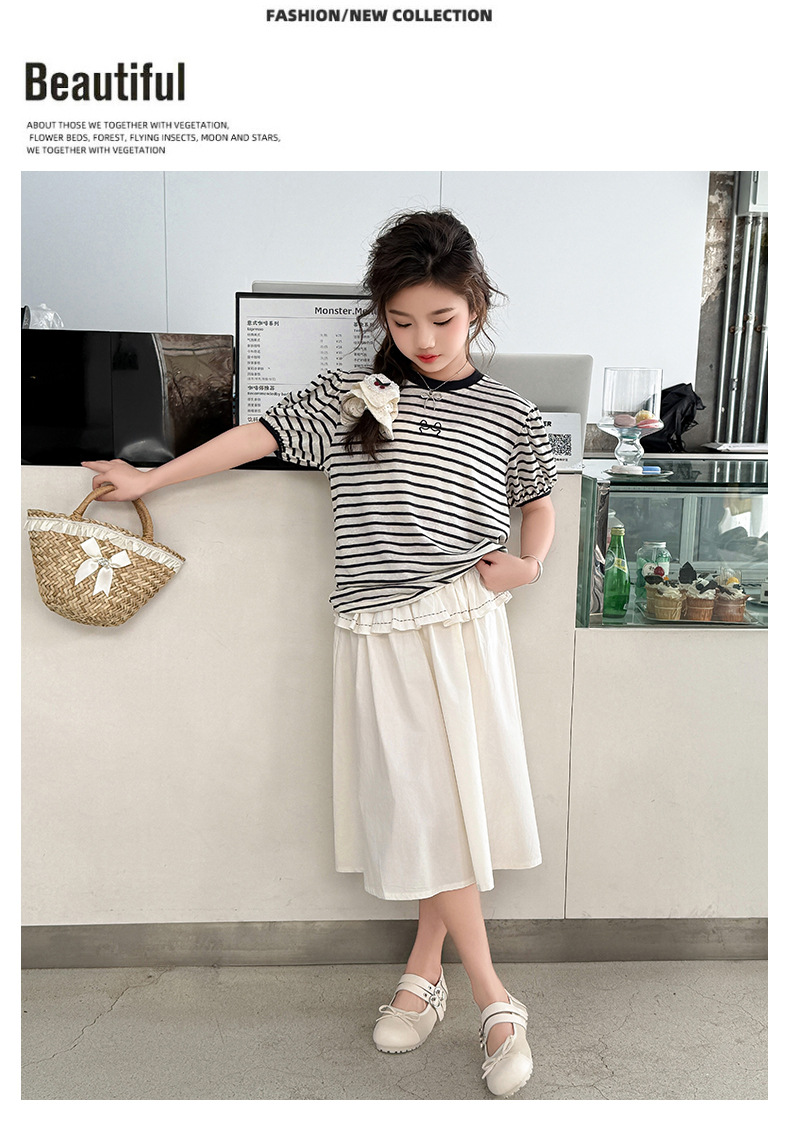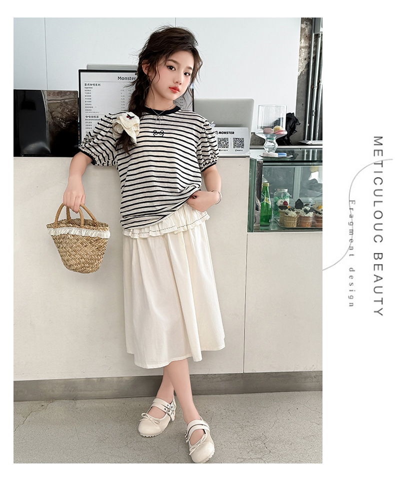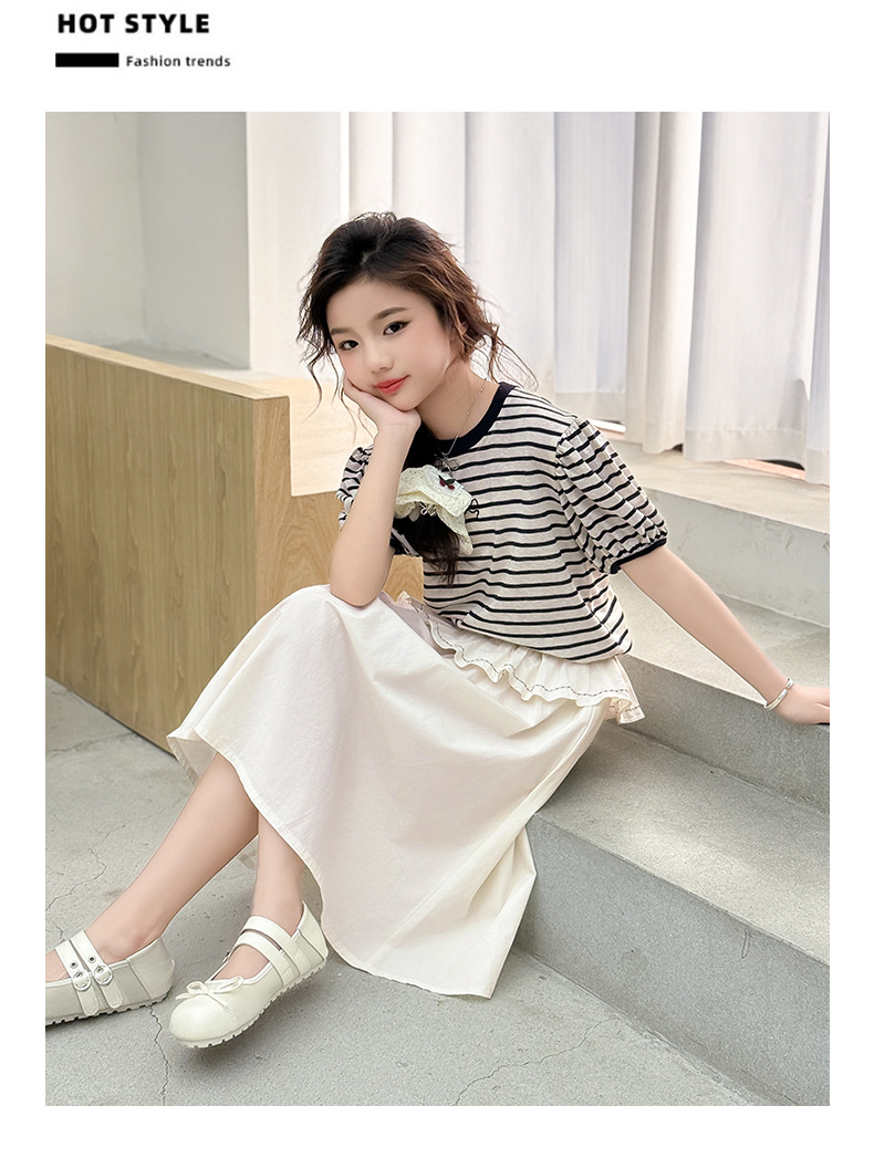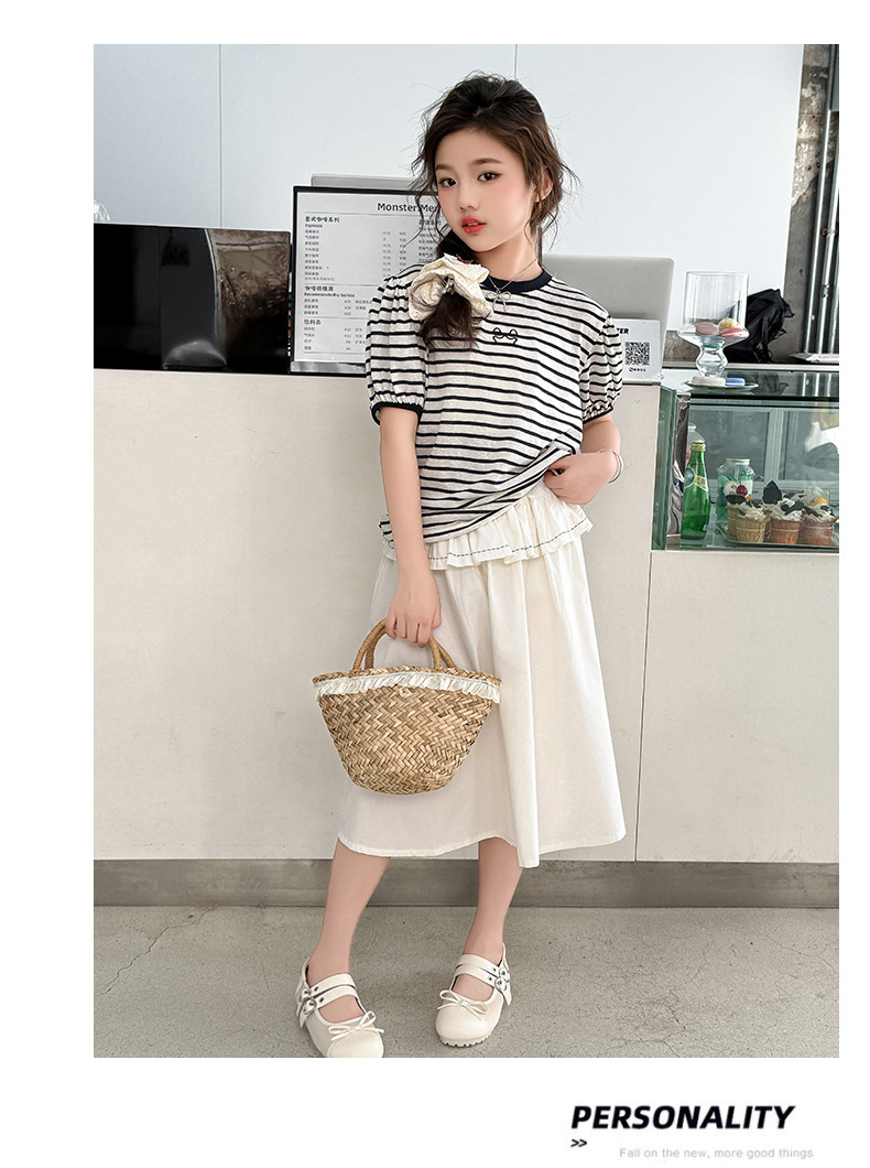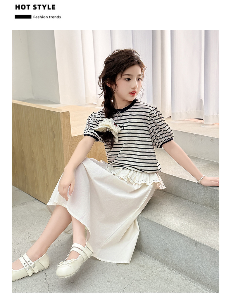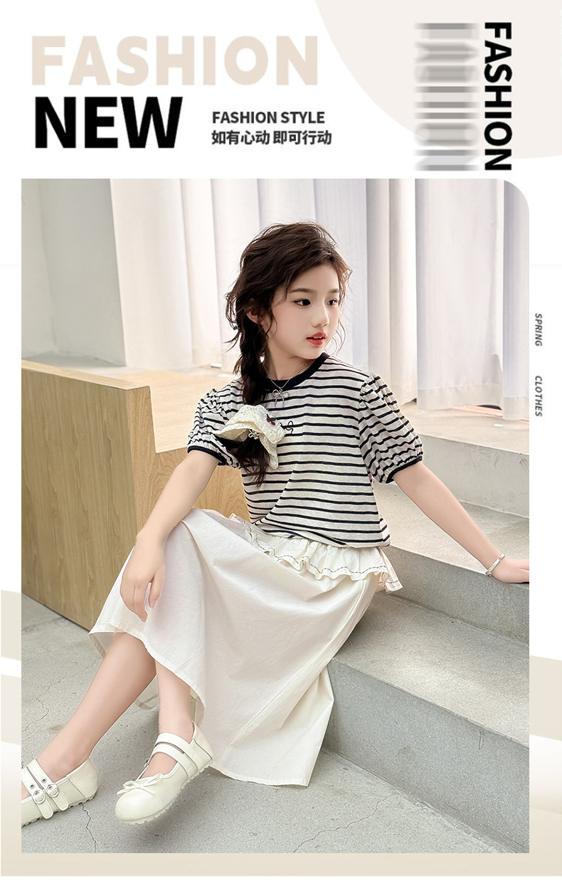 소녀들의 여름 원피스 세트 2025 새로운 어린이 여름 캐주얼 줄무늬 어린이를위한 반팔 유행 투피스 스커트