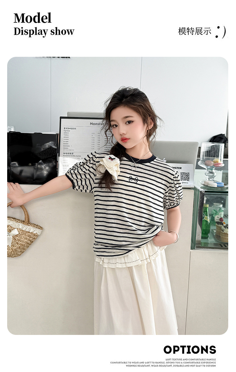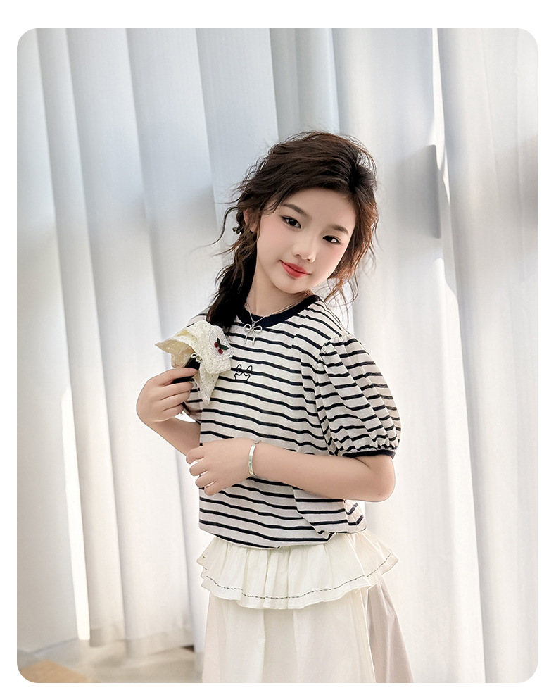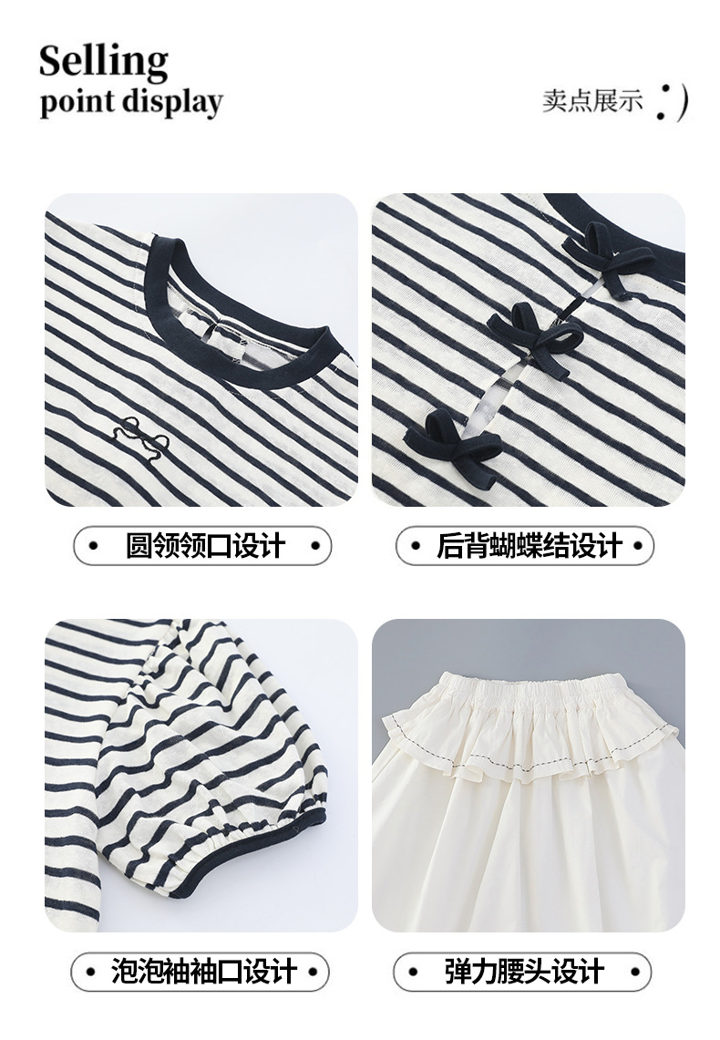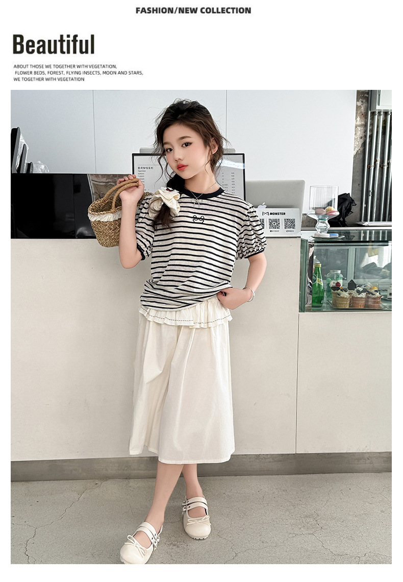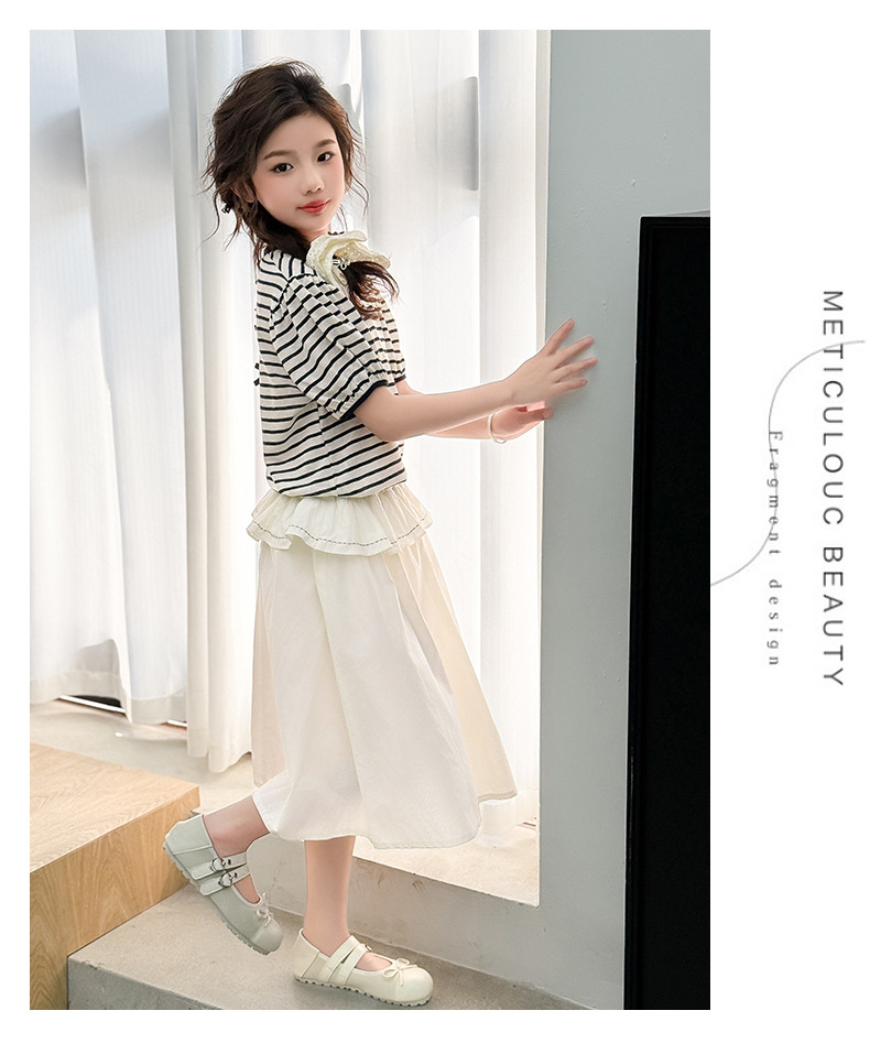 소녀들의 여름 원피스 세트 2025 새로운 어린이 여름 캐주얼 줄무늬 어린이를위한 반팔 유행 투피스 스커트