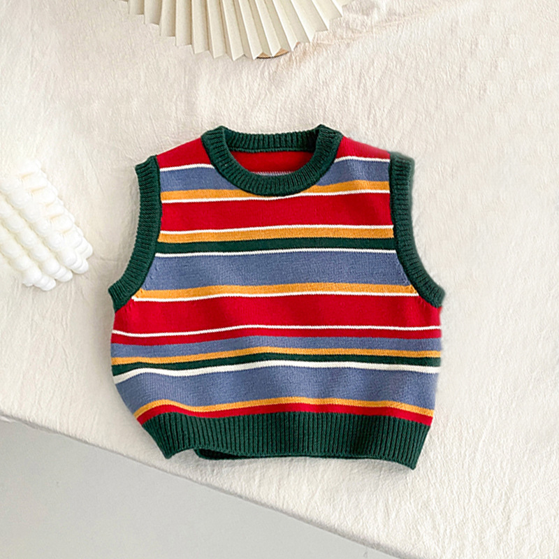 어린이 조끼 봄과 가을 서양 스타일 니트 스웨터 라운드 넥 아카데미 스타일 레트로 패션 스트라이프 스웨터 유행 소년 소녀를위한 유행