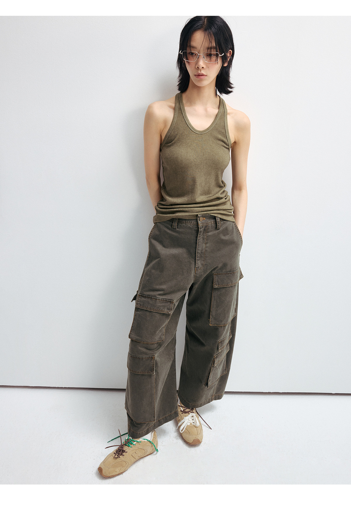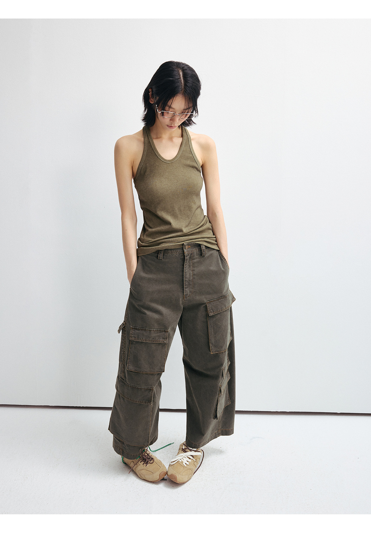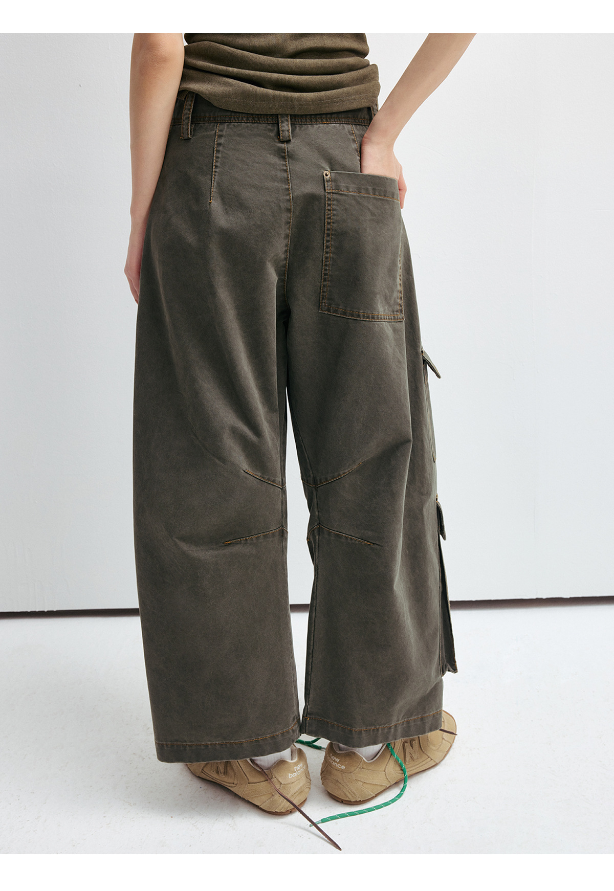 [언제 알아] 새로운 면화 느슨한 넓은 다리 바지 느낌 거리 트렌드 포켓 바지 여성 V8013