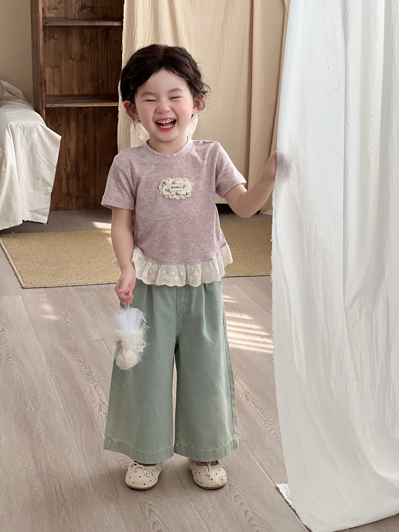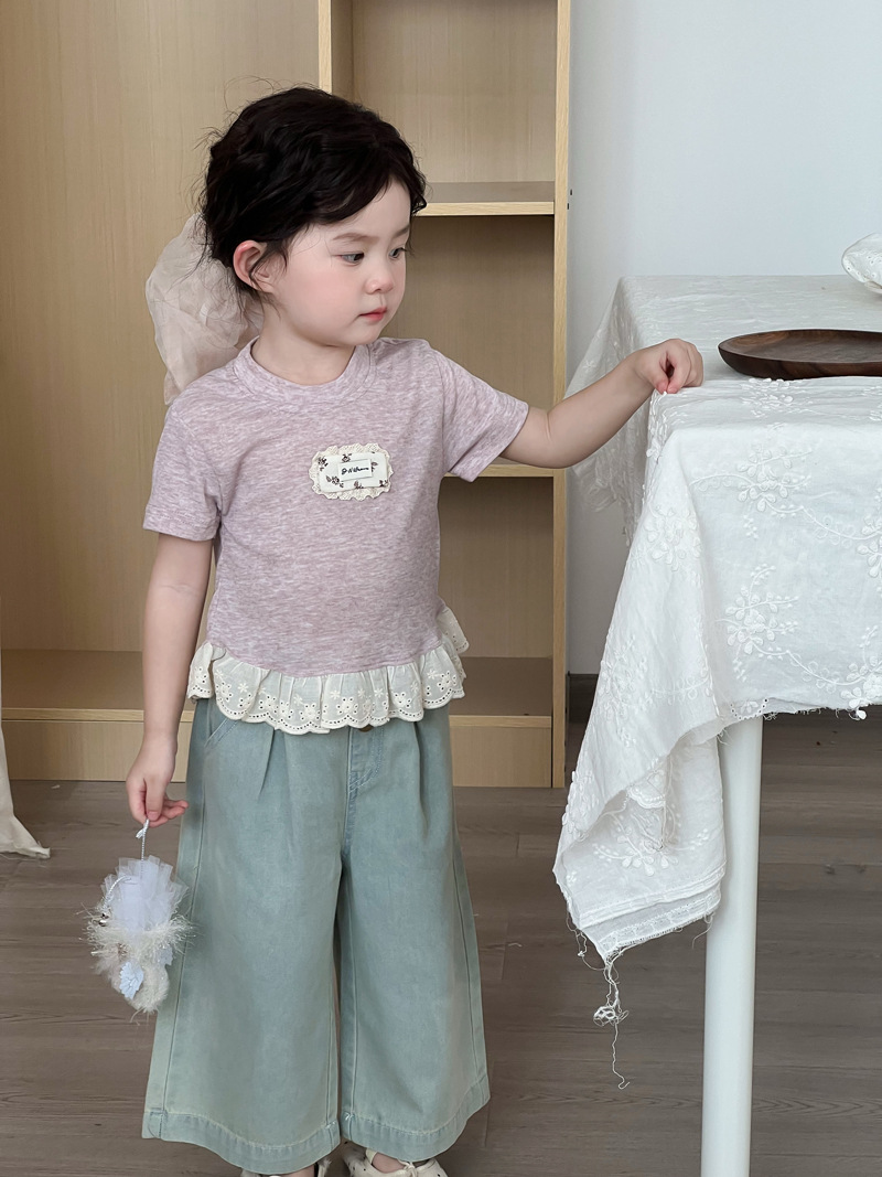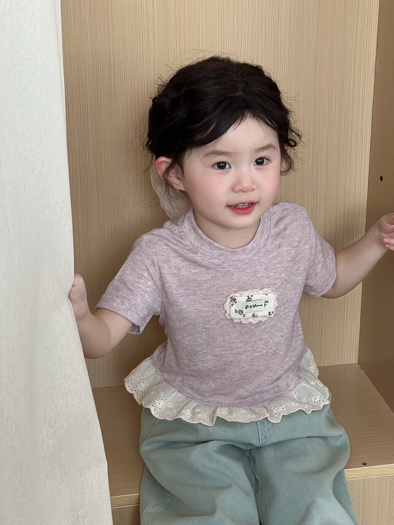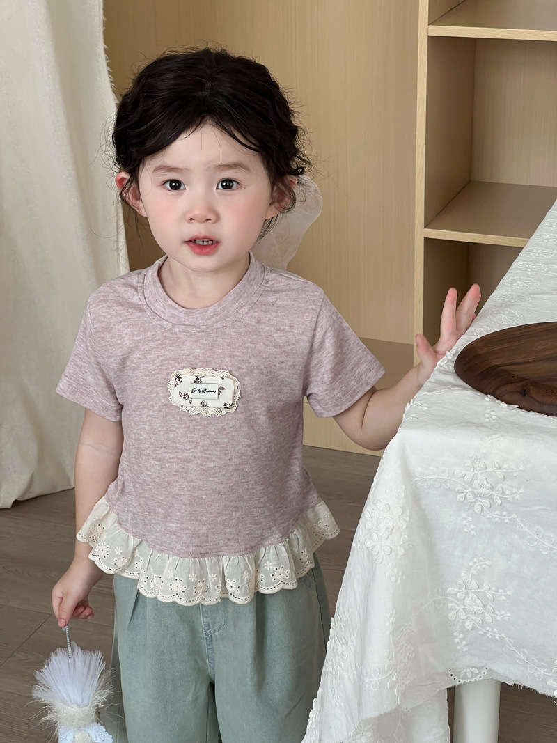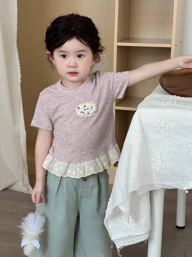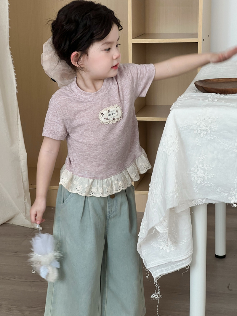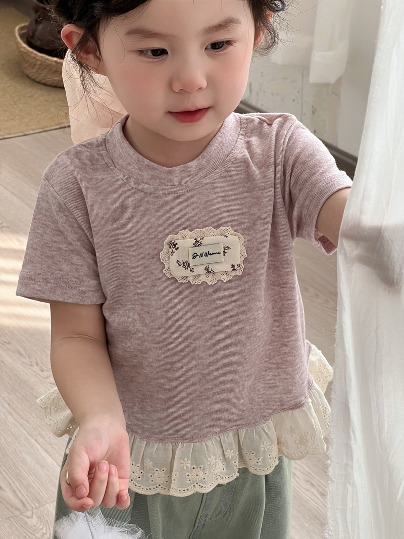 밀밭 시즌 2025 여름 새 한국 여자 레이스 레이스 티셔츠 어린이 공주 유행 반소매 탑 티셔츠