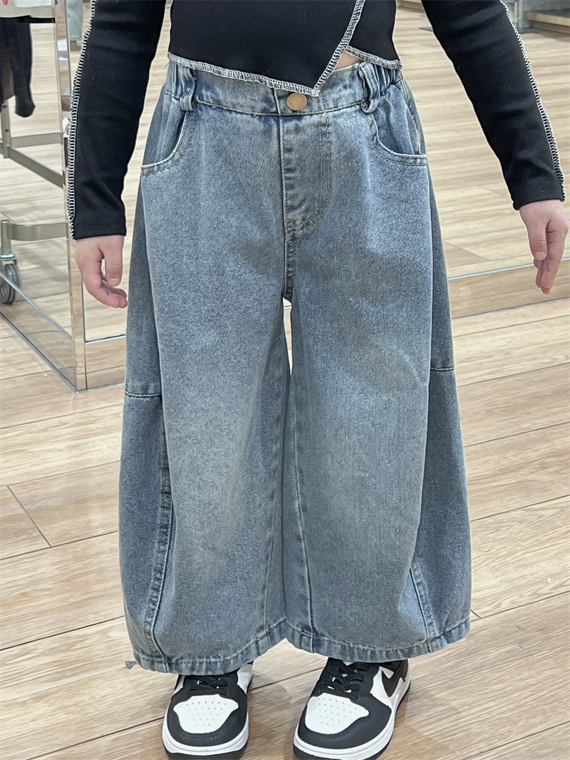 2025 가을 신상 한국 스타일 아동복 여아용 스타일리시한 롱 슬리브 숏 티셔츠 와이드 레그 데님 팬츠