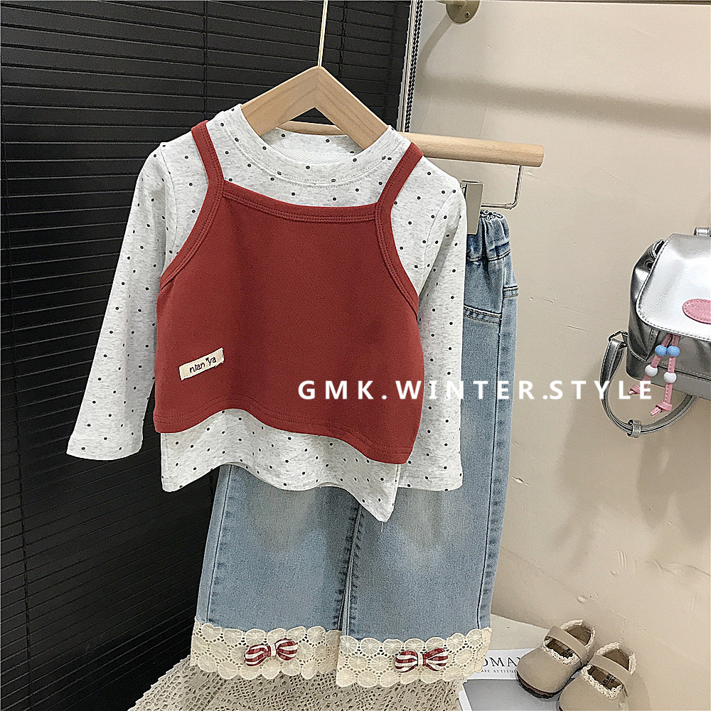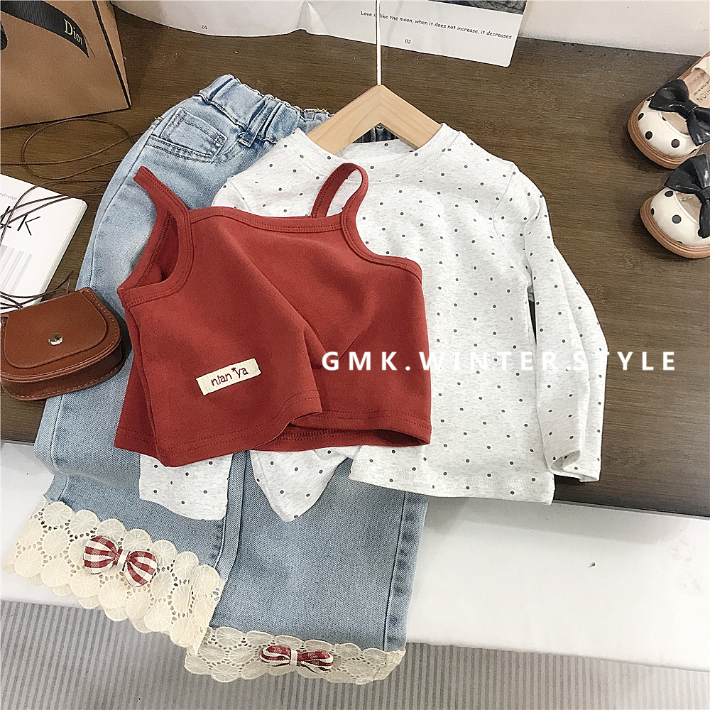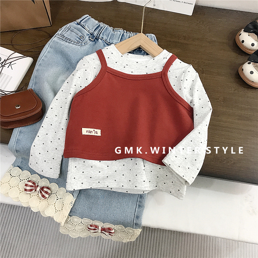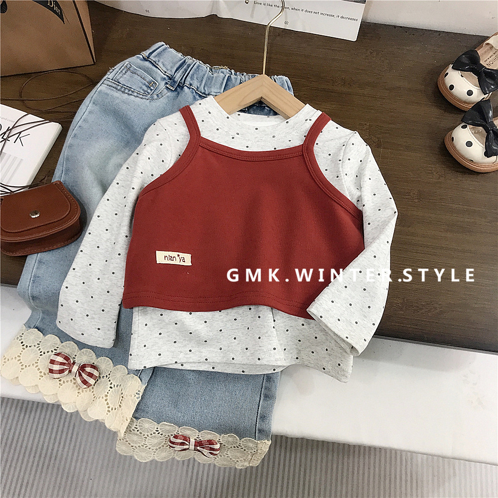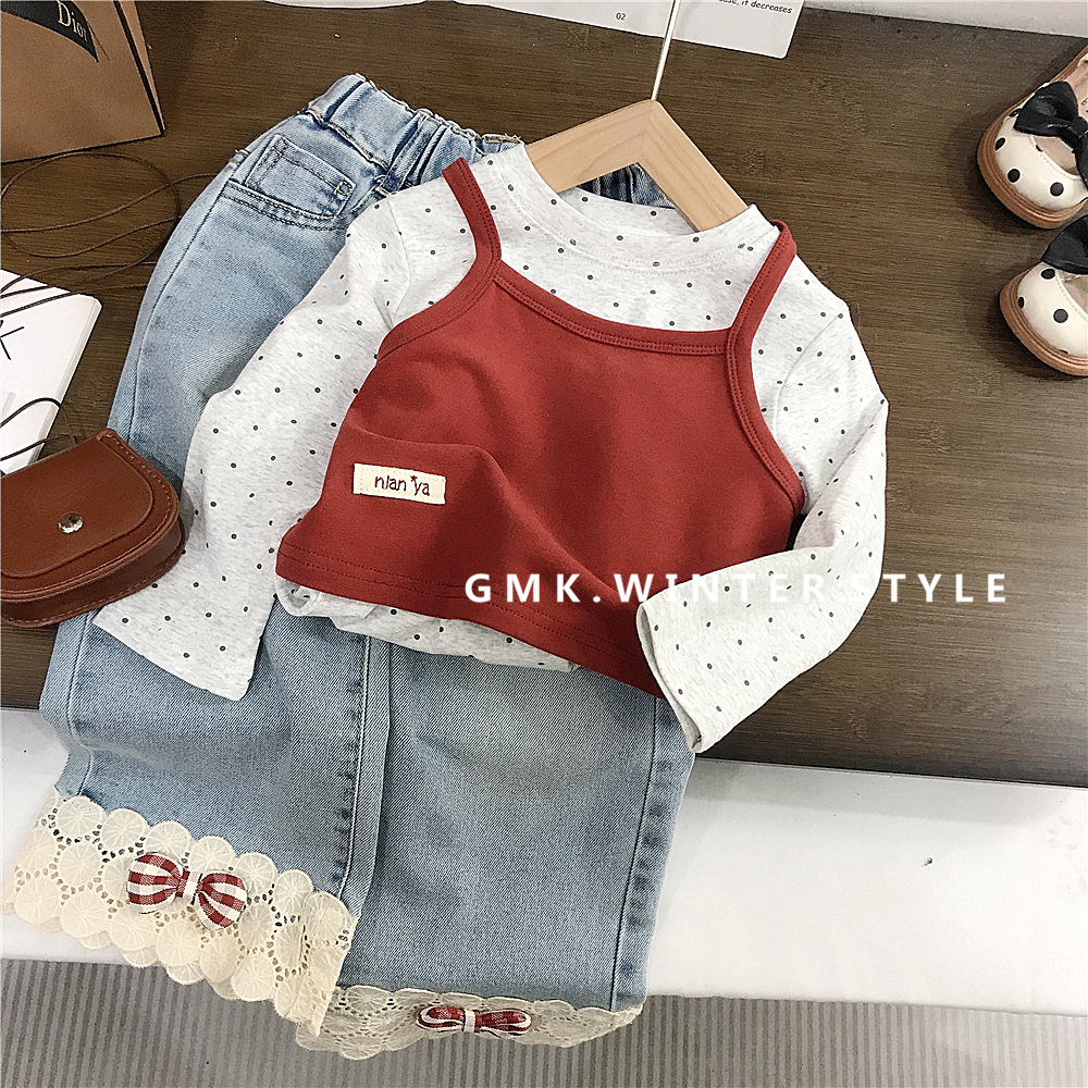 여자 슬링 세트 한국 봄 새 아이들 한국 긴 소매 티셔츠 아기 소녀 레이스 청바지 대외 무역스토어 가기