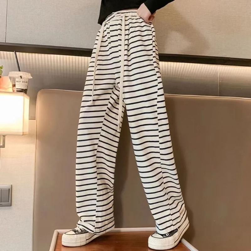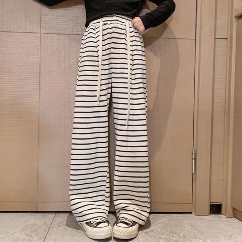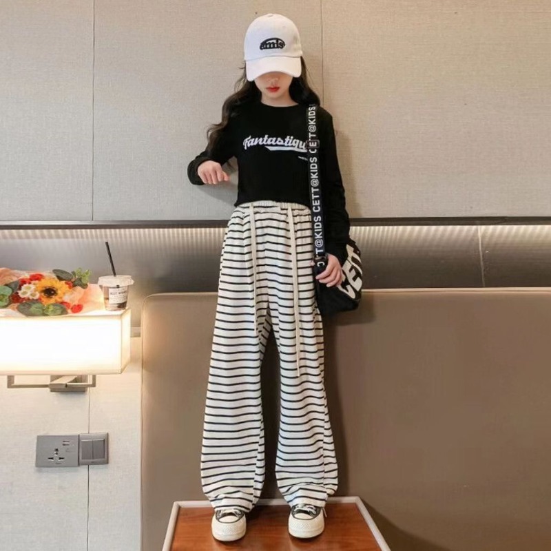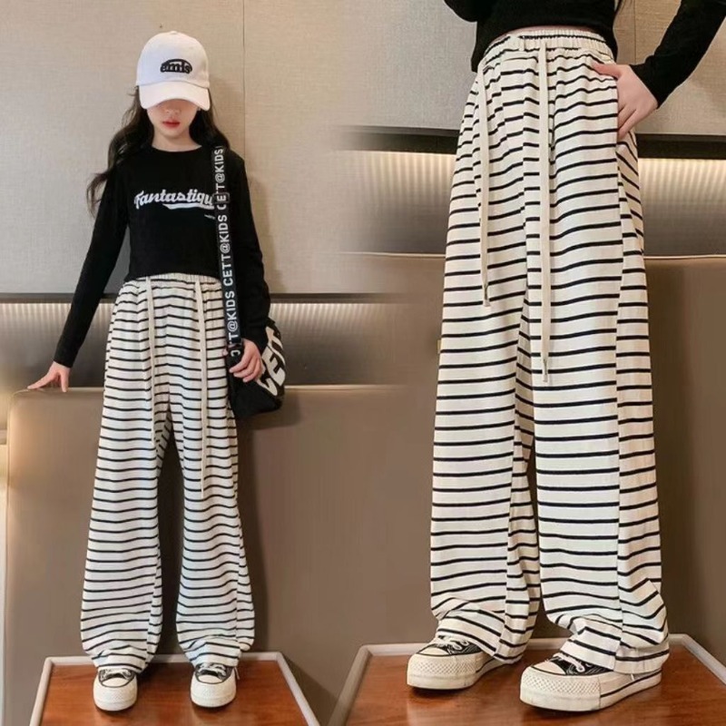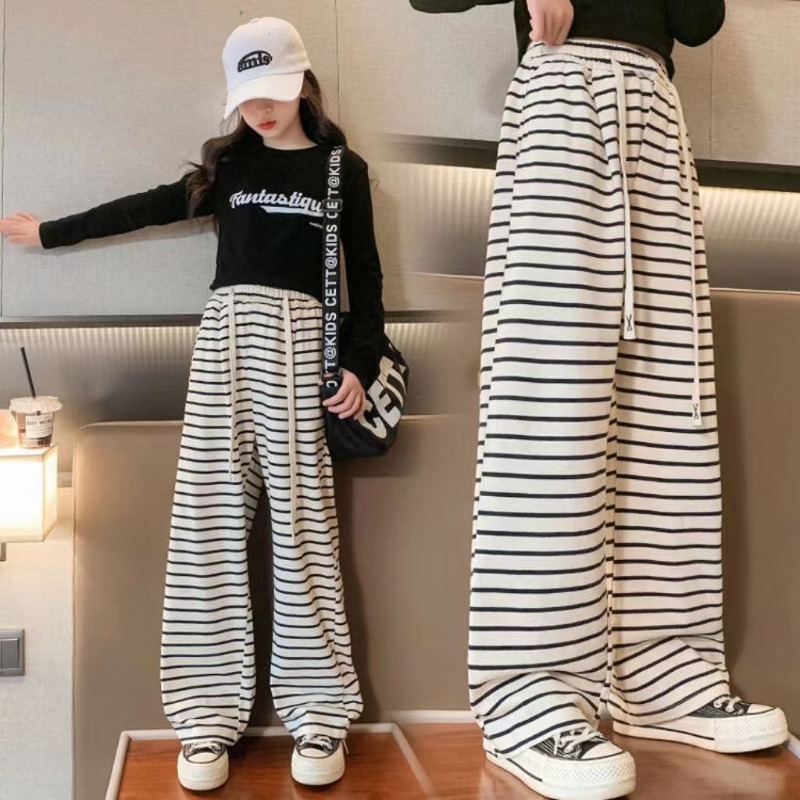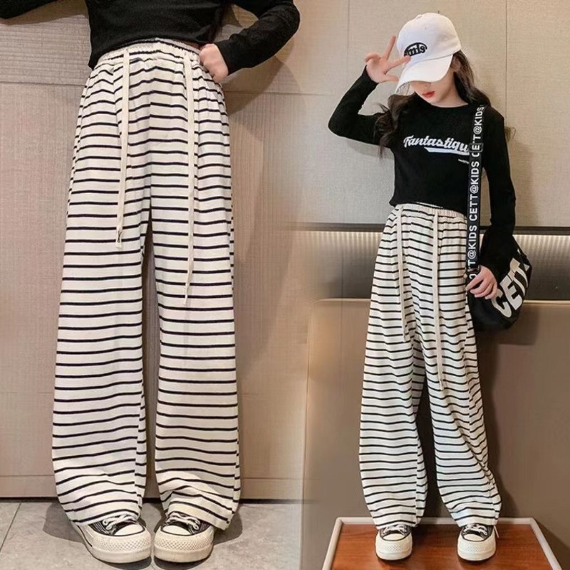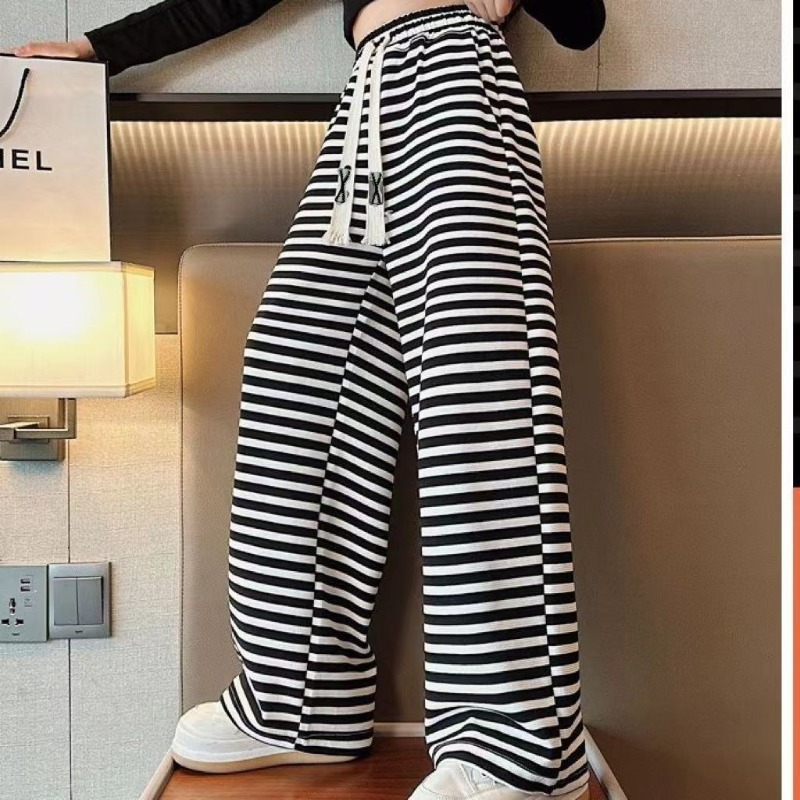 소녀 바지 봄 복장 2025 새로운 봄 중간 및 큰 어린이 흑백 줄무늬 넓은 다리 바지 봄과 여름 어린이 땀 바지스토어 가기
