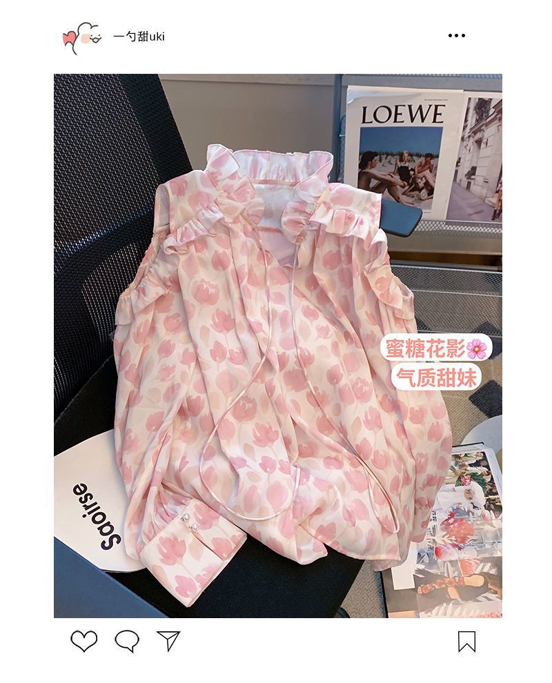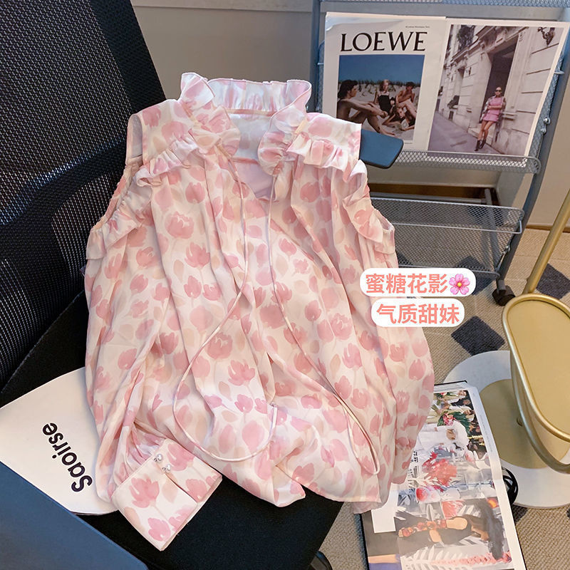 프랑스 스타일 부드러운 홀리데이 스타일 오픈 숄더 플로랄 쉬폰 셔츠 여성의 2024 여름 새로운 디자인 센스 러플 셔츠