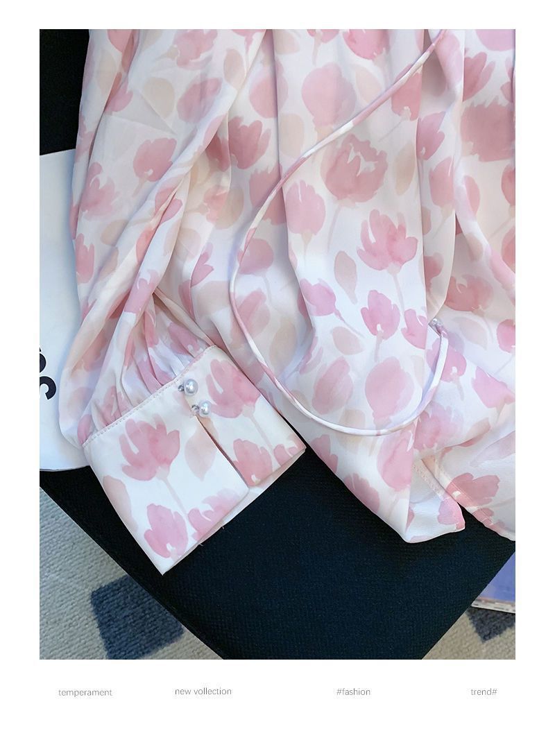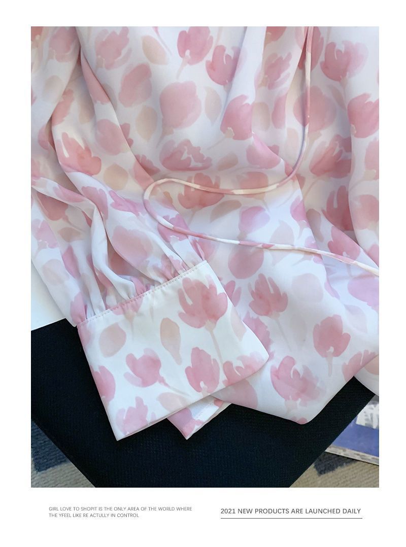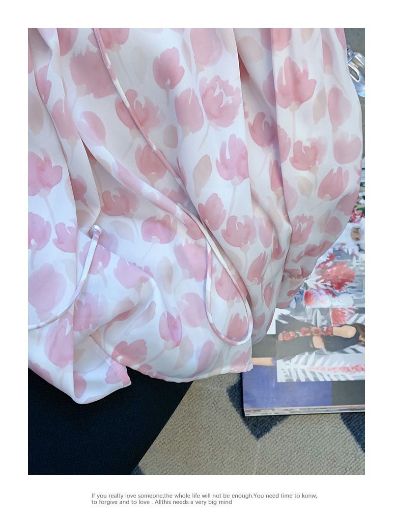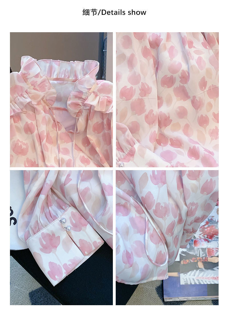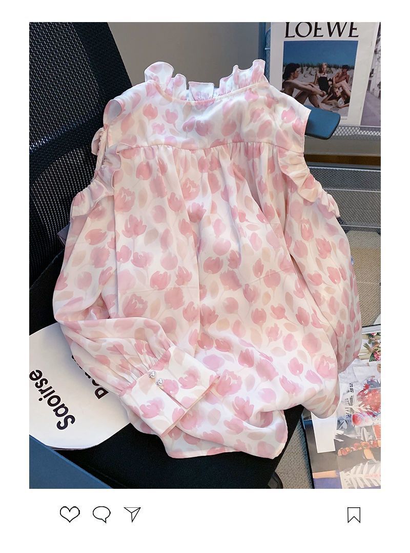프랑스 스타일 부드러운 홀리데이 스타일 오픈 숄더 플로랄 쉬폰 셔츠 여성의 2024 여름 새로운 디자인 센스 러플 셔츠스토어 가기