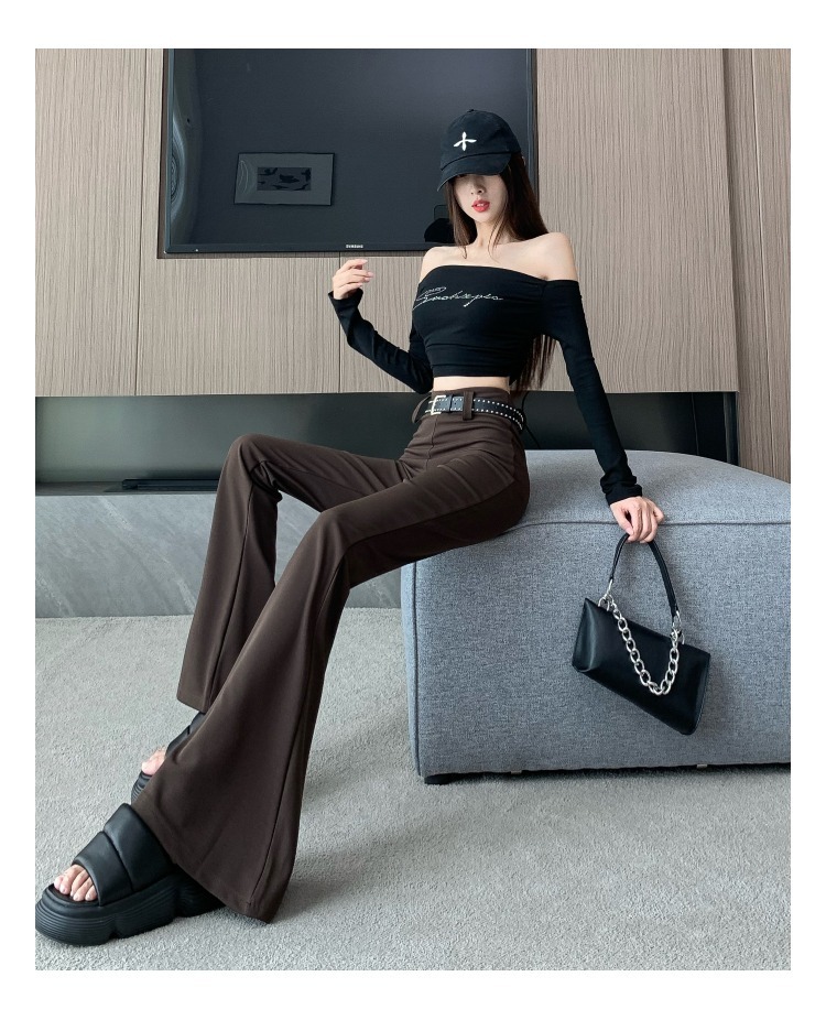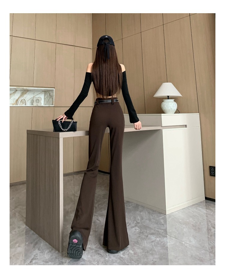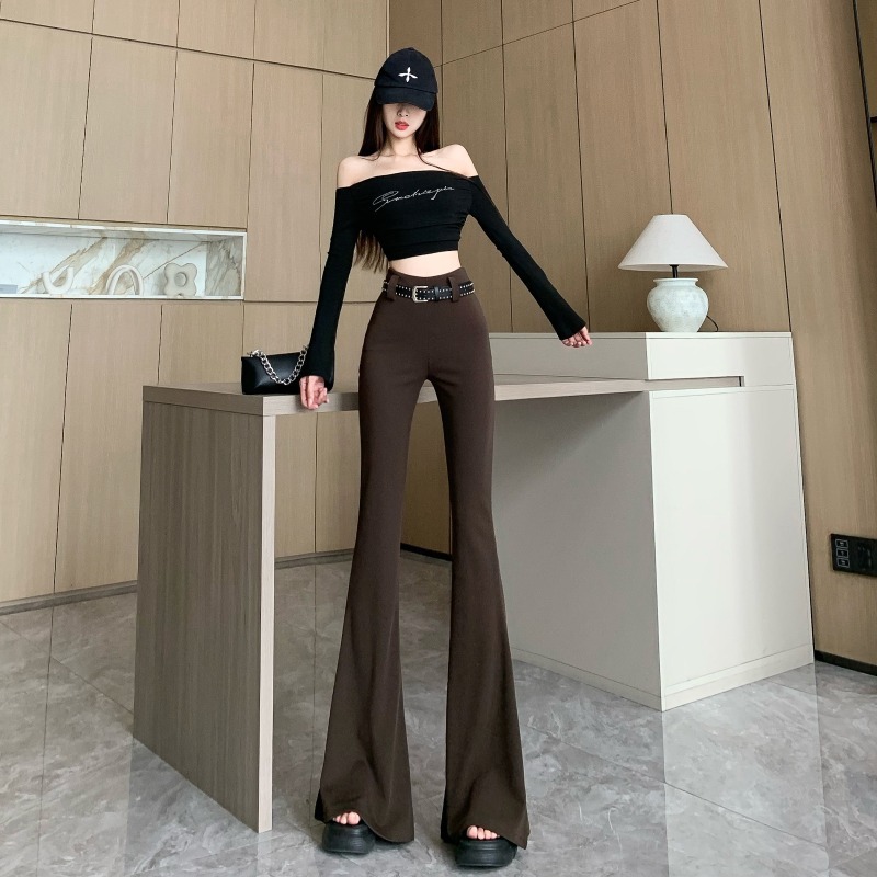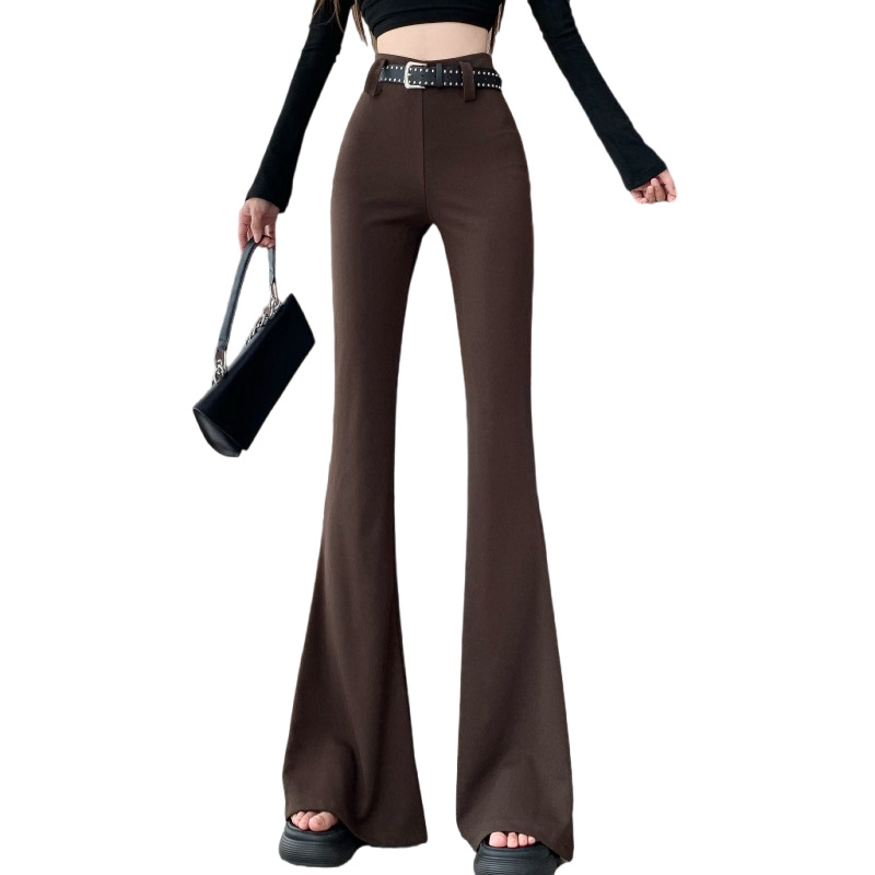 가을 마일 라드 레트로 스타일 다크 브라운 높은 허리 슬림 핏 딥 다운 폐열 플레어 바지 여성용 말굽 캐주얼 바지