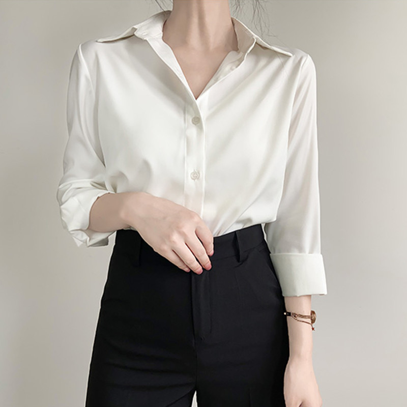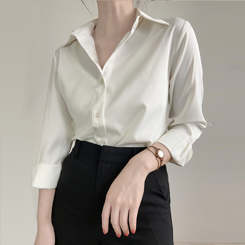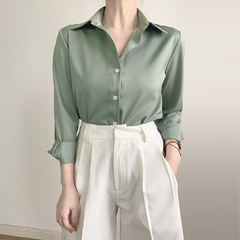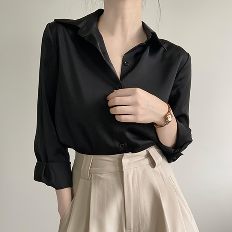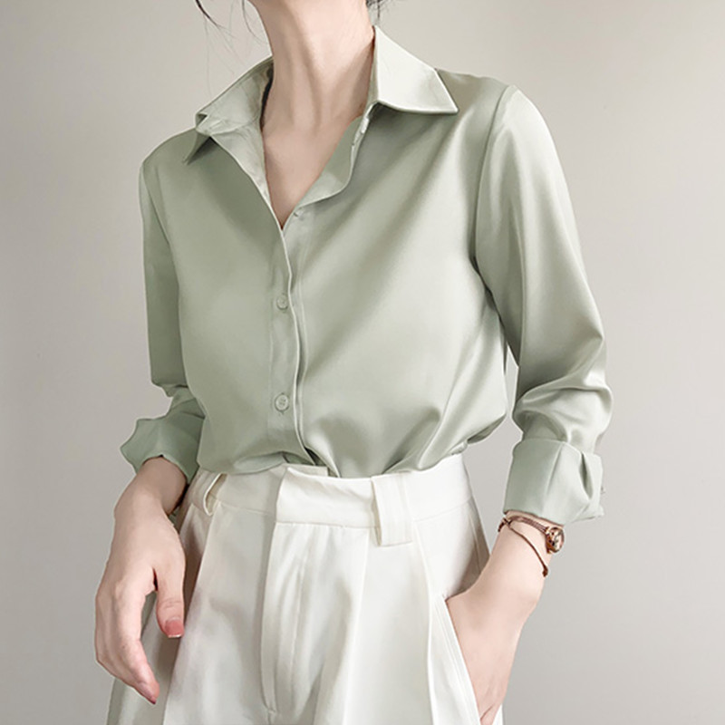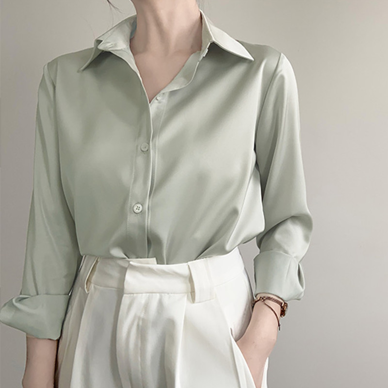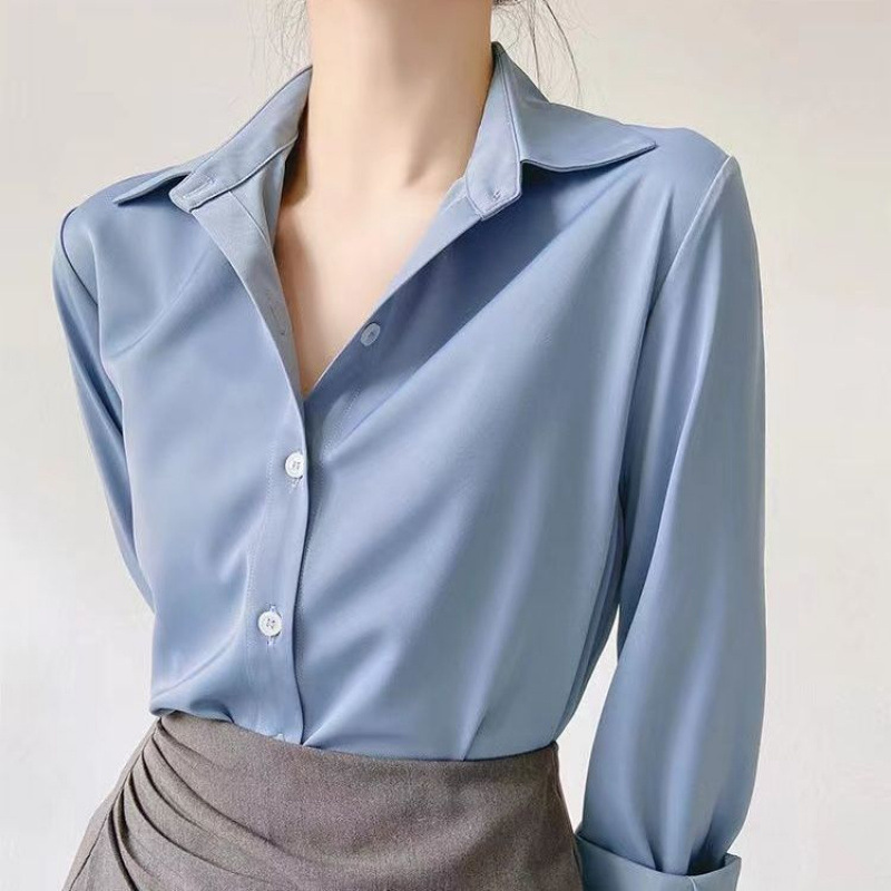 고급 우아한 새틴 전문 셔츠 여성 느슨한 게으른 홍콩 스타일 draped 디자인 틈새 탑스토어 가기
