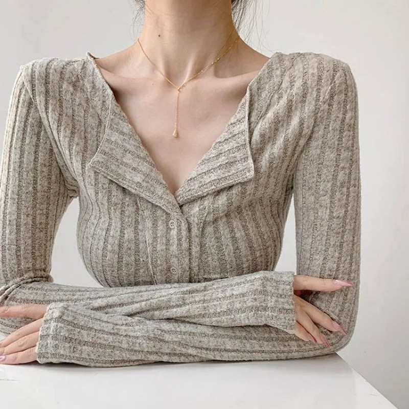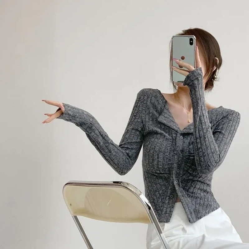 순수한 욕망 스타일 틈새 디자인 센스 칼라 싱글 브레스트 니트 카디건 여성의 가을 새로운 슬림 핏 타이트 허리 슬리밍 긴팔스토어 가기