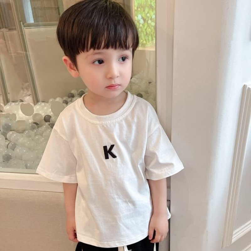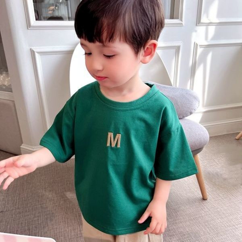 어린이 자수 간단한 반팔 서양식 소년 알파벳 순수 코튼 티셔츠 2025 여름 어린이 베이비 라운드 넥 셔츠