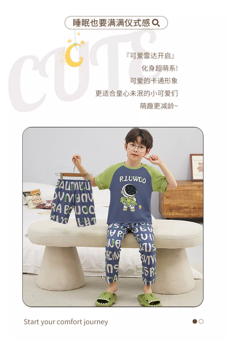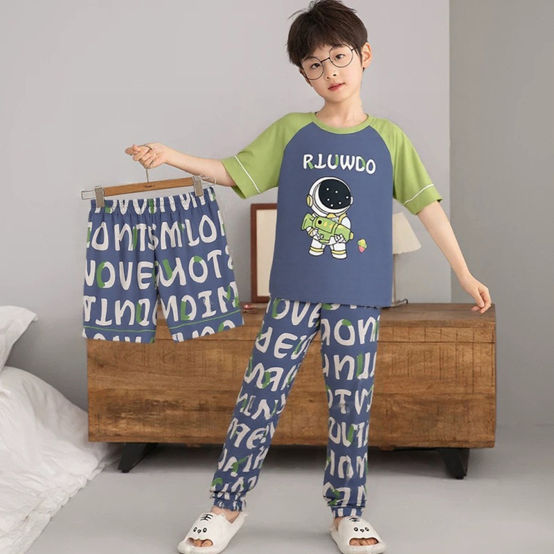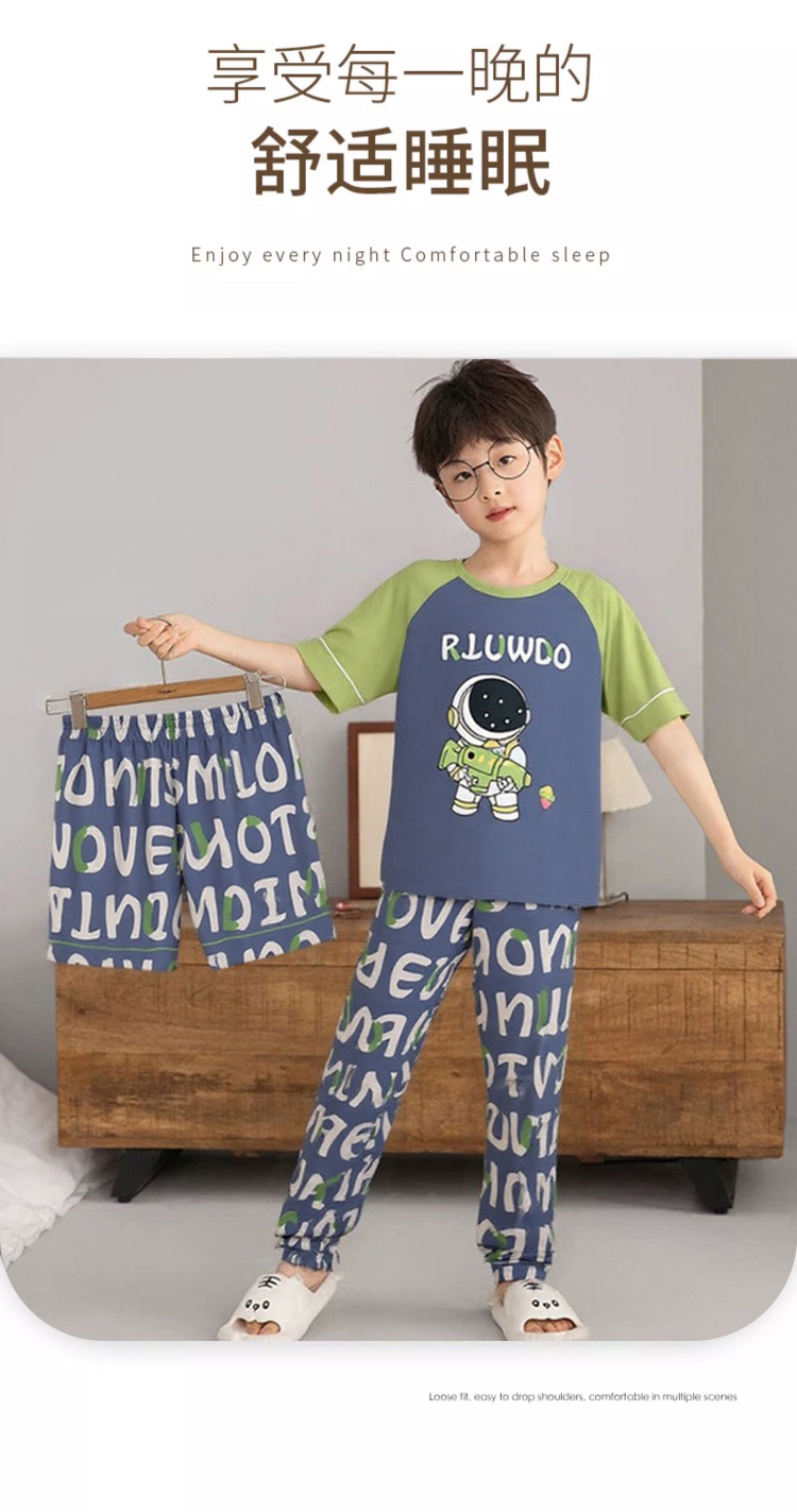 여름 어린이 잠옷 3 조각 귀여운 만화 짧은 소매 얇은 에어컨 소년 중 큰 소년 홈 의류스토어 가기