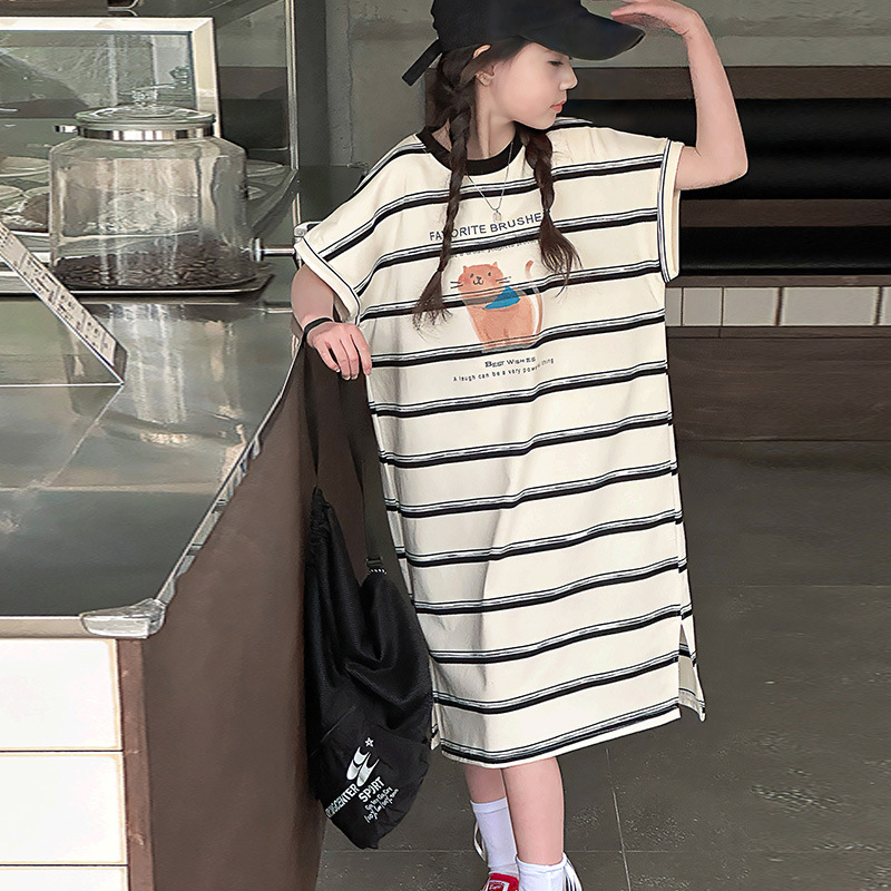 국경 간 소녀 여름 원피스 2025 새로운 스타일 중대형 어린이 긴 치마 둥근 목 어린이 줄무늬 치마스토어 가기