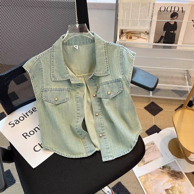 미국 빈티지 데님 코트 얇은 여성 여름 칼라 매니큐어 민소매 조끼 느슨한 슬리밍 최고