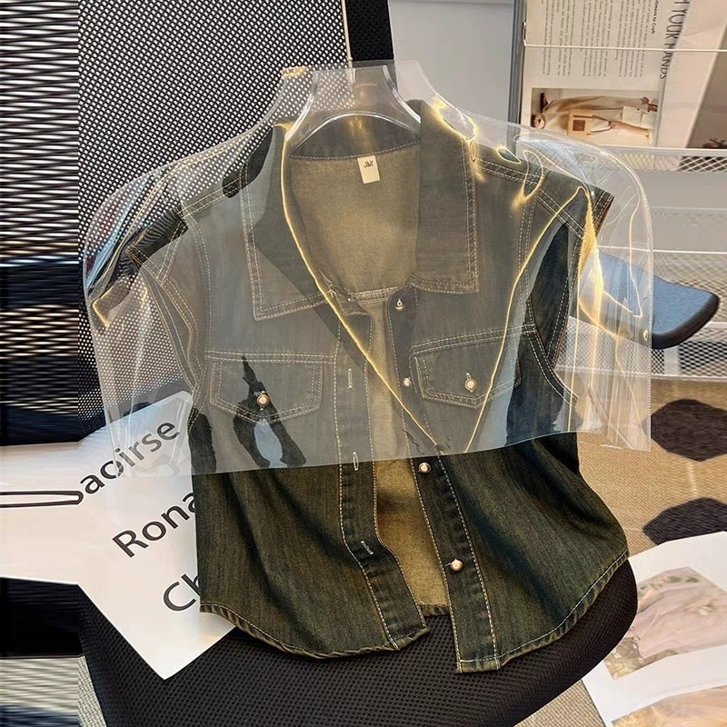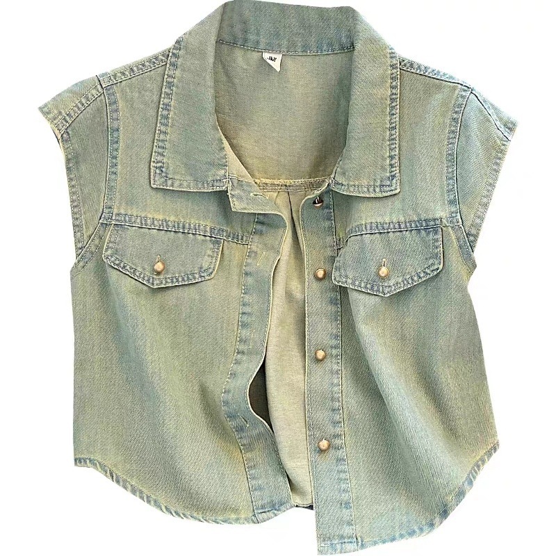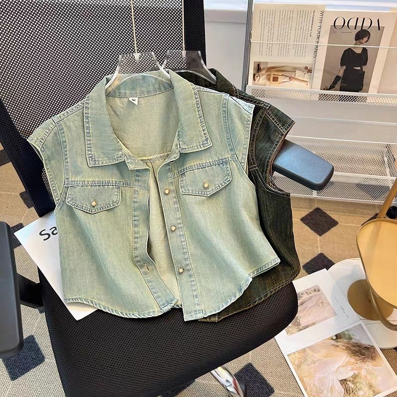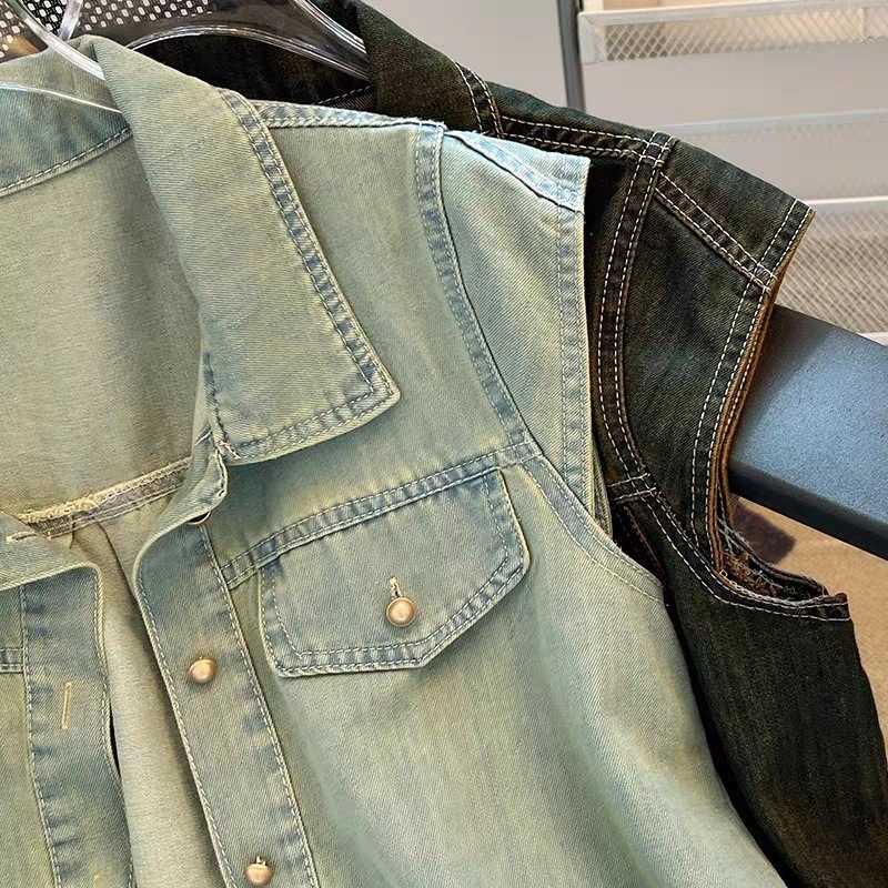 미국 빈티지 데님 코트 얇은 여성 여름 칼라 매니큐어 민소매 조끼 느슨한 슬리밍 최고스토어 가기