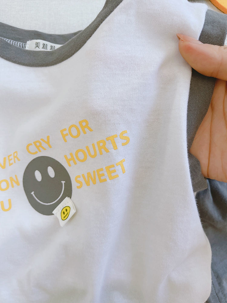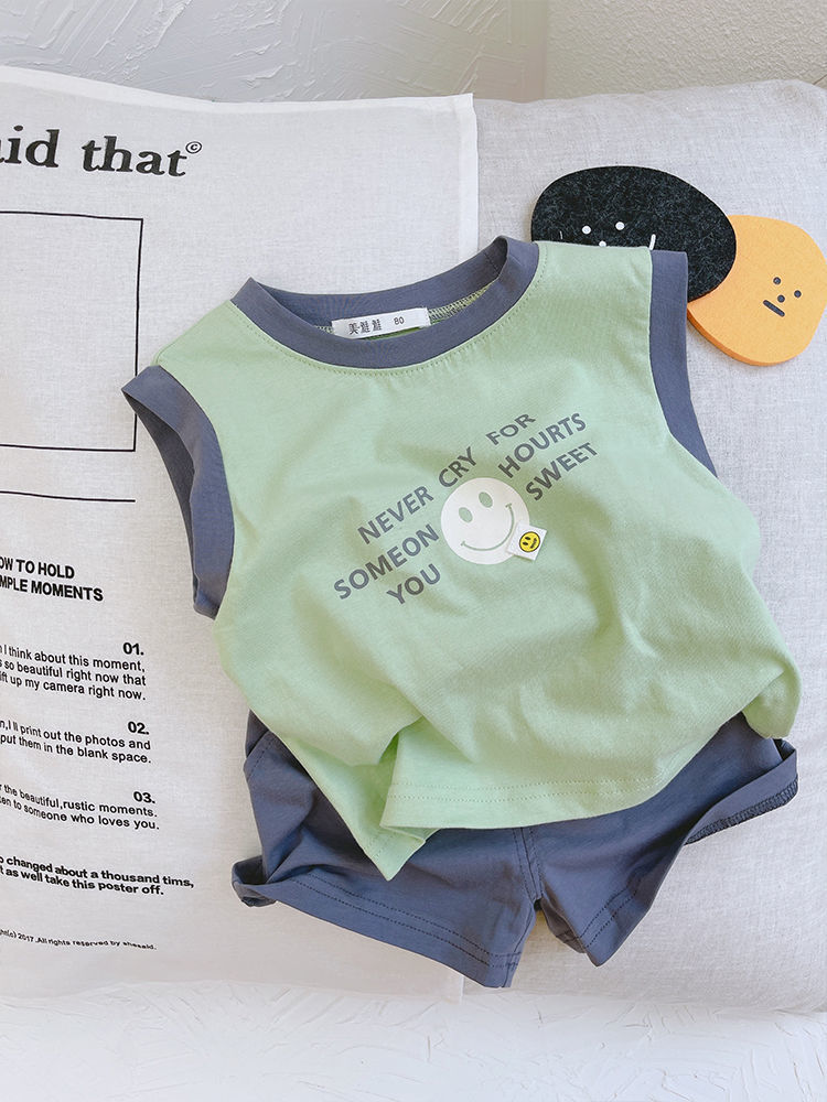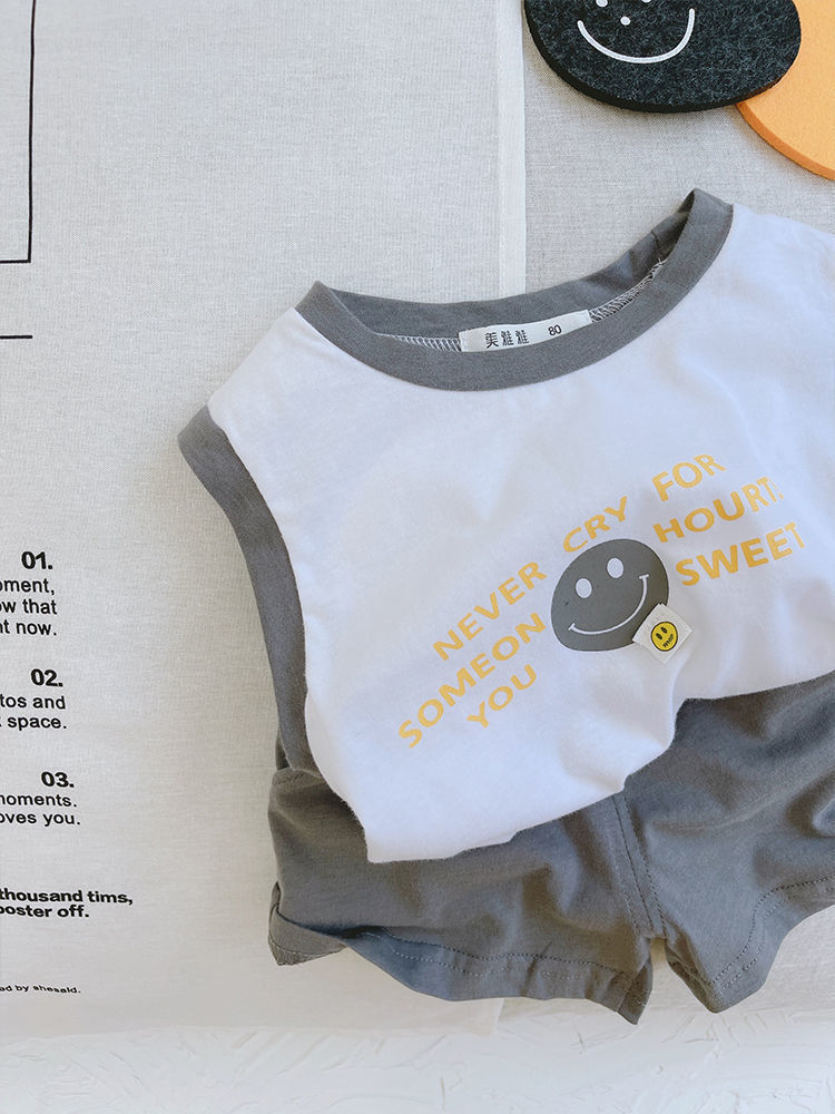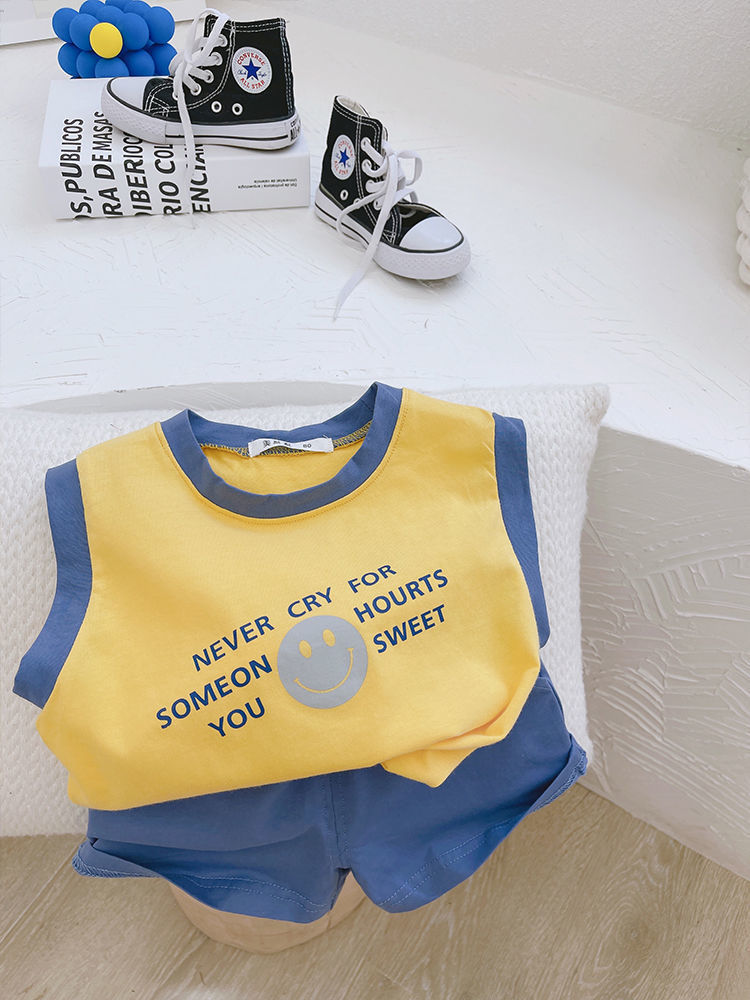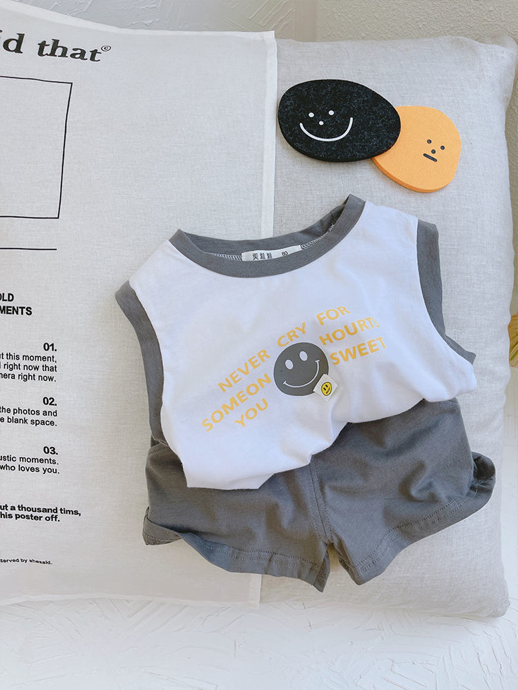퓨어 코튼 인 한국 스타일 어린이 스마일리 민소매 티셔츠 조끼 반바지 세트 소년 양스토어 가기