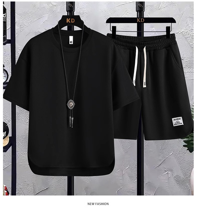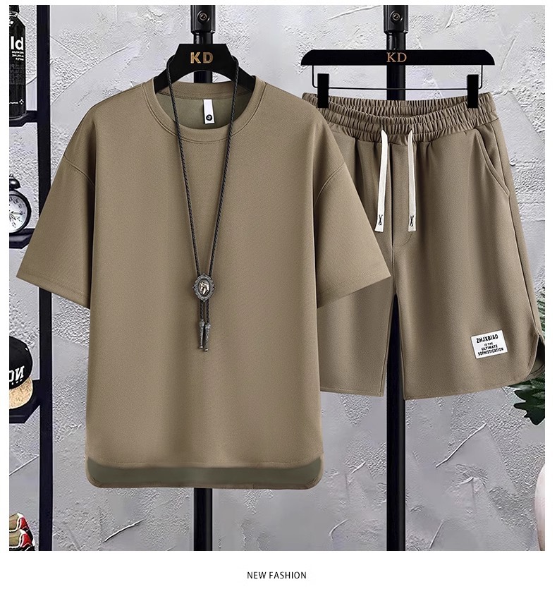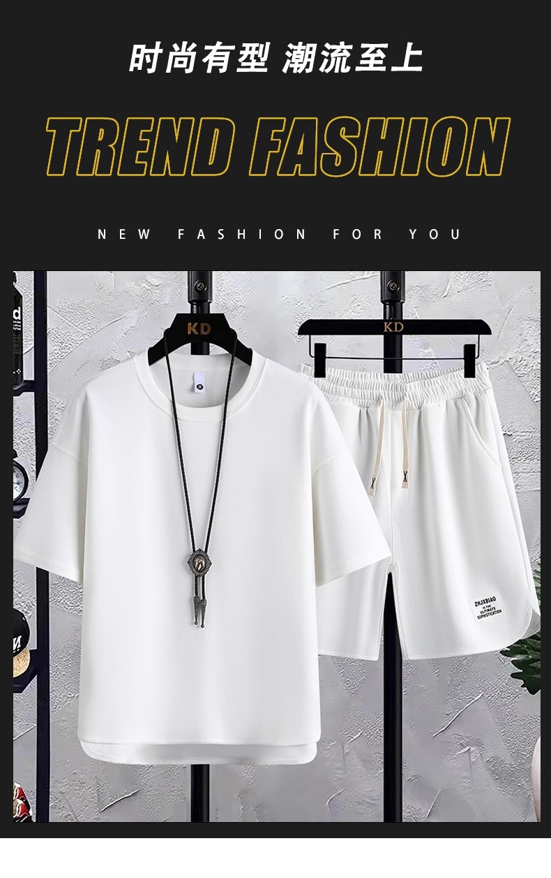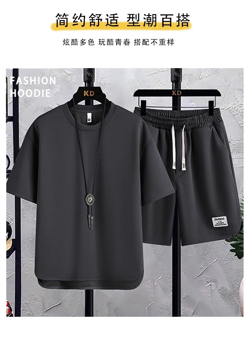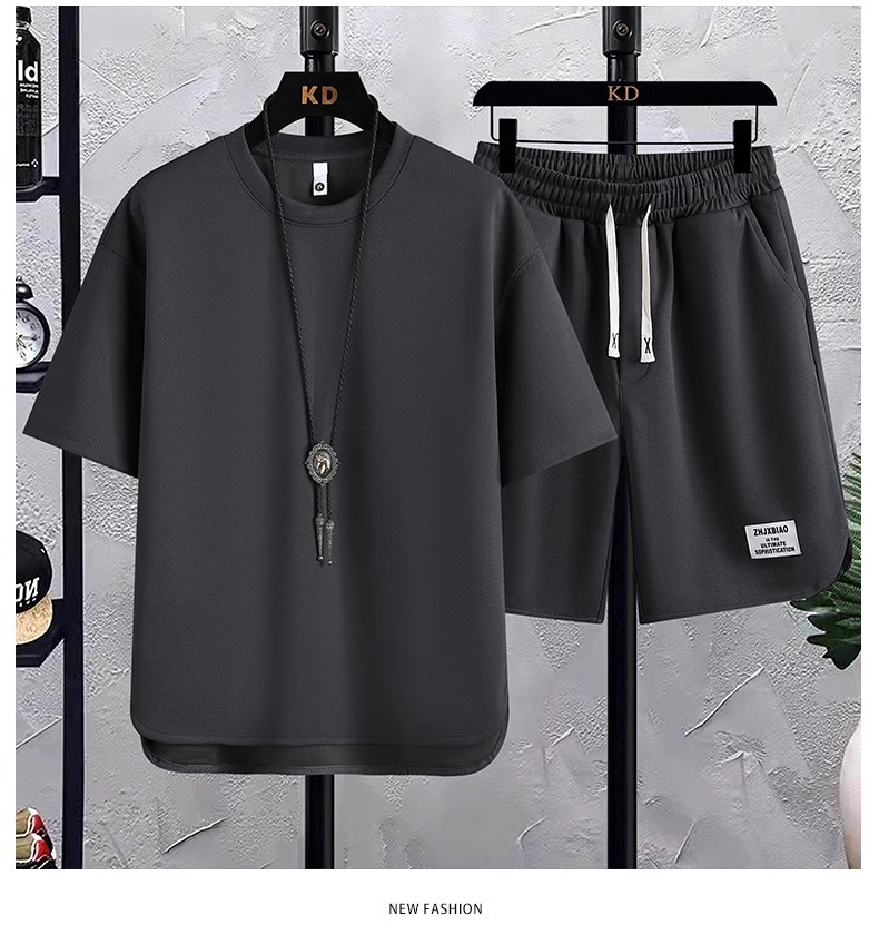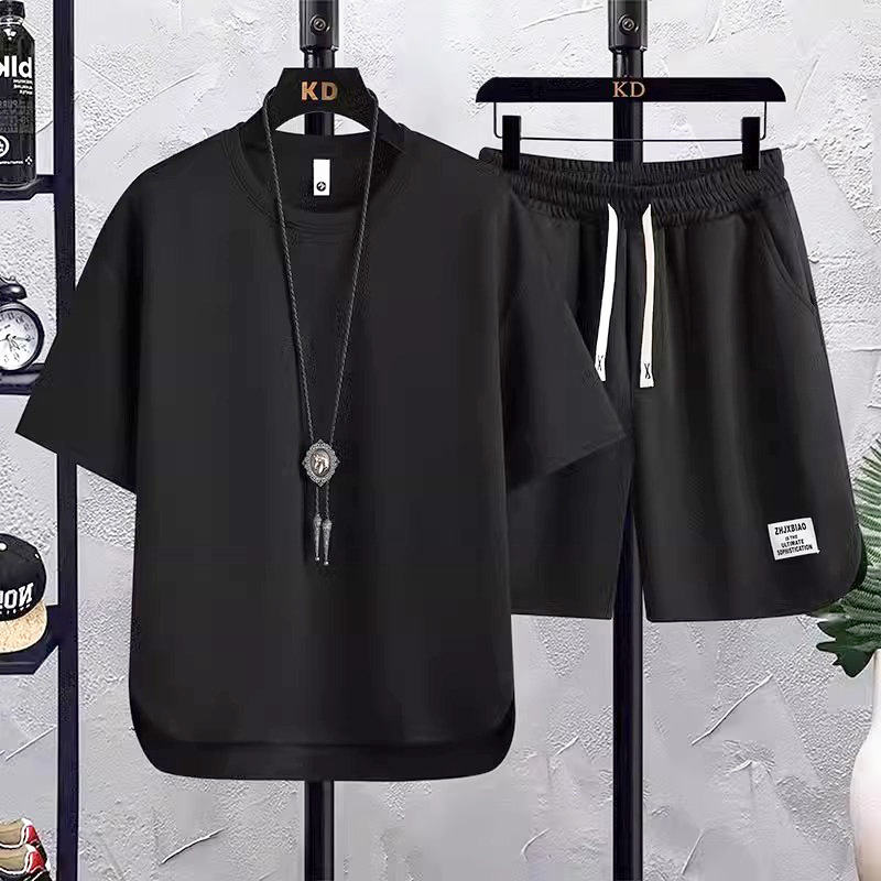 여름 새로운 패션 세트 남성 아이스 실크 짧은 소매 티셔츠 반바지 스포츠 레저 투피스 대외 무역 국경 도매스토어 가기